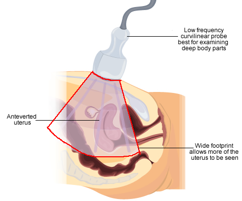 The uterus and ovaries lie deep in the female pelvis. The ultrasound sound waves will need to pass through several normal parts of the body before reaching the uterus and ovaries.