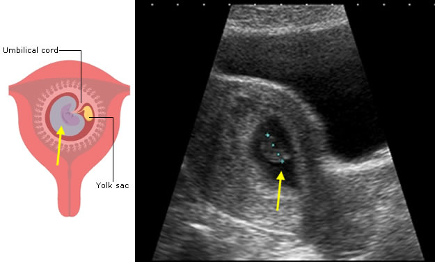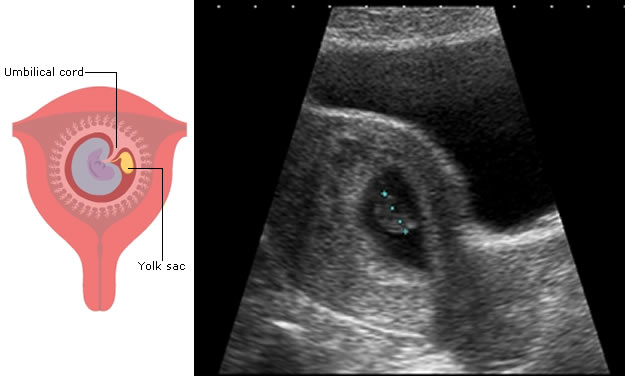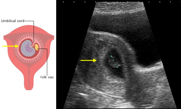 The first feature to be seen on ultrasound is the gestation sac, which will become the amniotic and chorionic sacs. These contain fluid and are seen as black on ultrasound.