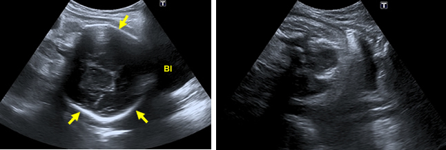 In the left image, you can see the bones of the skull of the fetus in the lower part of the uterus next to the bladder (bl). In the right image, the baby is in breech presentation. You can see the outline of the baby’s bottom next to the maternal bladder (bl).