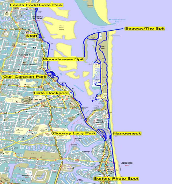 Home to Turnaround Pt down to Surfers via GC600 Park to Robbies Cafe to The Spit (both ends) then back through GC600 Park back to the Turnaround Pt and finally back Home about 60kms.