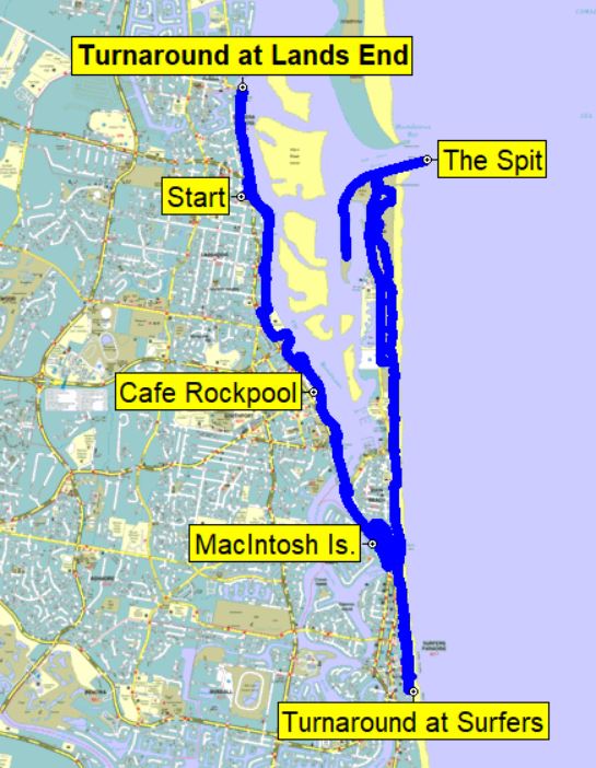 Being Sunday there were pedrestrians everywhere. Rode to the end of the Broadwater Spit then around the shared path that surround the Doug Jennings park. Back along Seaworld Dve and did a lap at MacIntosh Island before stopping at Cafe Rockpool for a coffee. After coffee, I headed home. Another brilliant ride.