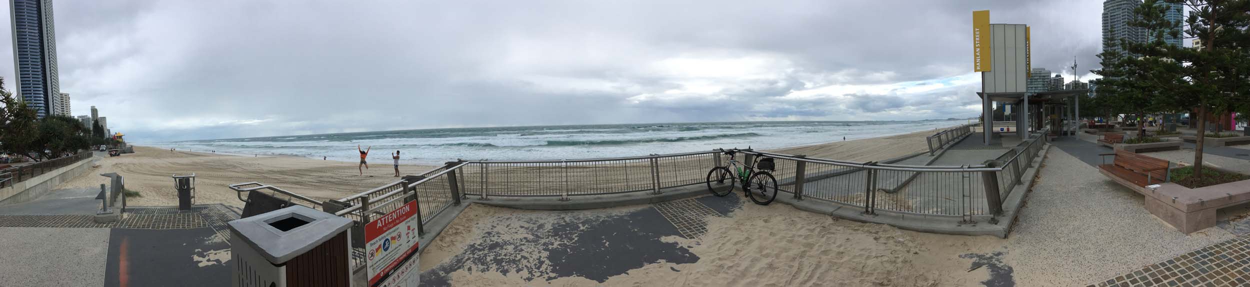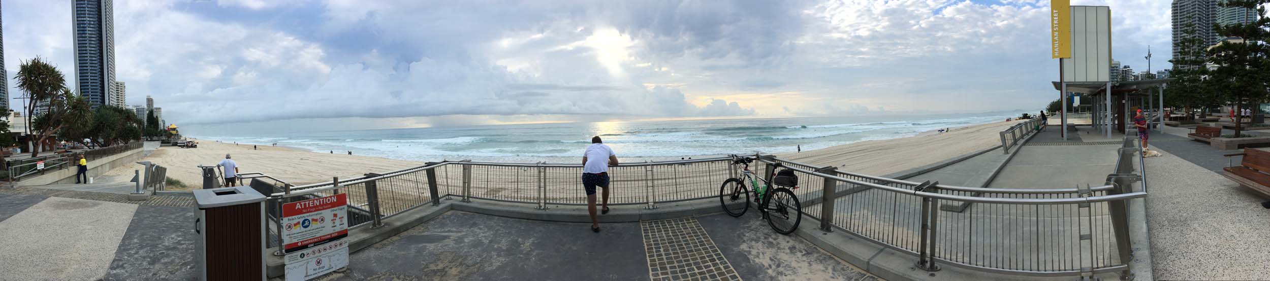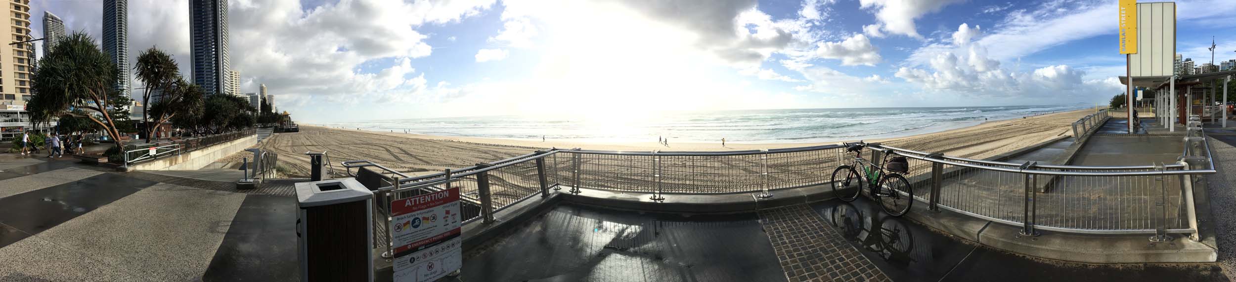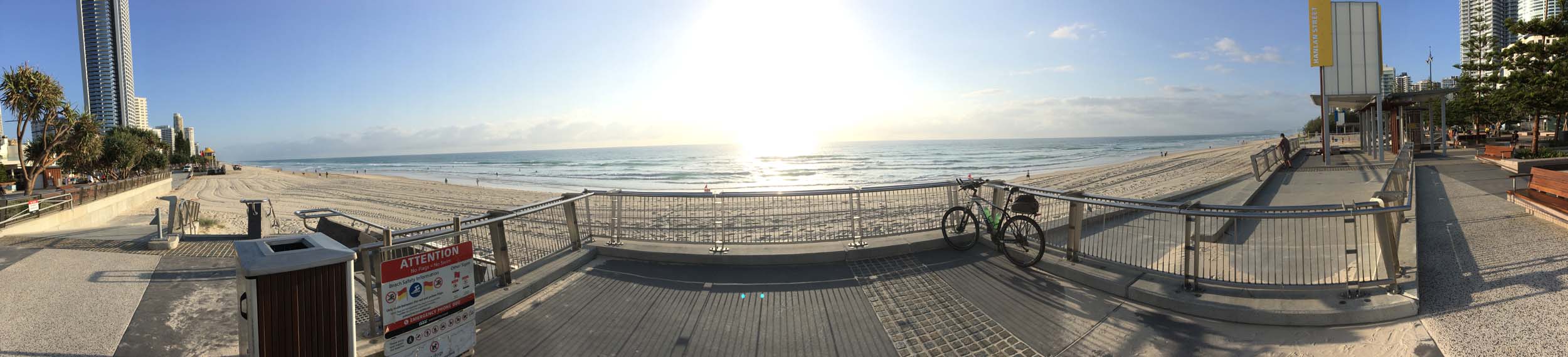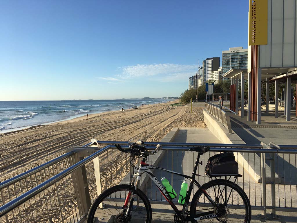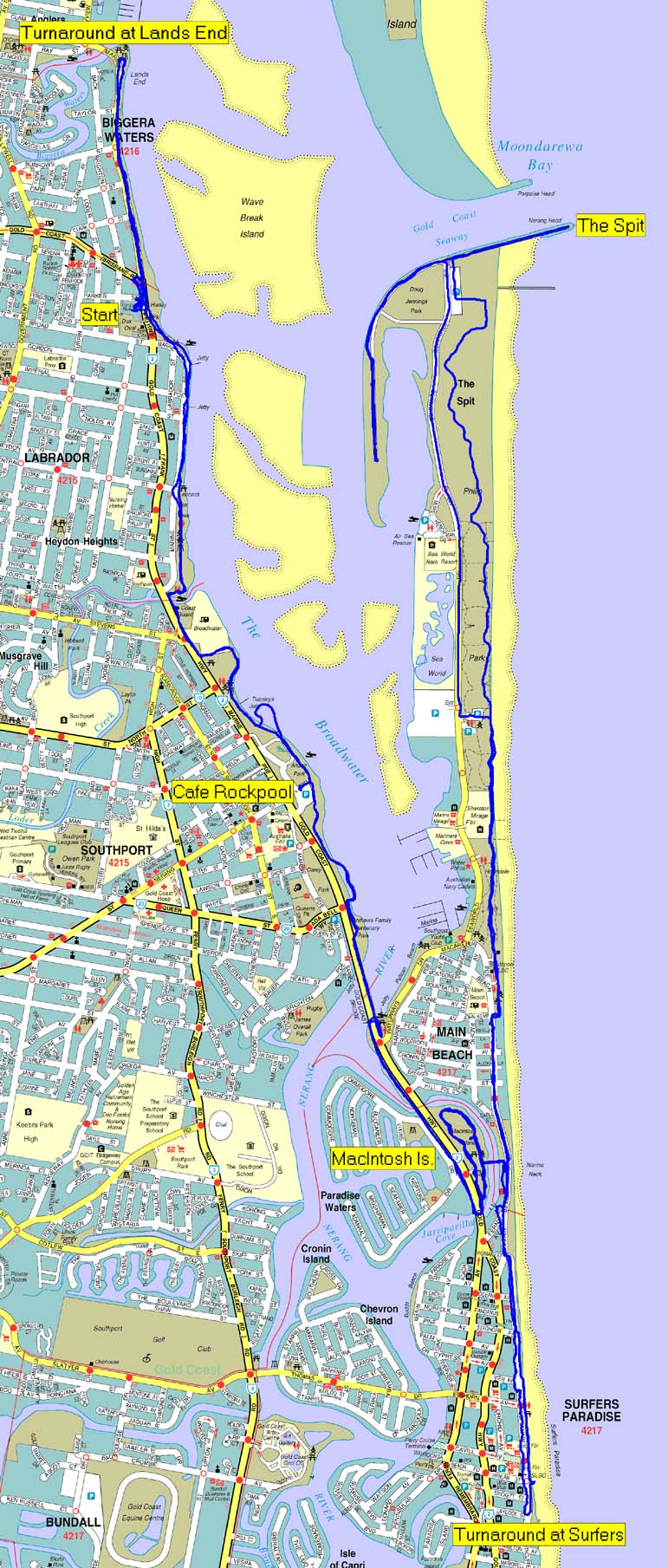 I left at 7:15am. I rode my normal Surfers/Spit via MacIntosh Park route to Broadbeach.