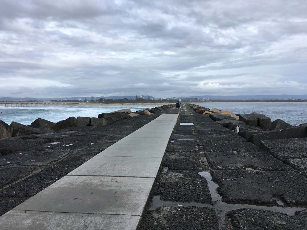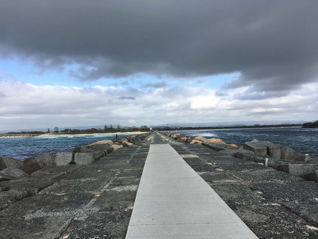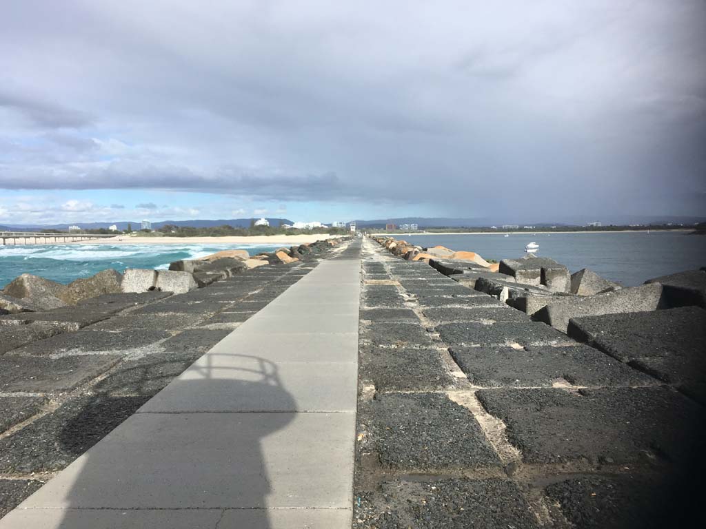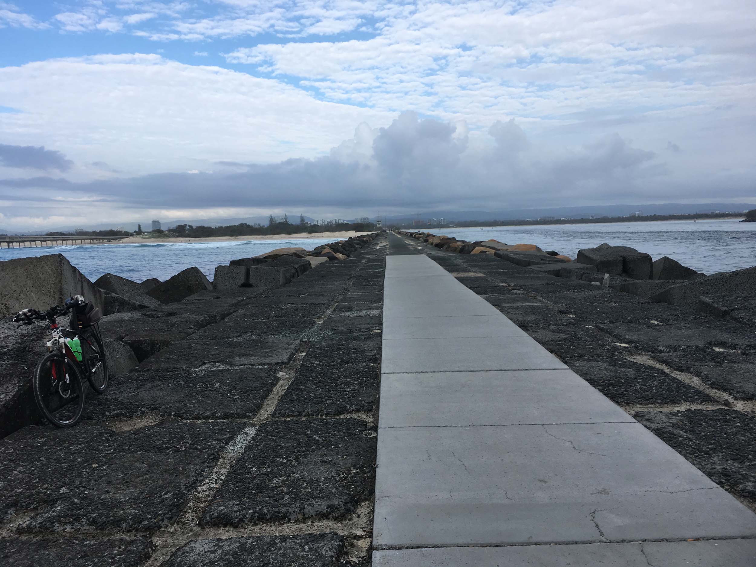 I rode back along the Esplanade, to the Southport SLSC, continuing along the Shared path which turns into the gravel Federation Walk. As it was raining, I sat at the end of the Seaward Spit and ate my 2 bananas. They were YUMMA.