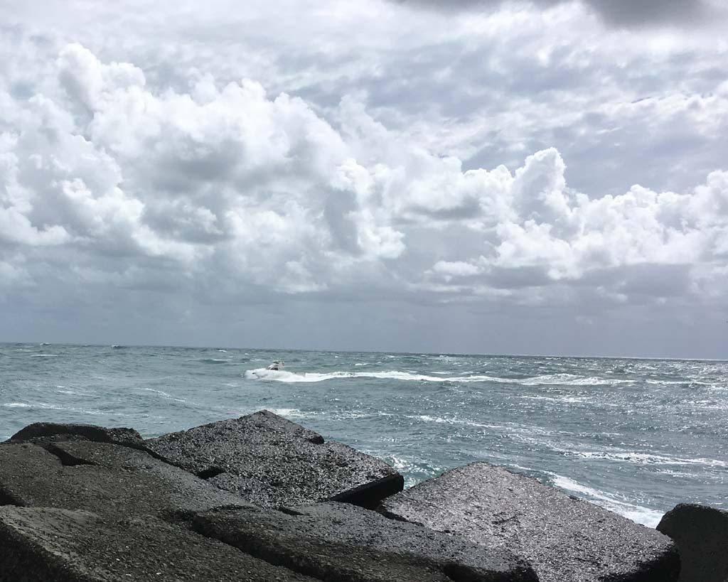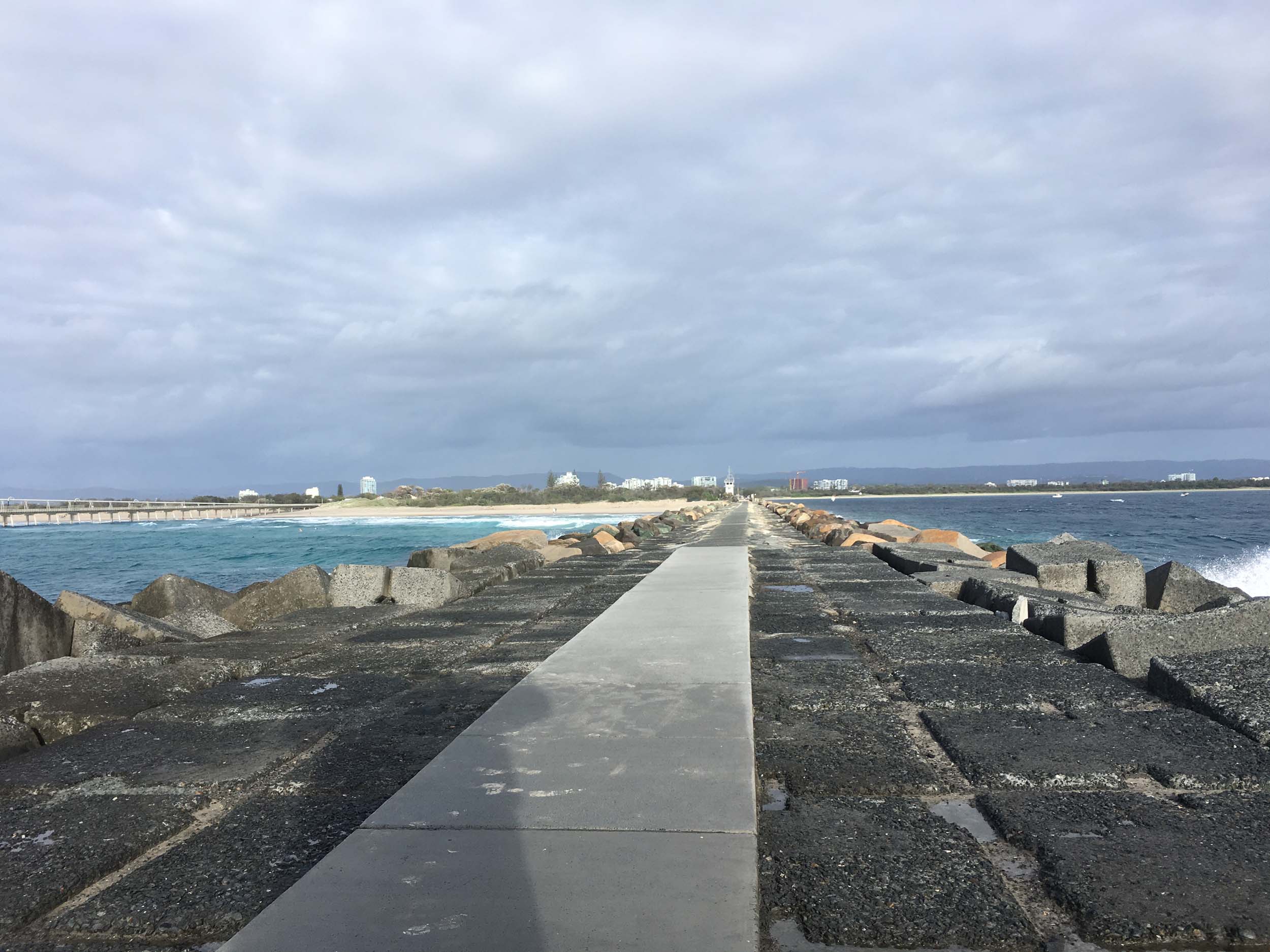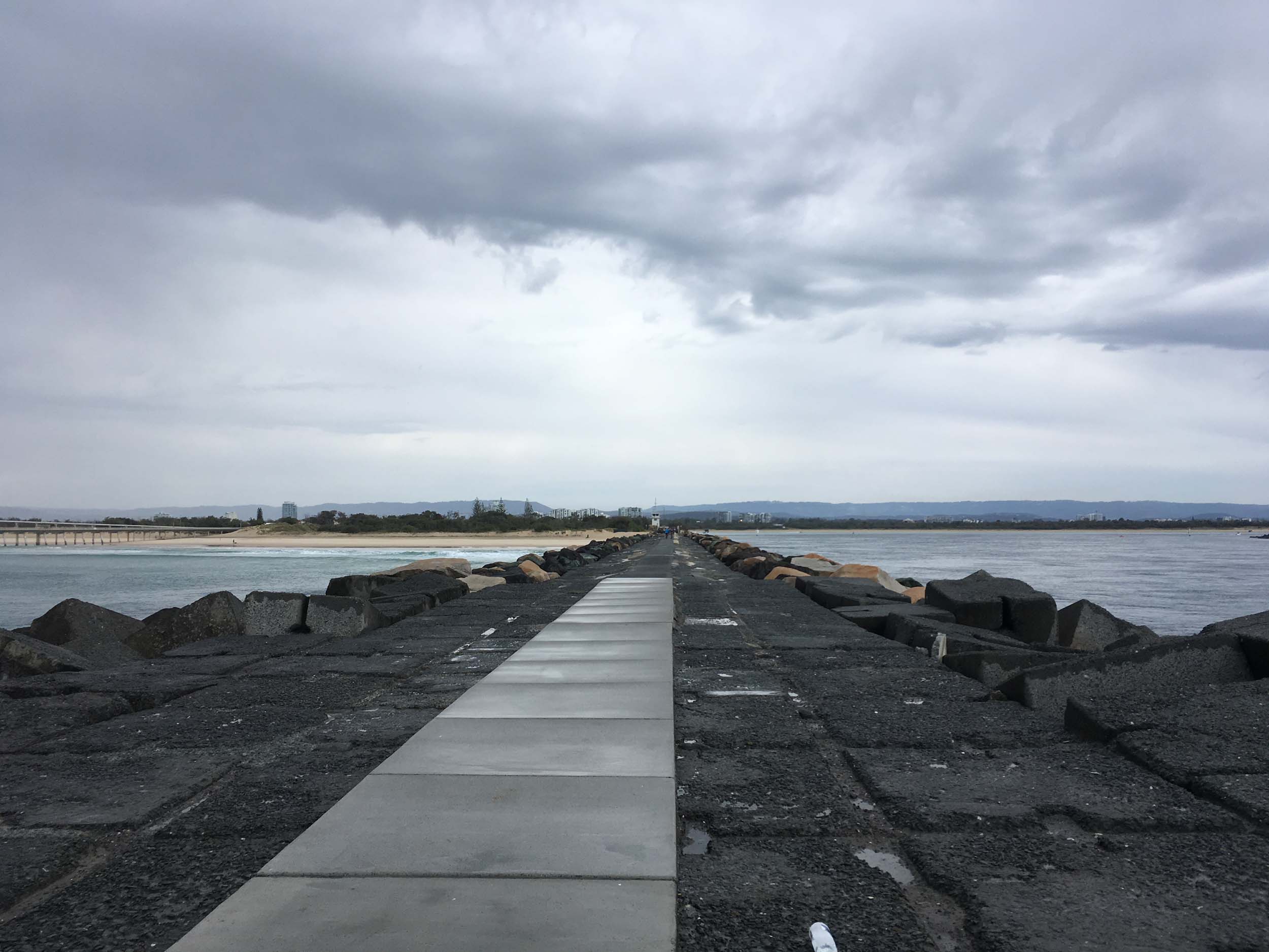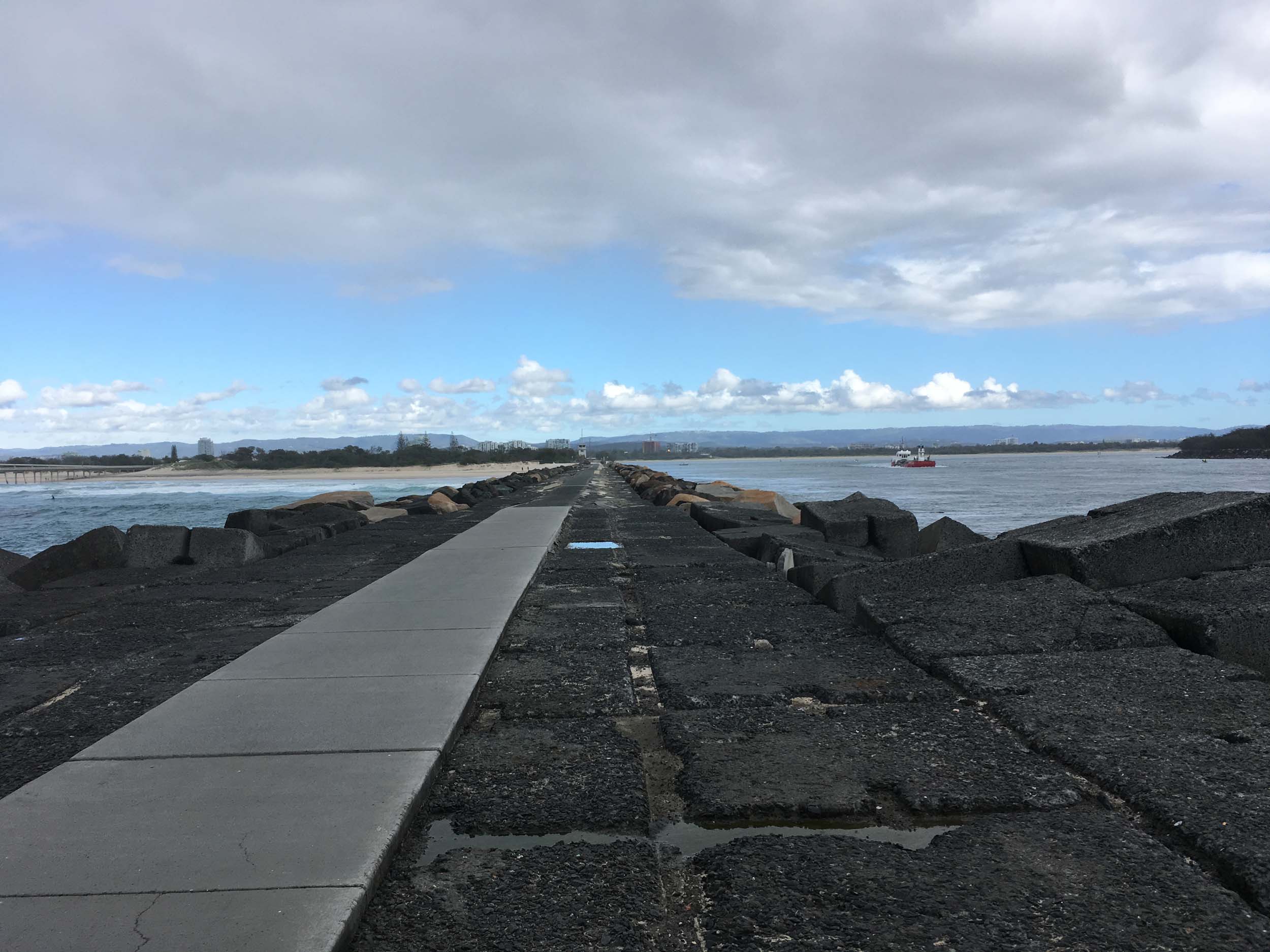 I rode back along the Esplanade, to the Southport SLSC, continuing along the Shared path which turns into the gravel Federation Walk. As it was raining, I sat at the end of the Seaward Spit and ate my 2 bananas. They were YUMMA.