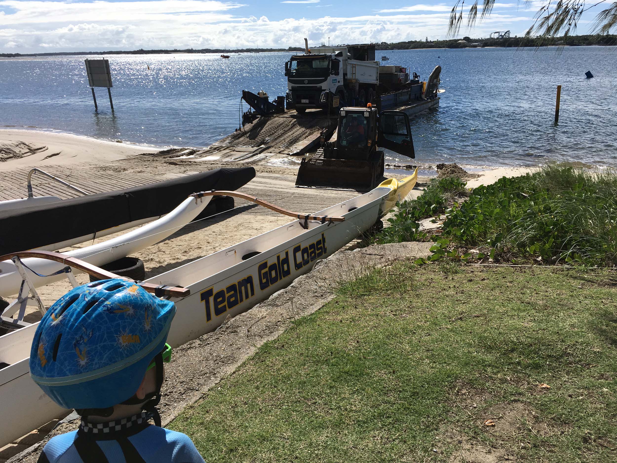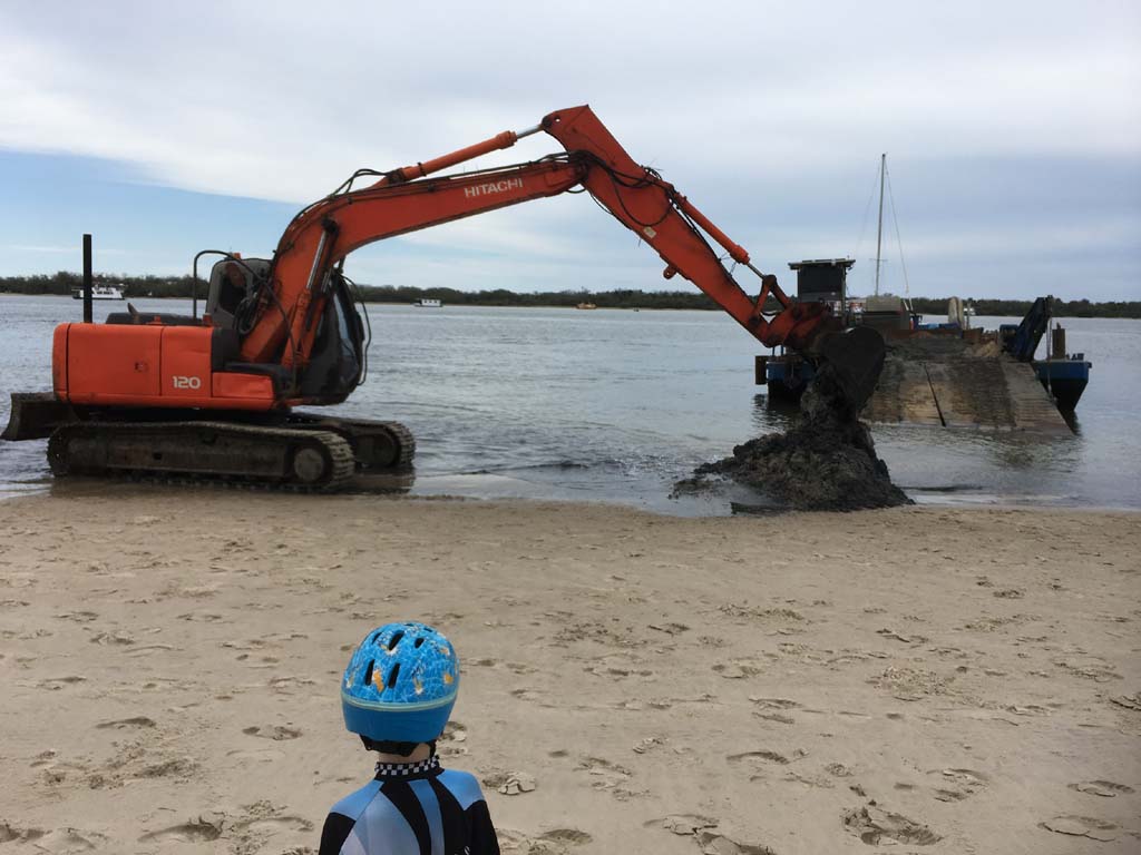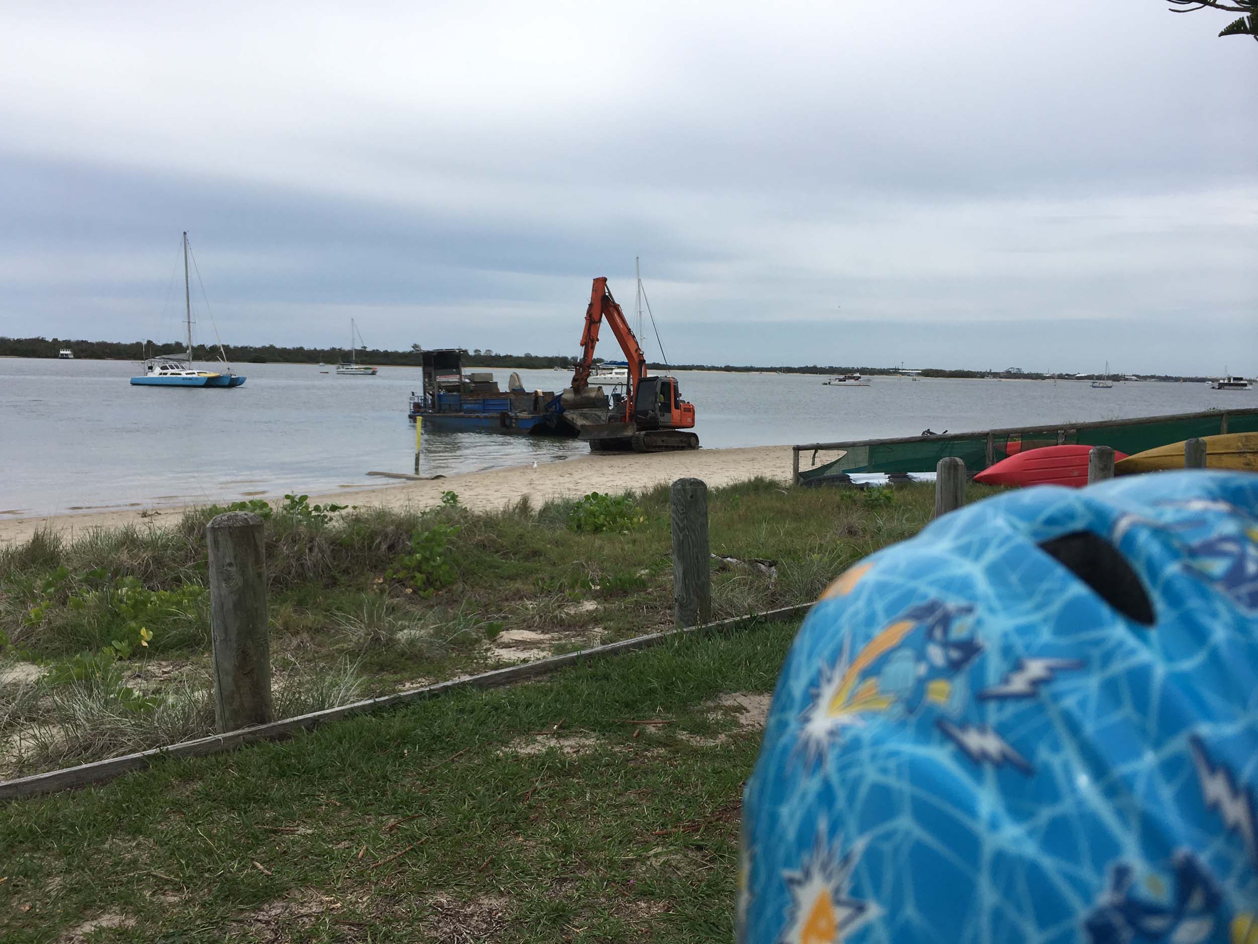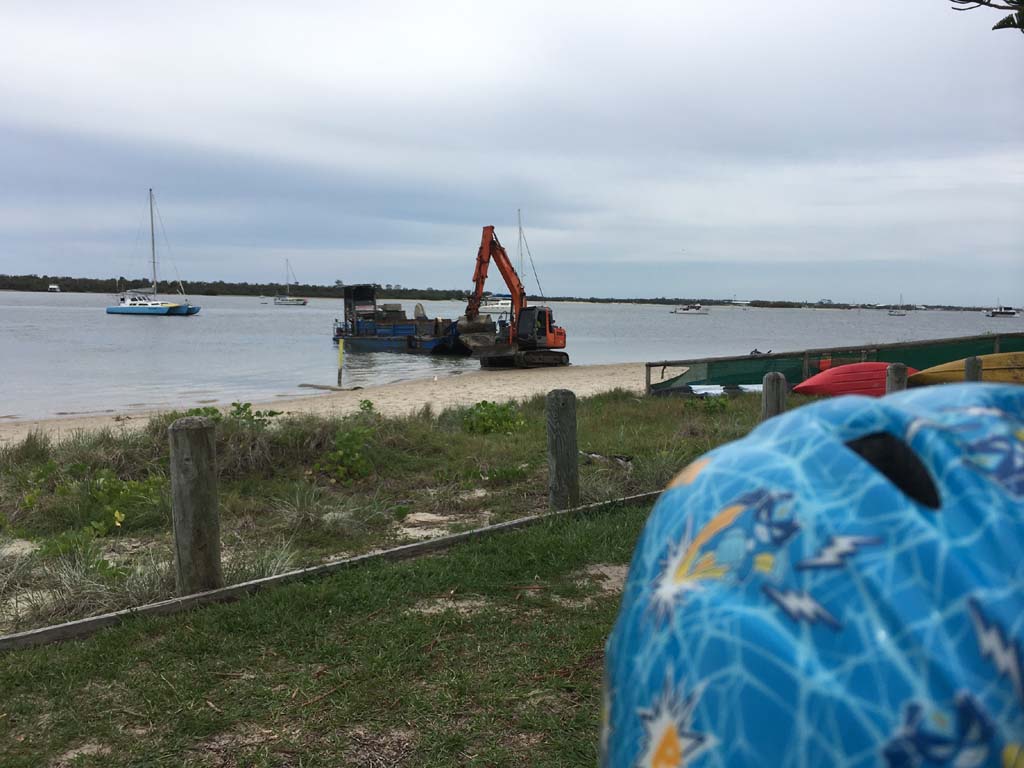 We left home at 10:35am and got onto the shared path BUT immediately my plans were shattered. Just in front of us was Bob the Bobcat sitting on his lonesome on the edge of the Broadwater and about 100 meters further along was Digger and Barge, actually working. I asked Mase if he wanted to stop and watch. Naturally, he did, SO we found a seat very close and made ourselves comfy. We watched Digger drive off the barge onto the beach and start clearing some mud from a large drain. I thought that would take him awhile, so we left Bob and Barge and headed to our turnaround point, hoping to see the real big machinery in action, but they were having morning tea. So we went to the playground about 50 meters from them. After tiring of that playground we headed back to Barge but unfortunately Digger was already aboard and they were motoring across the Broadwater.