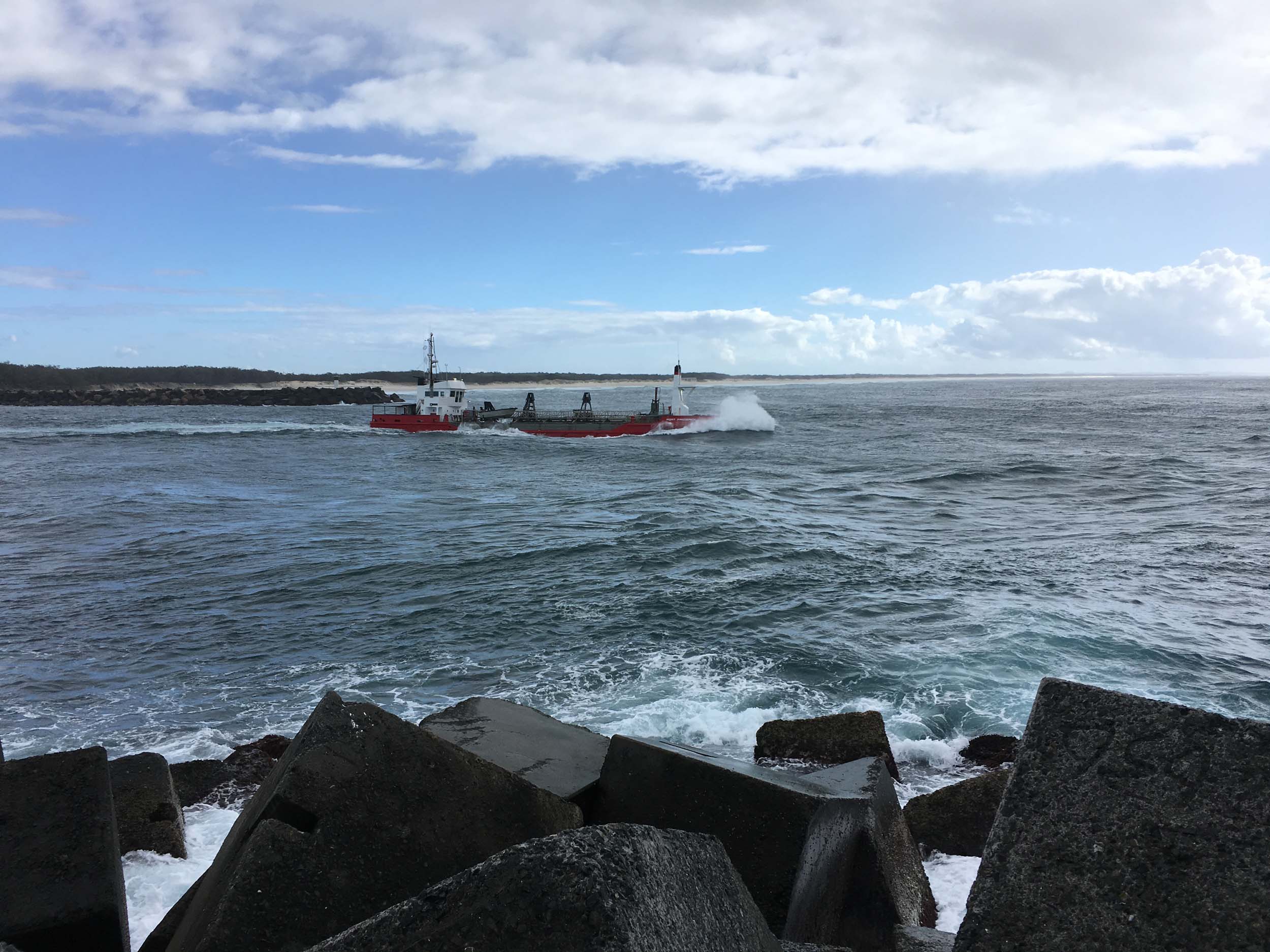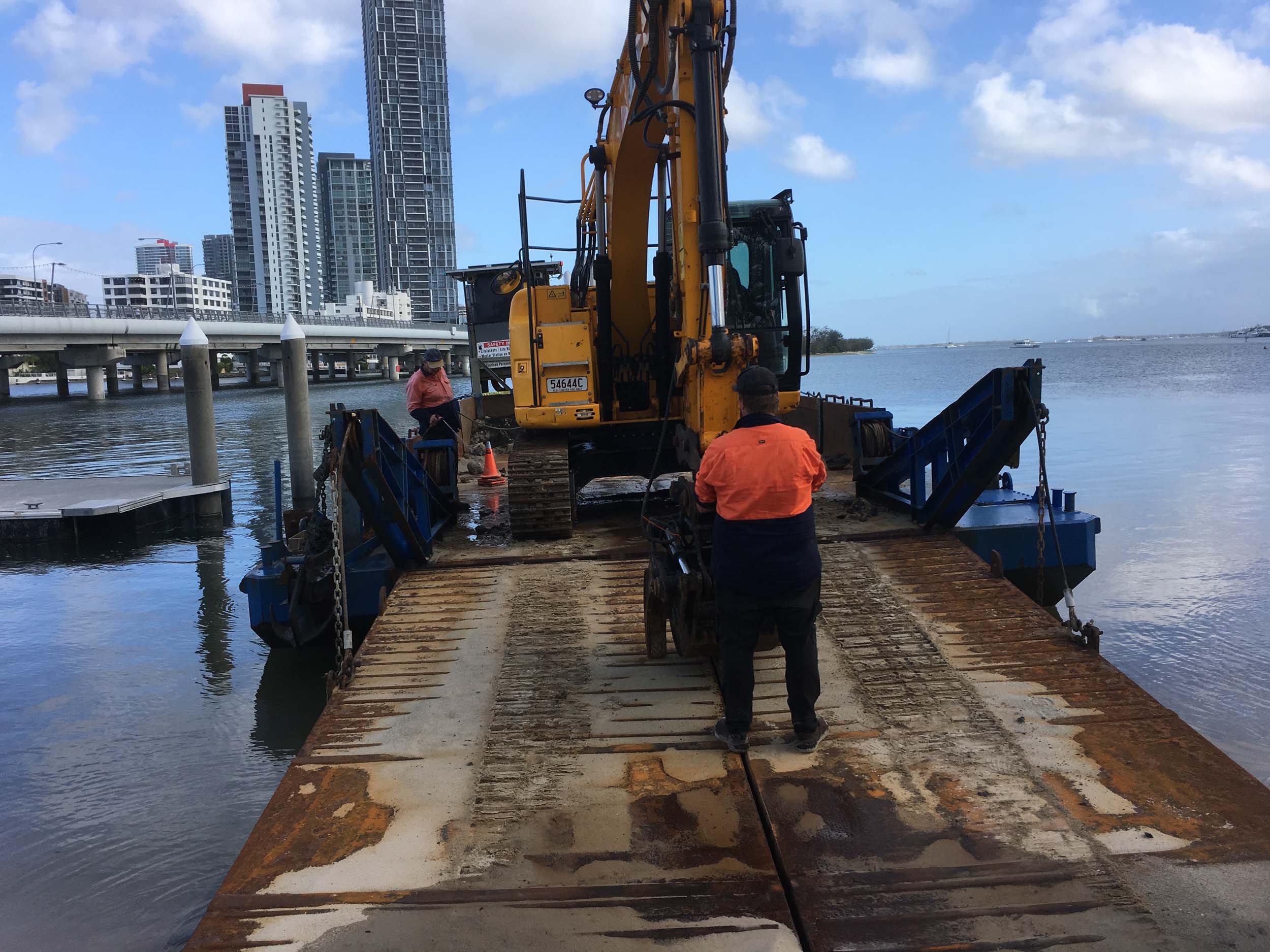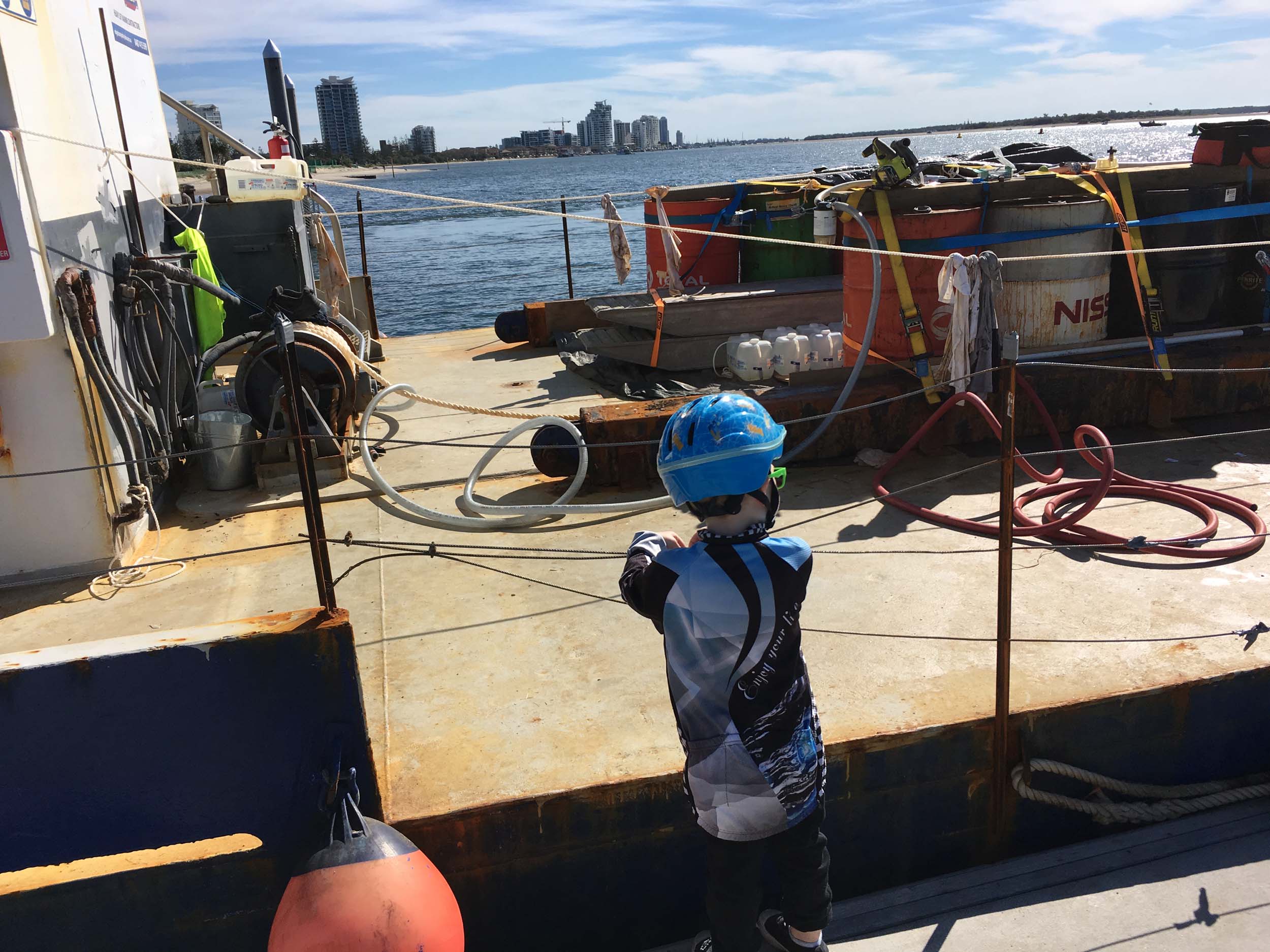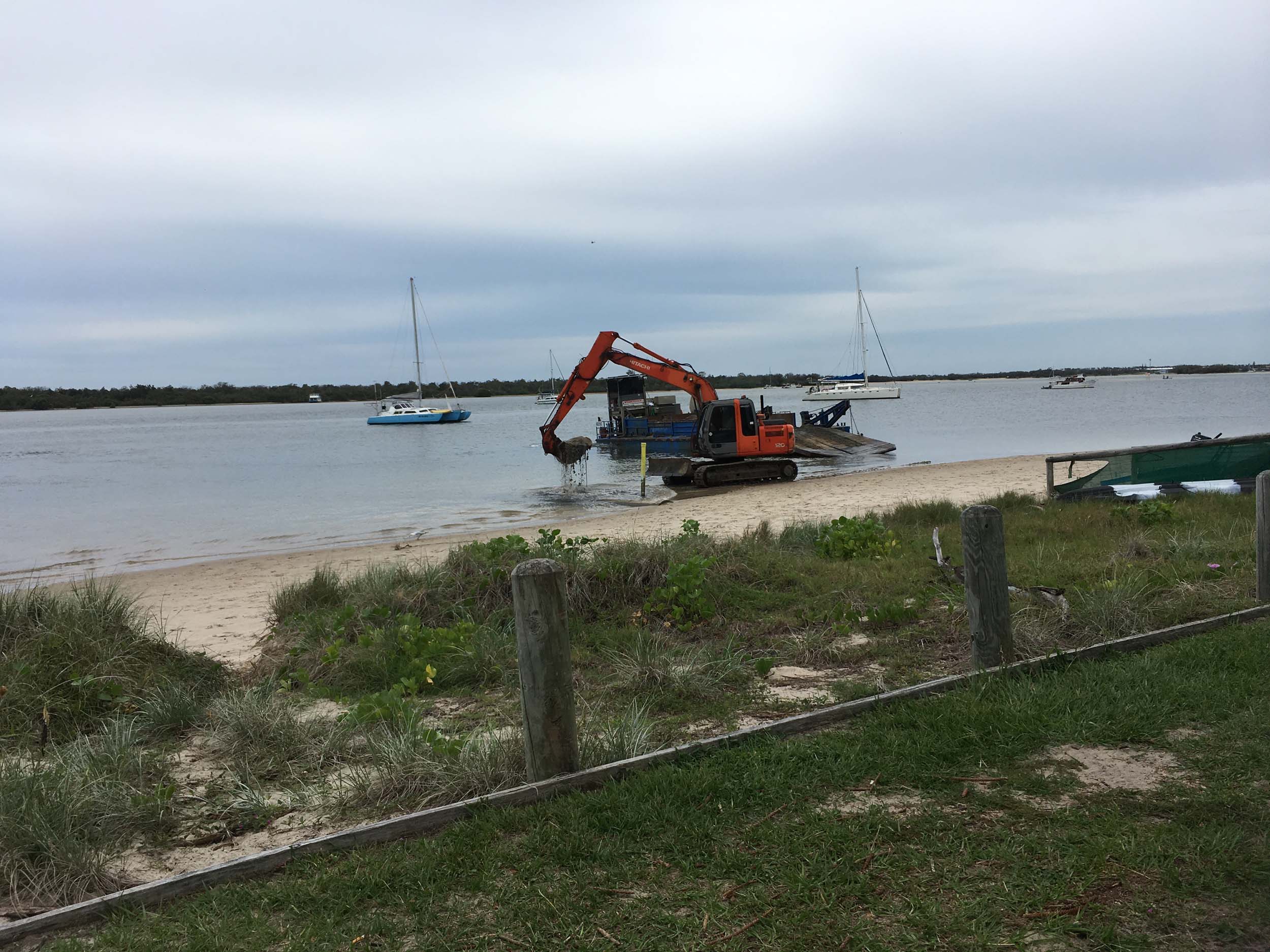 We left home at 10:35am and got onto the shared path BUT immediately my plans were shattered. Just in front of us was Bob the Bobcat sitting on his lonesome on the edge of the Broadwater and about 100 meters further along was Digger and Barge, actually working. I asked Mase if he wanted to stop and watch. Naturally, he did, SO we found a seat very close and made ourselves comfy. We watched Digger drive off the barge onto the beach and start clearing some mud from a large drain. I thought that would take him awhile, so we left Bob and Barge and headed to our turnaround point, hoping to see the real big machinery in action, but they were having morning tea. So we went to the playground about 50 meters from them. After tiring of that playground we headed back to Barge but unfortunately Digger was already aboard and they were motoring across the Broadwater.
