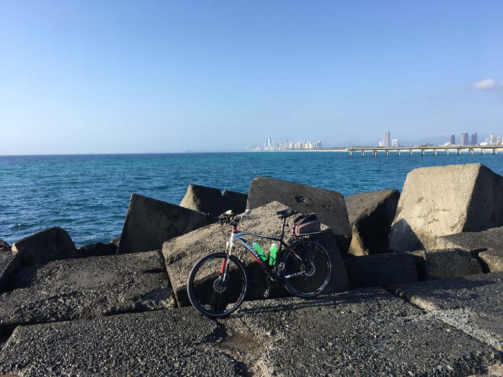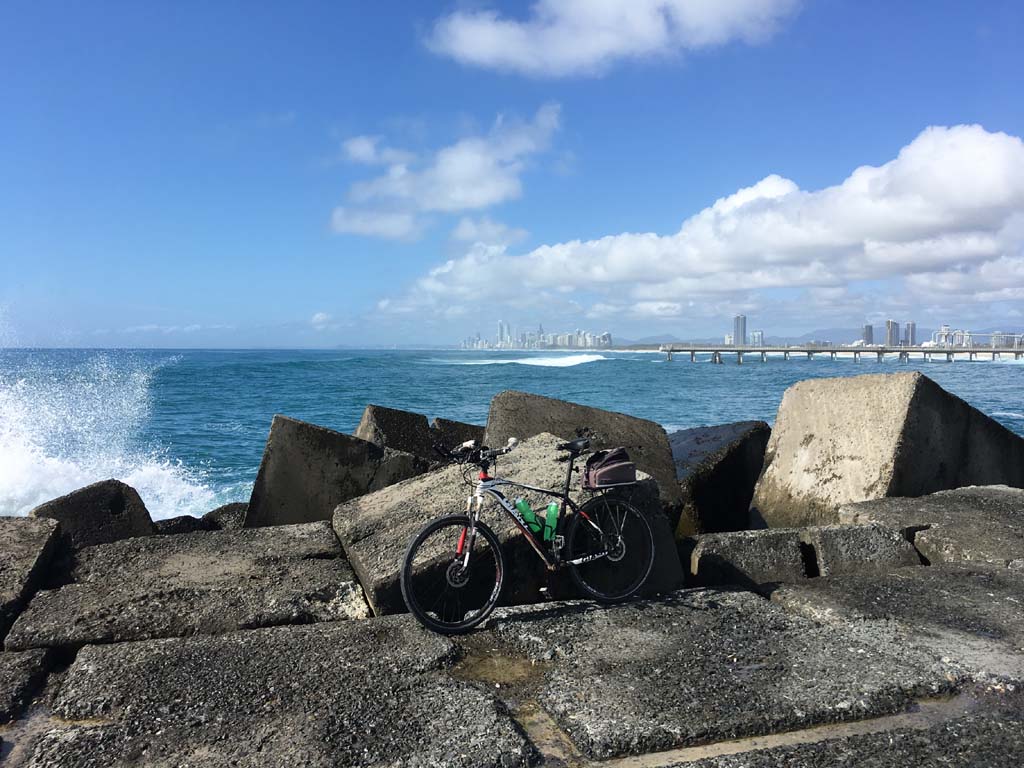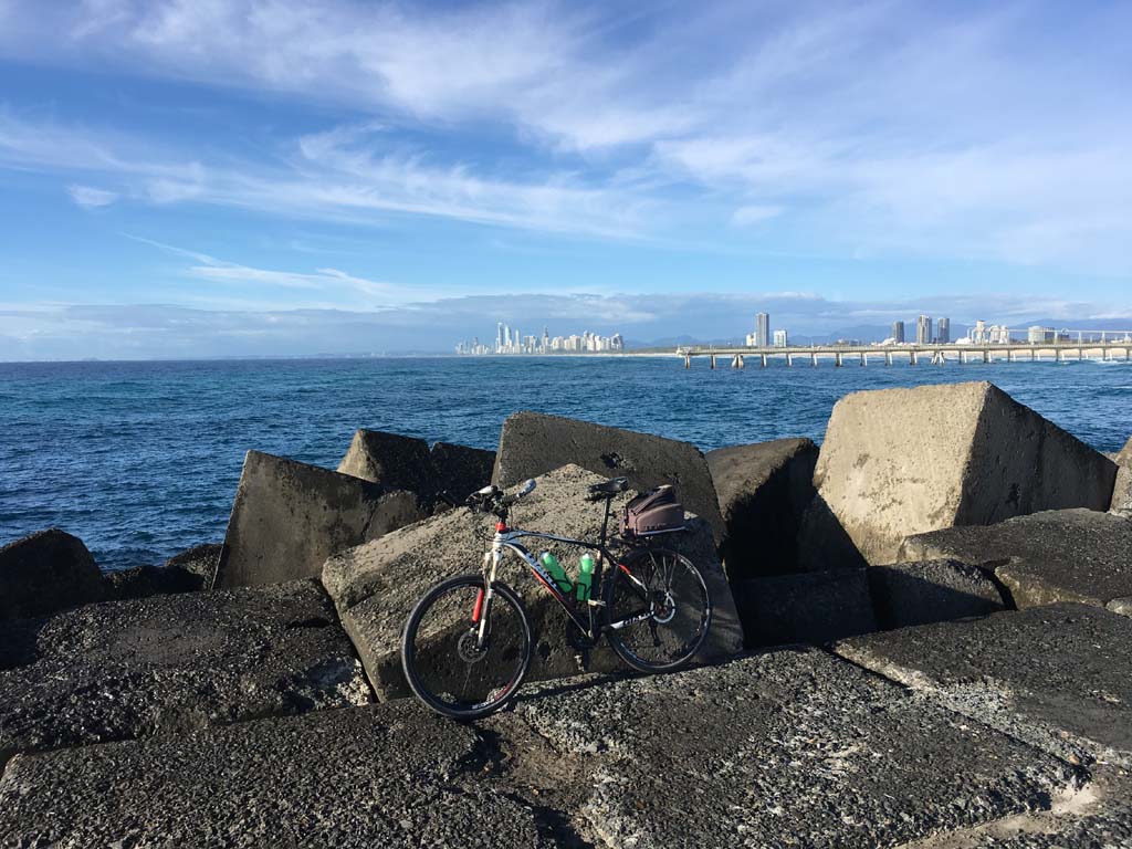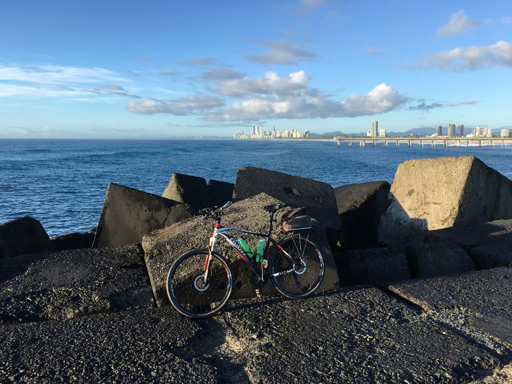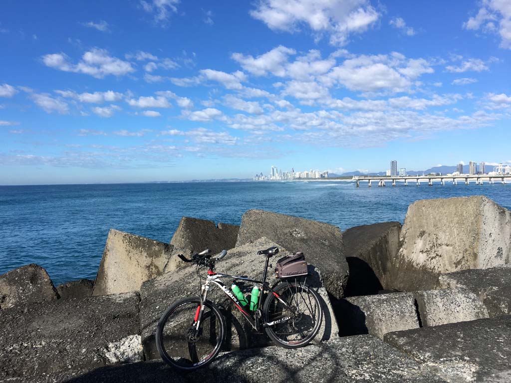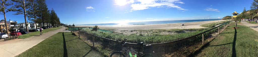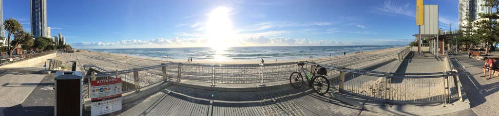 After sunrise, I had brekky and left at 7:53am. I rode my normal route with the Burleigh Heads option. The breeze was a slight, building headwind the whole way to Burleigh Heads.
