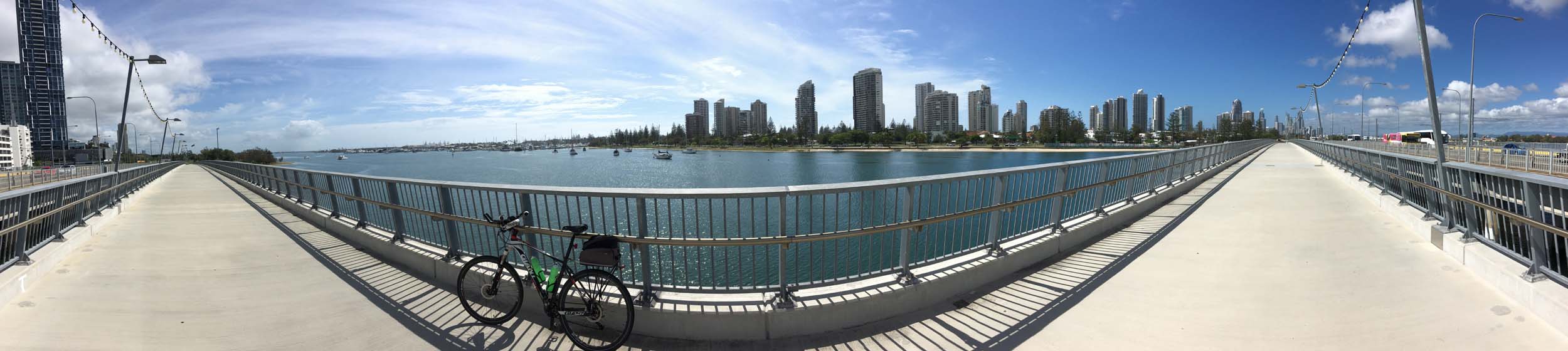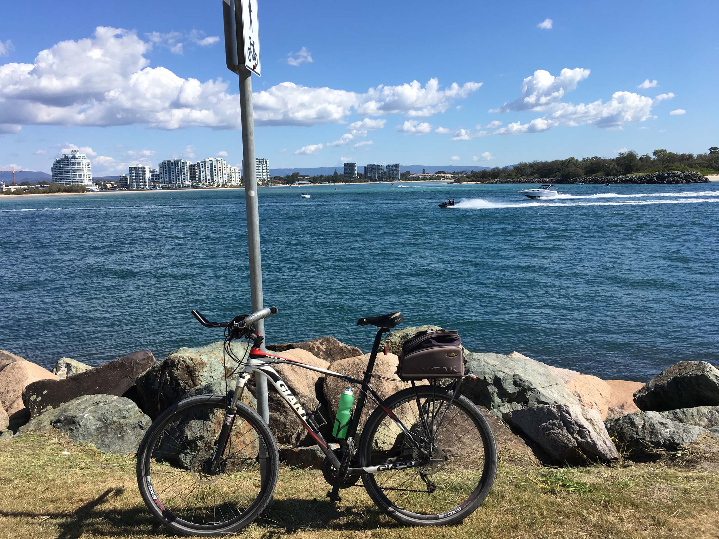 I rode along the shared path to Aqua then along the road to the caravan park, then back along the shared path to over the Sundale bridge at the Nerang river, then along Seaworld drive to the Spit, then back to MacIntosh island along the road and along the shared paths back home.