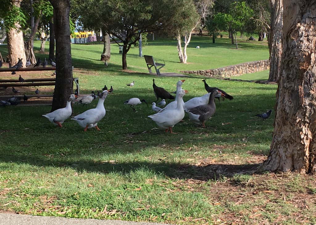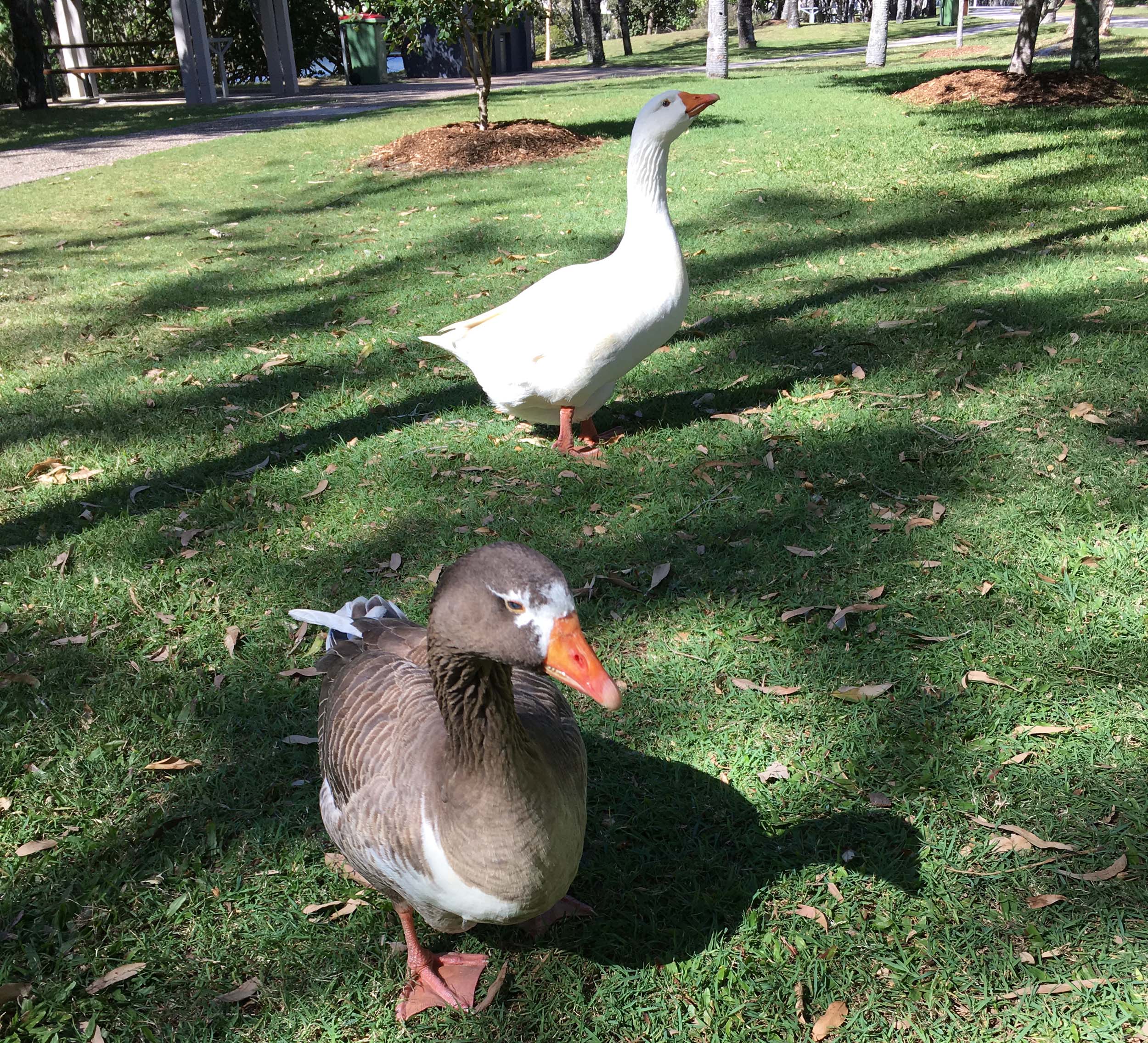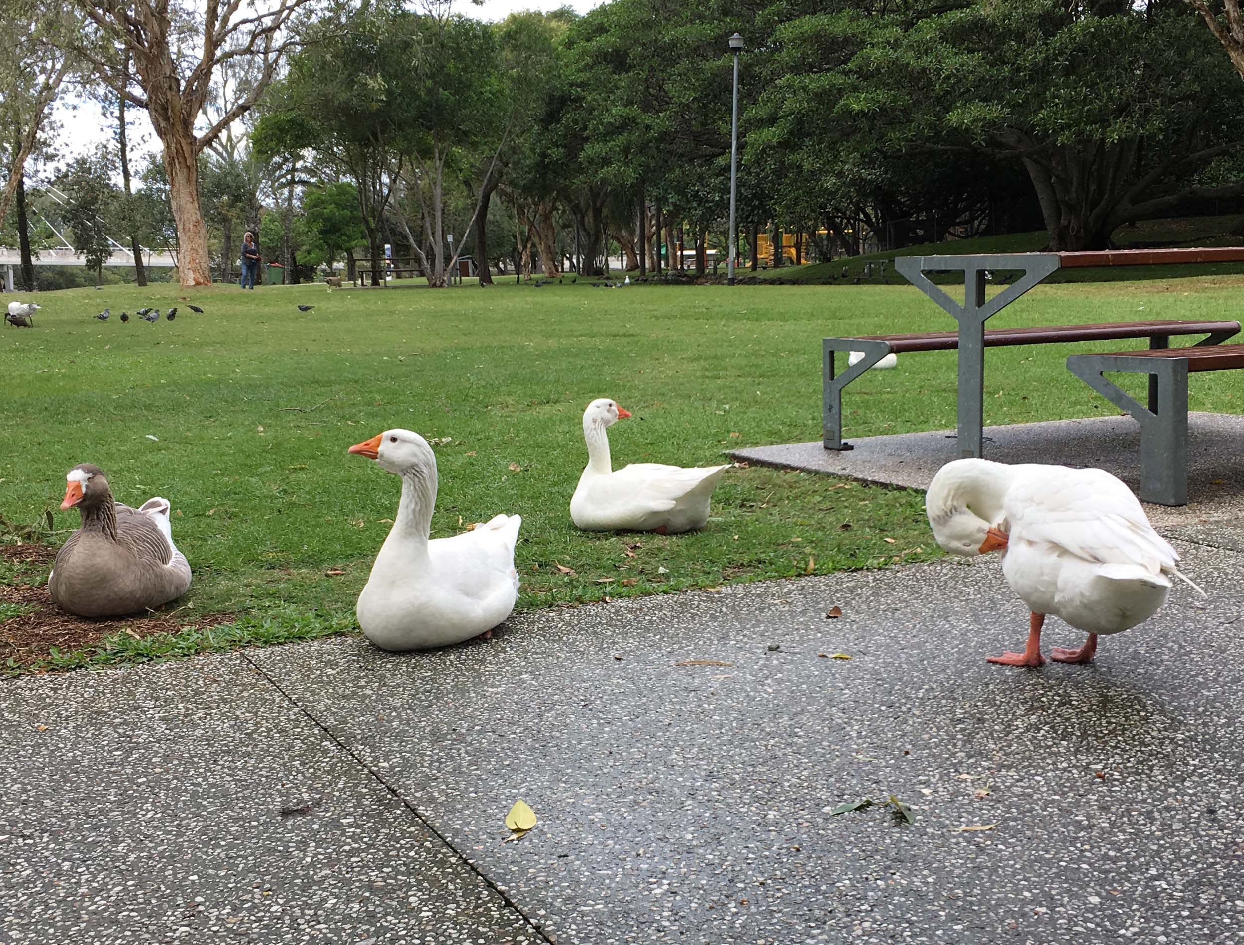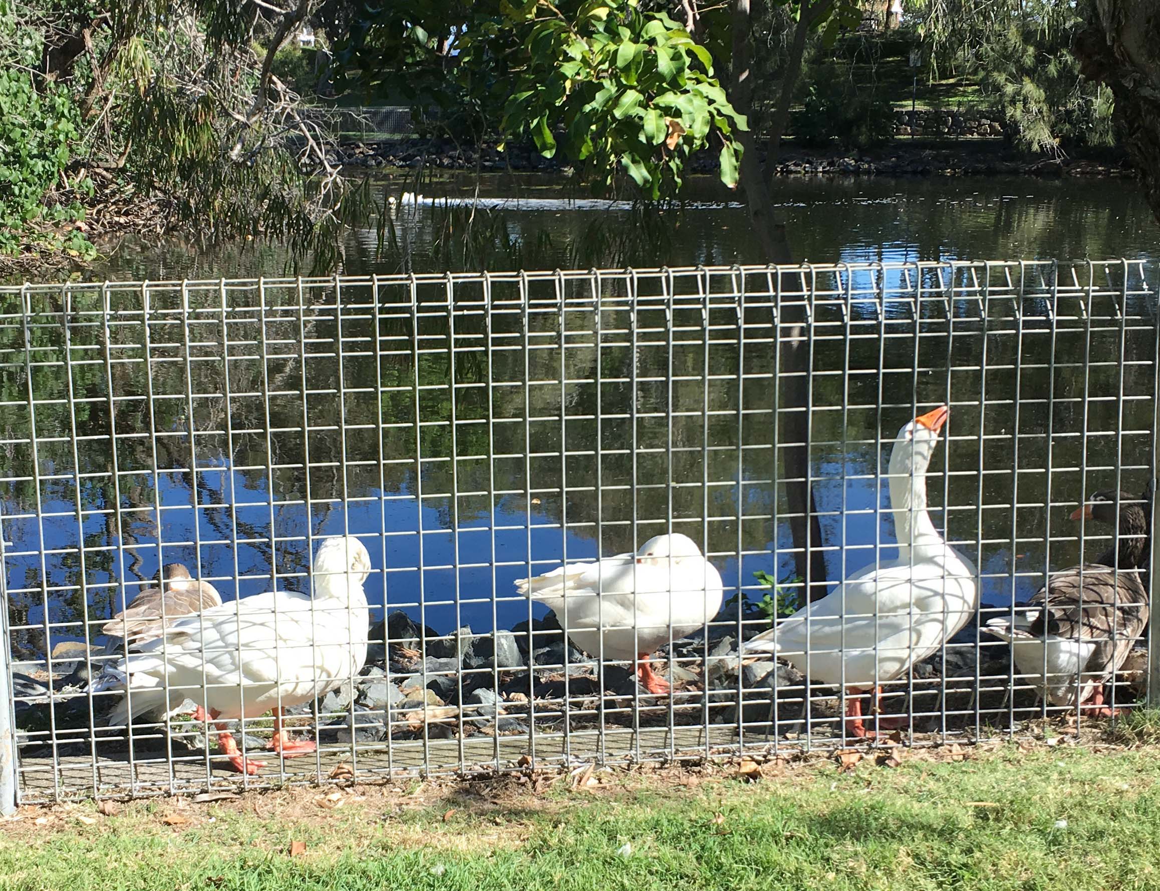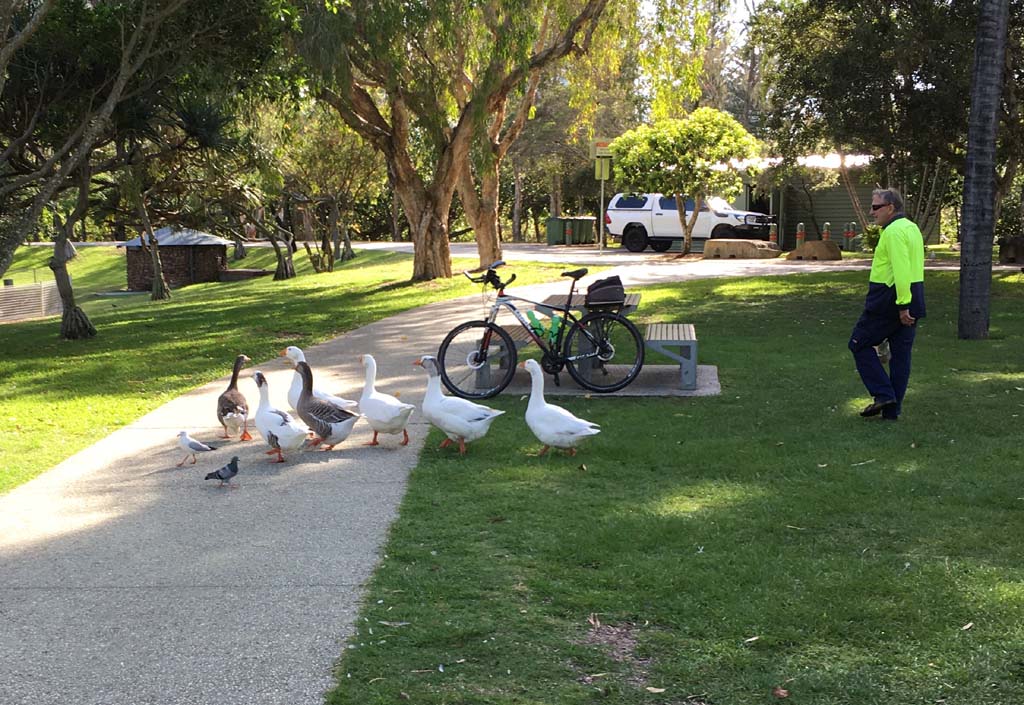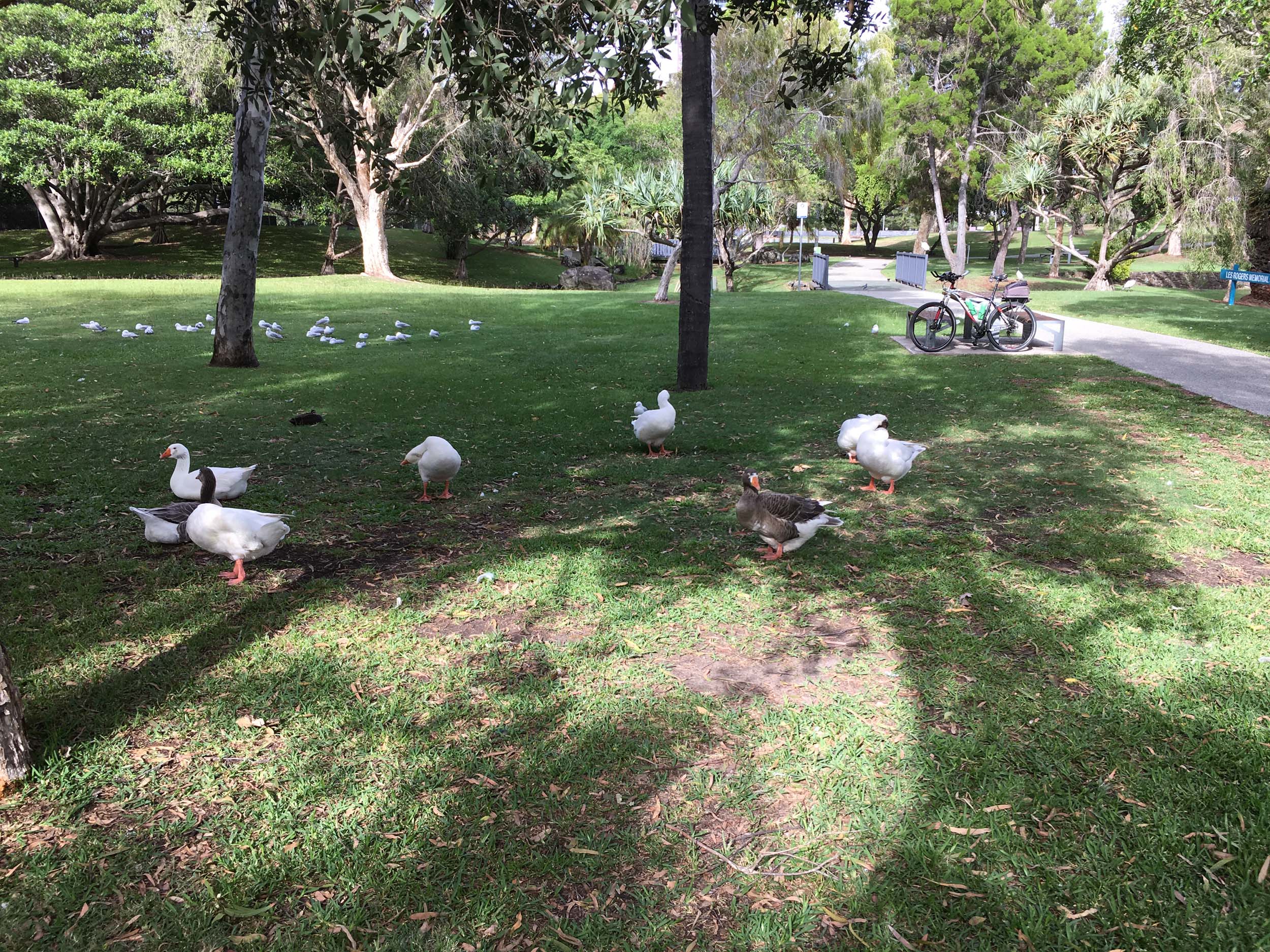 I planned to ride with Jay (my eldest son) but after the weather report on Friday night, we decided to give it a miss. I woke at 6:17am and checked the weather, it was blowing and raining, so it was a good decision not to ride. About 8am, the weather had improved a lot, so I decided to ride my normal route. I left home at 8:18am and while heading south, I had to push into a bugger of a headwind. At MacIntosh Is, I spoke to Mark (the head gardener). On weekends, the 8 geese are let off the island for about 3 hours, then put back on the island.