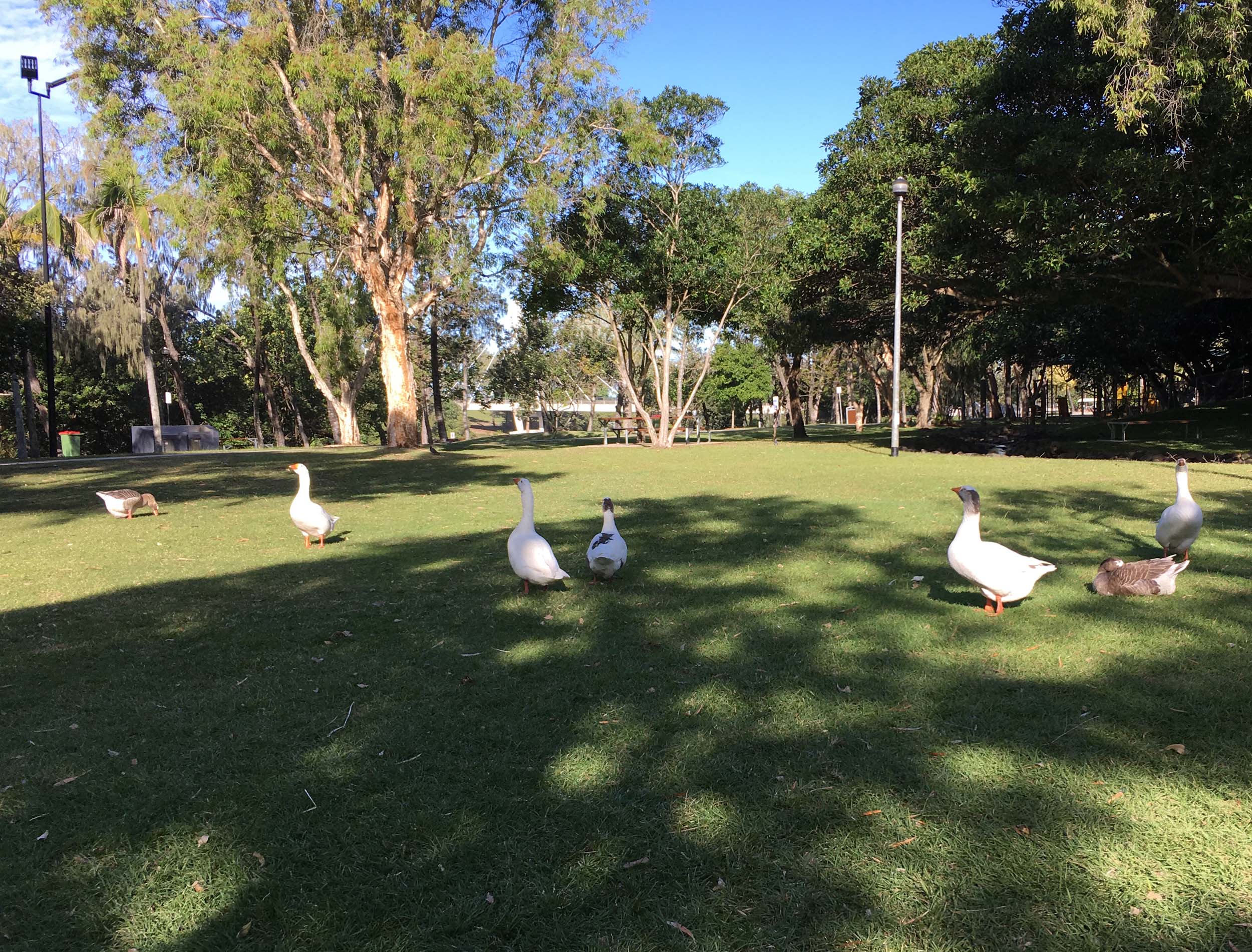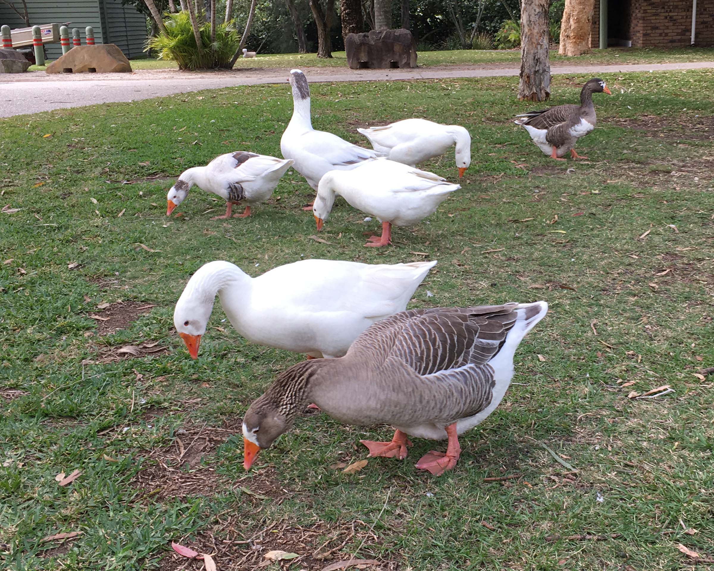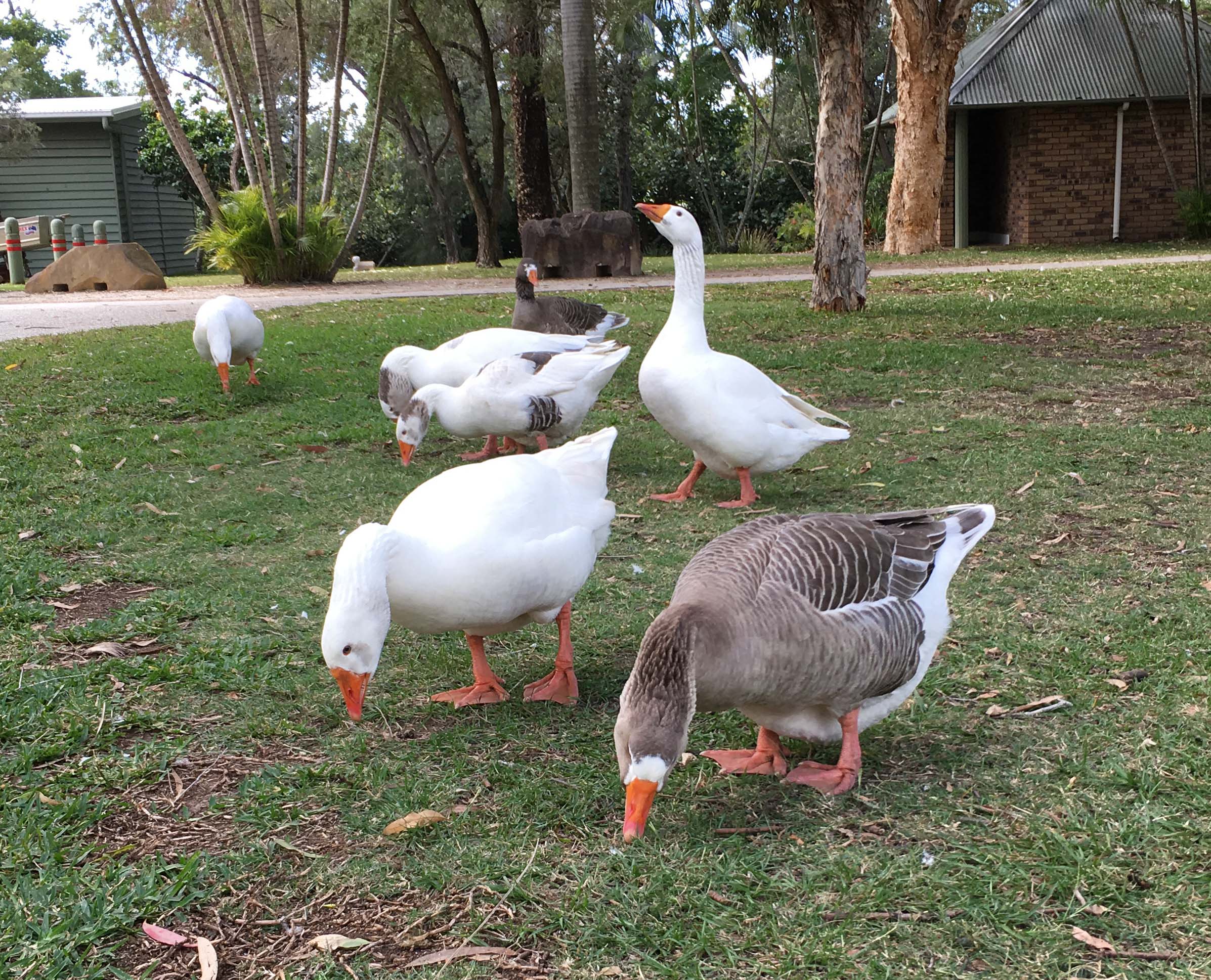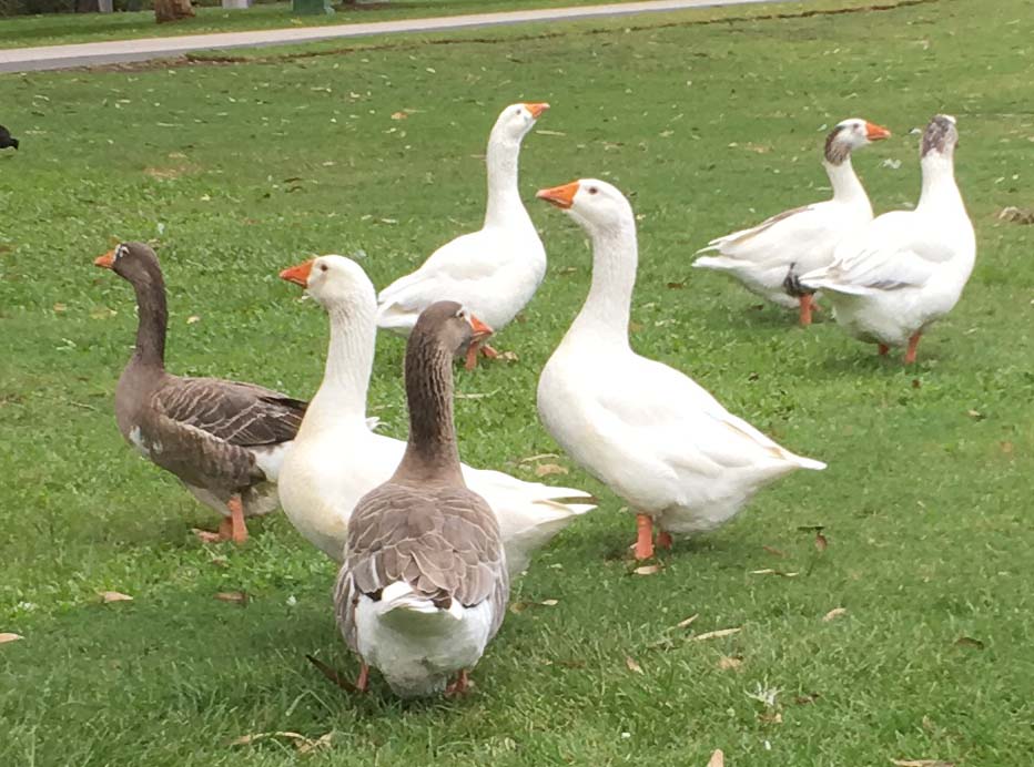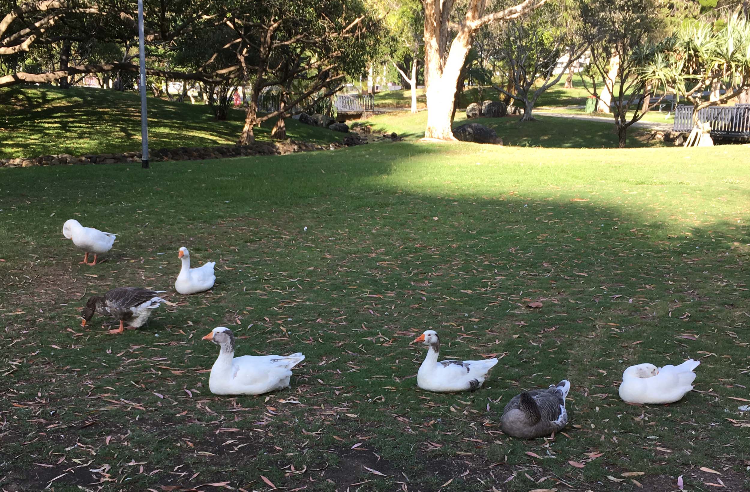 I planned to ride with Jay (my eldest son) but after the weather report on Friday night, we decided to give it a miss. I woke at 6:17am and checked the weather, it was blowing and raining, so it was a good decision not to ride. About 8am, the weather had improved a lot, so I decided to ride my normal route. I left home at 8:18am and while heading south, I had to push into a bugger of a headwind. At MacIntosh Is, I spoke to Mark (the head gardener). On weekends, the 8 geese are let off the island for about 3 hours, then put back on the island.