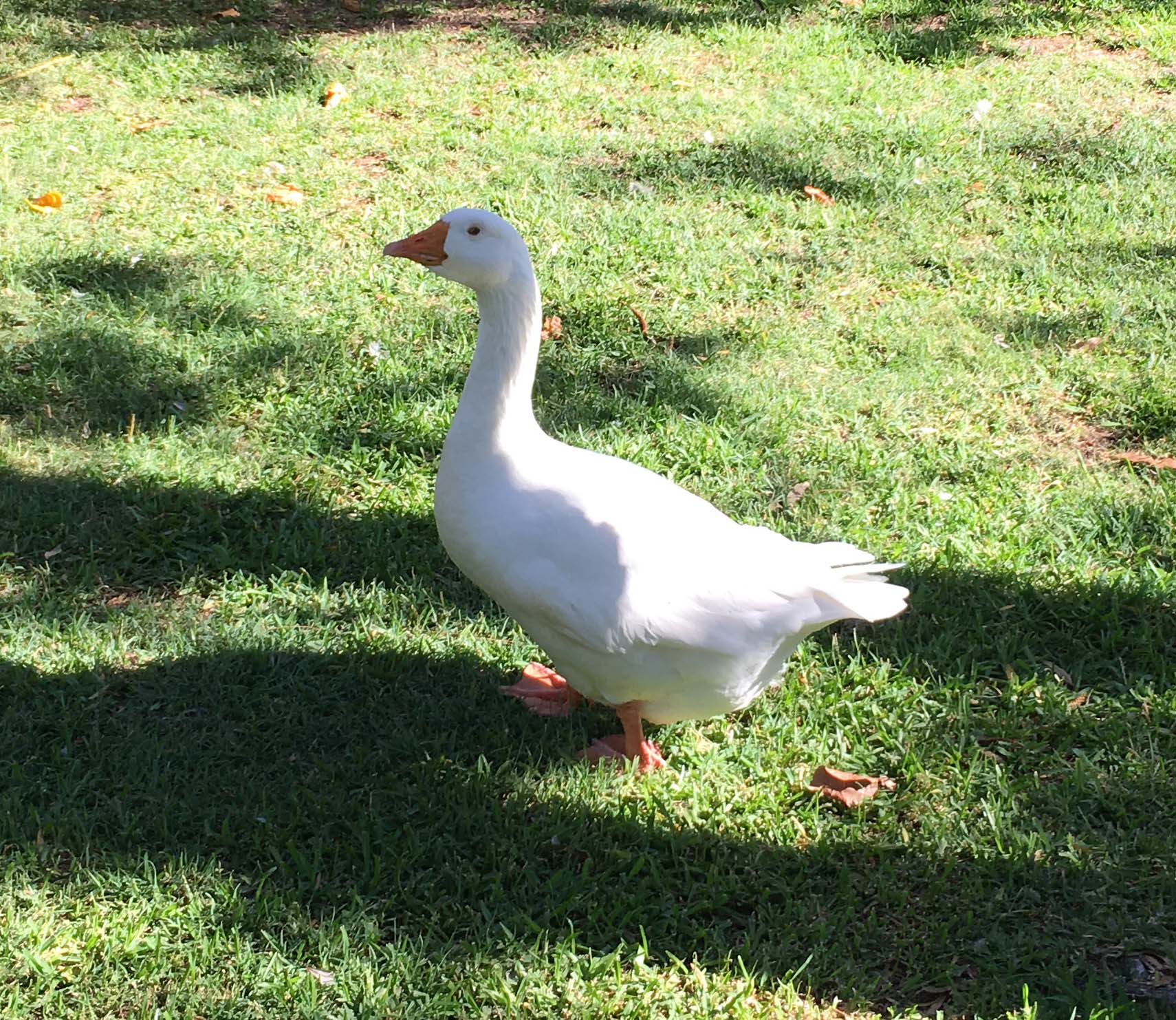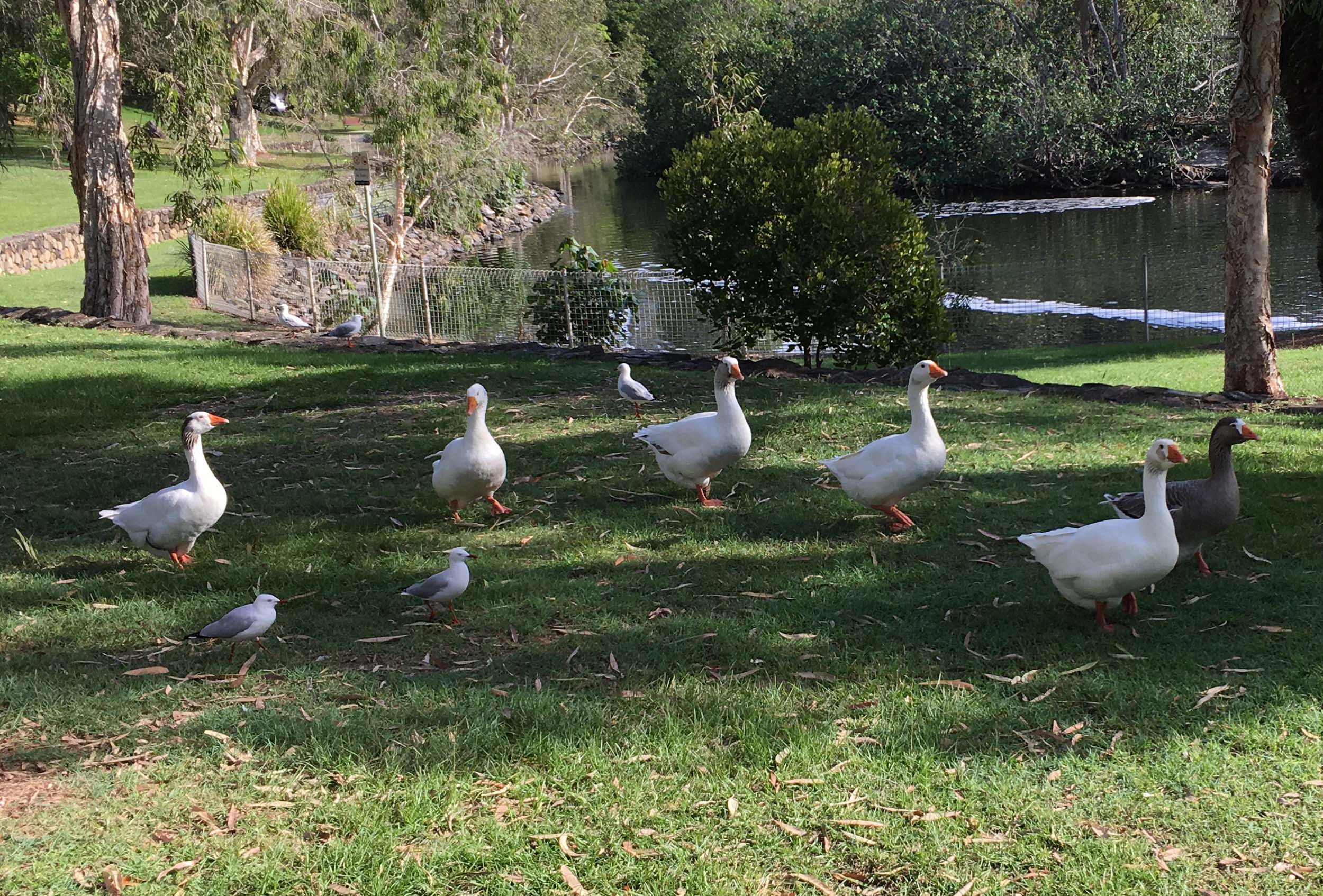 We rode into MacIntosh island where Goosey Lucy and mates were waiting for him. As we sat on the seat, they walked over the bridge to us. They were very noisy. While there, 2 Peter Peacocks were sitting above us, in their tree.