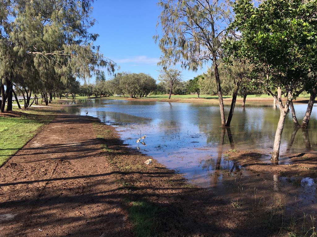Today, only the 2 areas on the Federation Walk (gravel path to the Spit) remained flooded but I still managed to ride through them, probabaly only an inch or two deep. No real drama. The shared path around Doug Jennings Park at the Spit was all dry. The big surprise last ride was the shared path opposite Australia Fair in Broadwater Parklands, this was also completely dry and cleaned by George and his mates. This George is a human and works on the Gold Coast City Council.