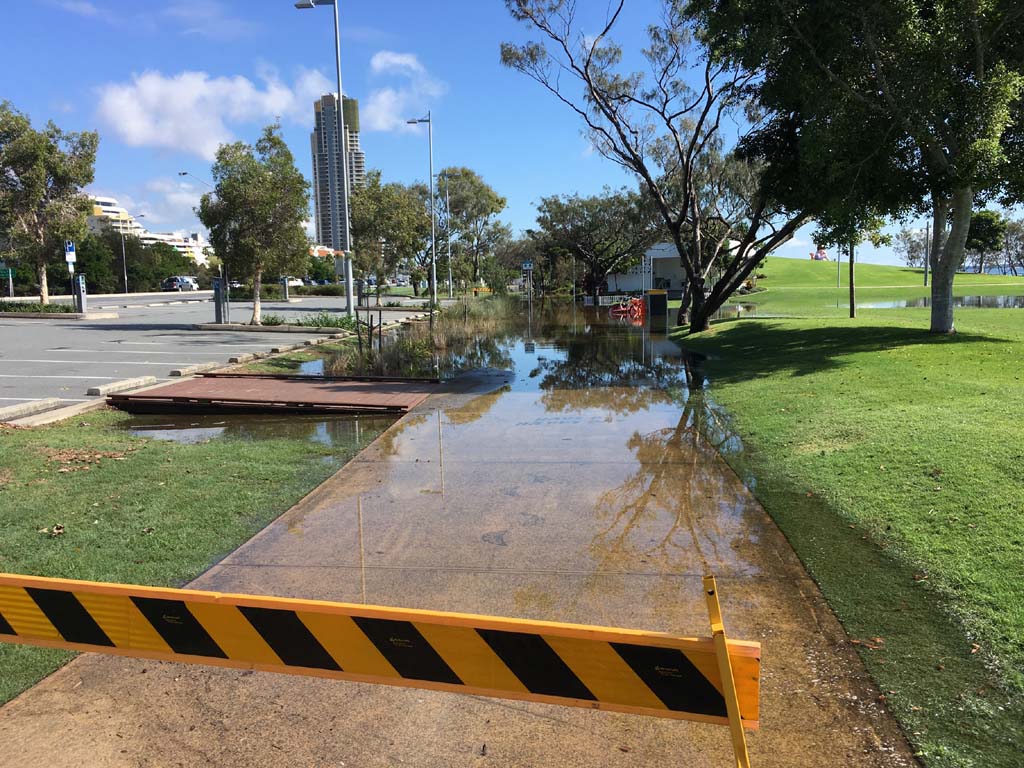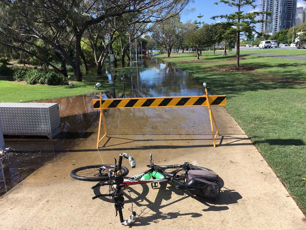 Today, I expected flooded shared paths everywhere BUT I was pleasantly surprised with only 4 areas flooded. 2 areas on the Federation Walk (gravel path to the Spit. This floods if there are 2 drops of rain). The shared path around Doug Jennings Park at the Spit was flooded but it is a concrete path aand was covered with an inch or two of water. The big surprise was the shared path opposite Australia Fair in Broadwater Parklands, this had about 6 inches and was barricaded off completely.