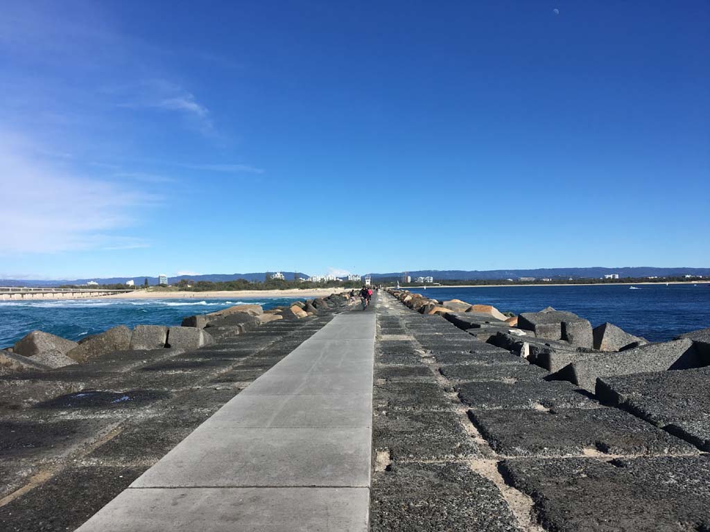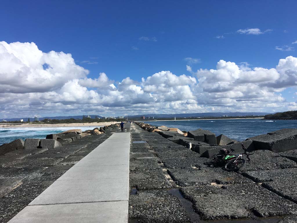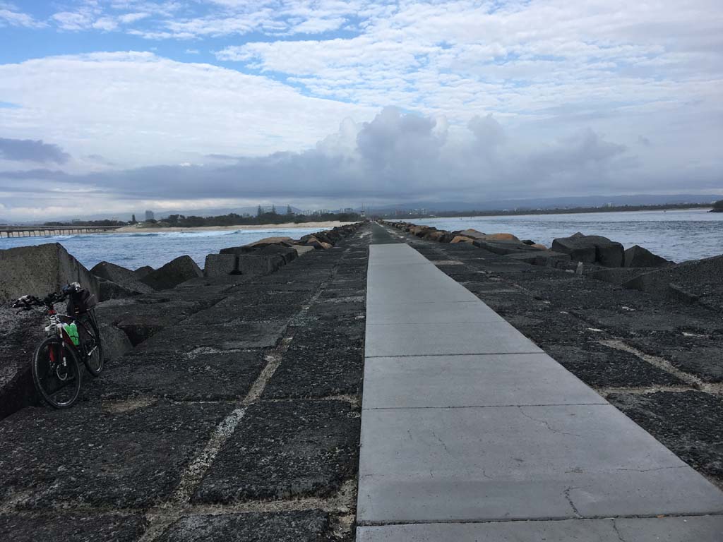 I rode back along the Esplanade, to the Southport SLSC, continuing along the Shared path which turns into the gravel Federation Walk. As normal, I rode to the end of both Spits. Sat at the end of the Seaward Spit and ate my 2 bananas. They were YUMMA.