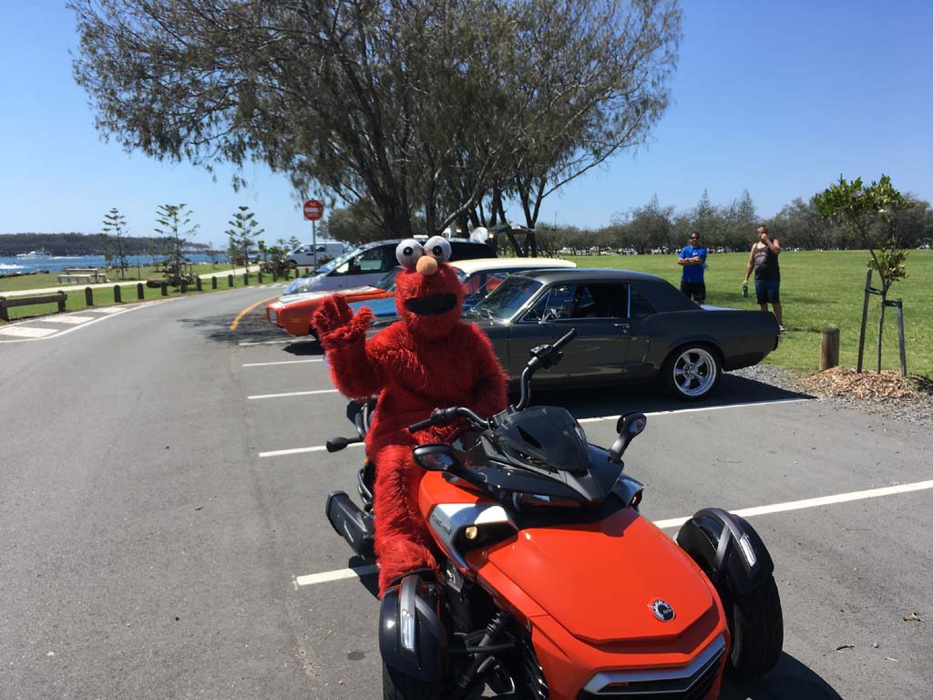 As normal, I rode to the end of both Spits. Sat at the end of the East Spit and ate my 2 bananas. They were YUMMA. Rode to the end of the Broadwater Spit then around the shared path that surround the Doug Jennings park. Saw Elmo riding a Can Am motor trike and flagged him down for a photo. He said that he had been stopped by 2 cops already this morning BUT only for a photo. He wears the costume for fun. Back along Seaworld Drive past the Southport SLSC then along the shared path back to MacIntosh Island. I rode another lap of the Island. Being the weekend and after 9:30am, Goosey Lucy and his mates were over on their island. They sleep on their island as it keeps them safe.