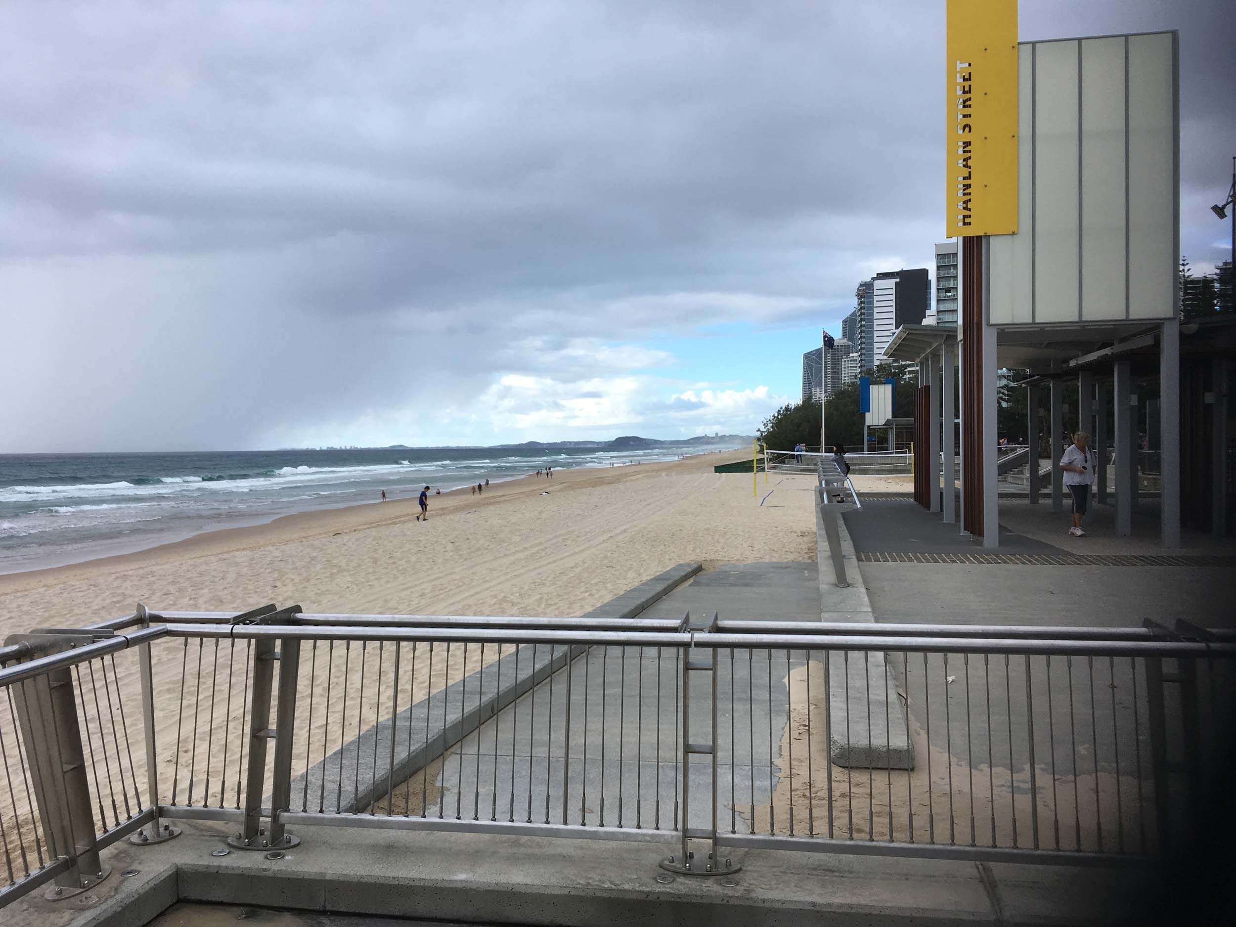 I stopped at Hanlan street 'lookout' and took my daily weather photos. The beach was nearly deserted, except for a homeless guy who I later found out was the "Surfer Paradise Fairy". This guy I have noticed a few times on my rides. He wears a tutu and a bikini top. Well, he was asleep under the lifesaving tower just near Cavil Ave.