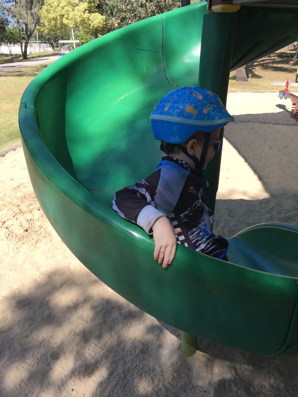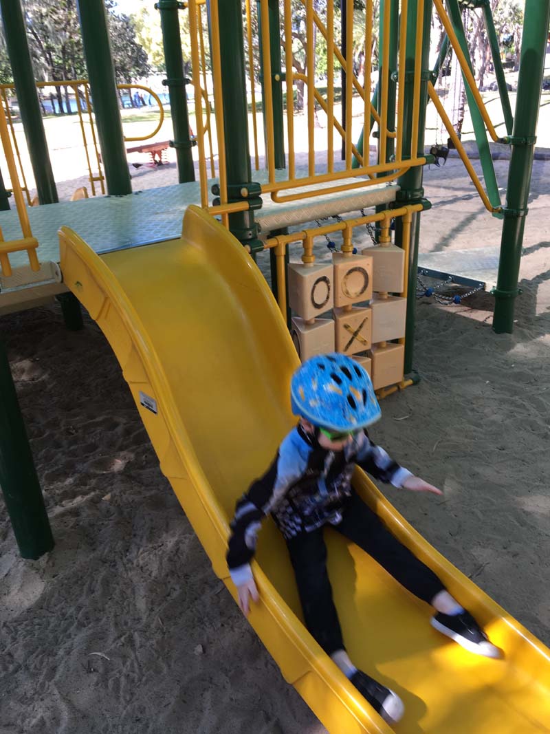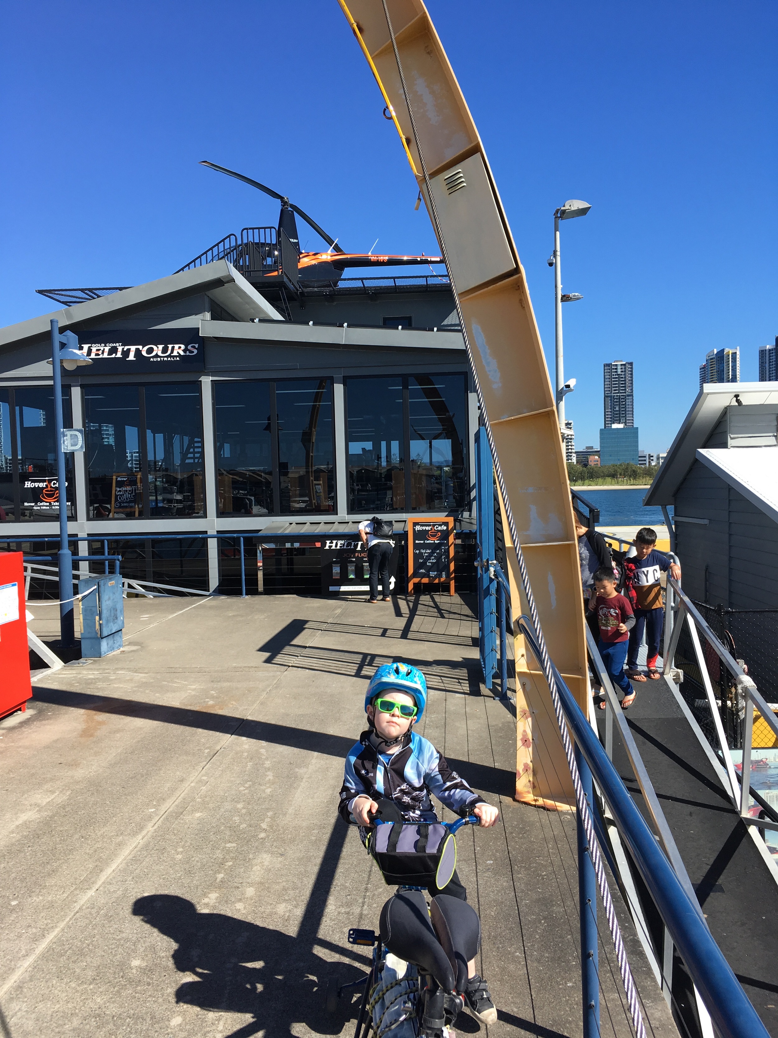 Next stop was the tunnel slide playground near the Southport SLSC, so we rode to there and Mase had numerous slides, then we headed off to Helitours again. Today, there was only two helicopter operating and we watched one do a circuit, take off, fly around and land. Mase was rapt.