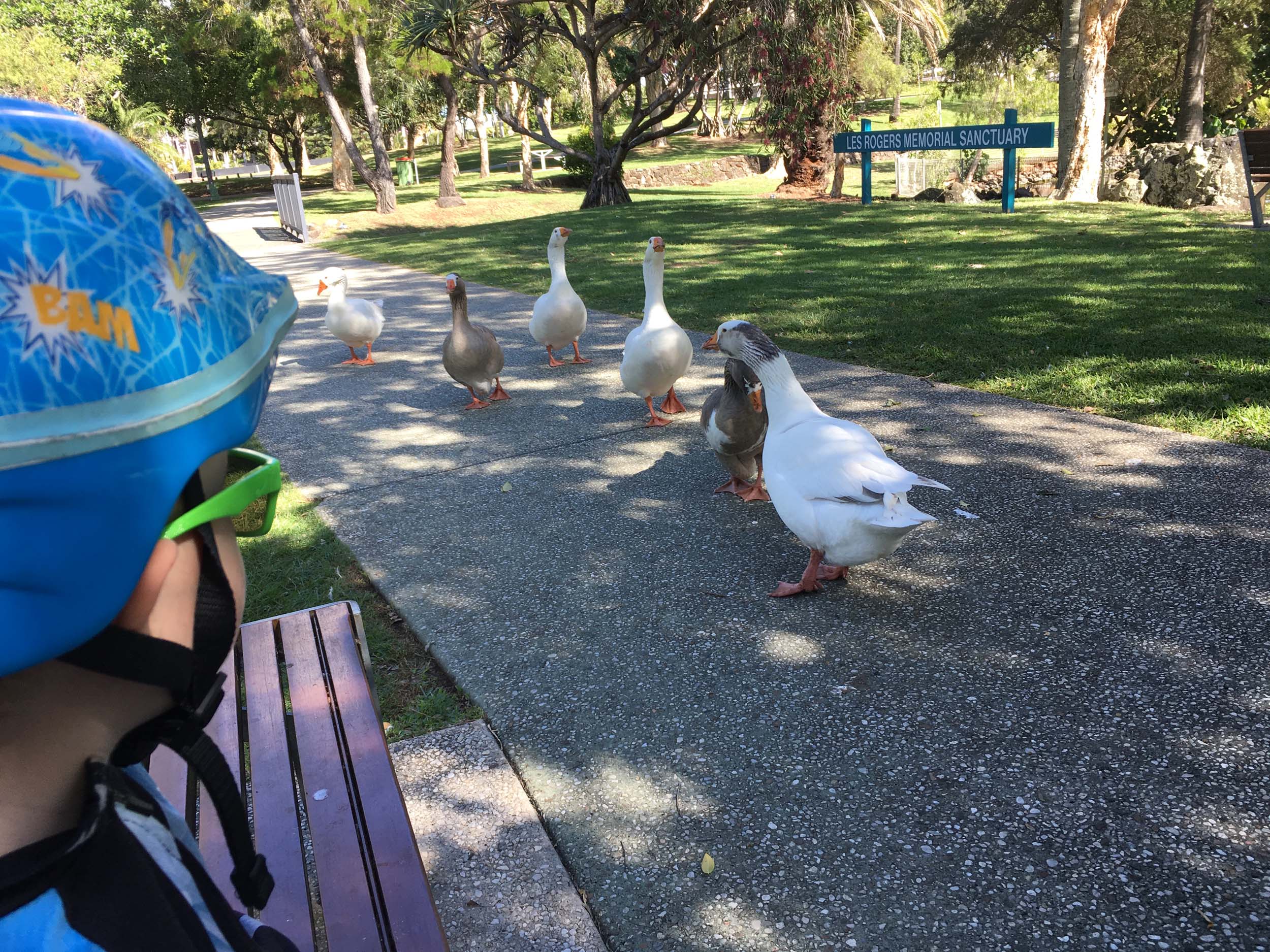 As normal, I rode to the end of both Spits. Sat at the end of the Seaward Spit and ate my 2 bananas. They were YUMMA. Rode to the end of the Broadwater Spit then around the shared path that surround the Doug Jennings park. Back along Seaworld Drive past the Southport SLSC then along the shared path back to MacIntosh Island. I rode another lap of the Island. While I sat on the benchseat, Goosey Lucy and his mates were over at the water trough and couldn't give a stuff about me. This is becoming their normal behaviour.