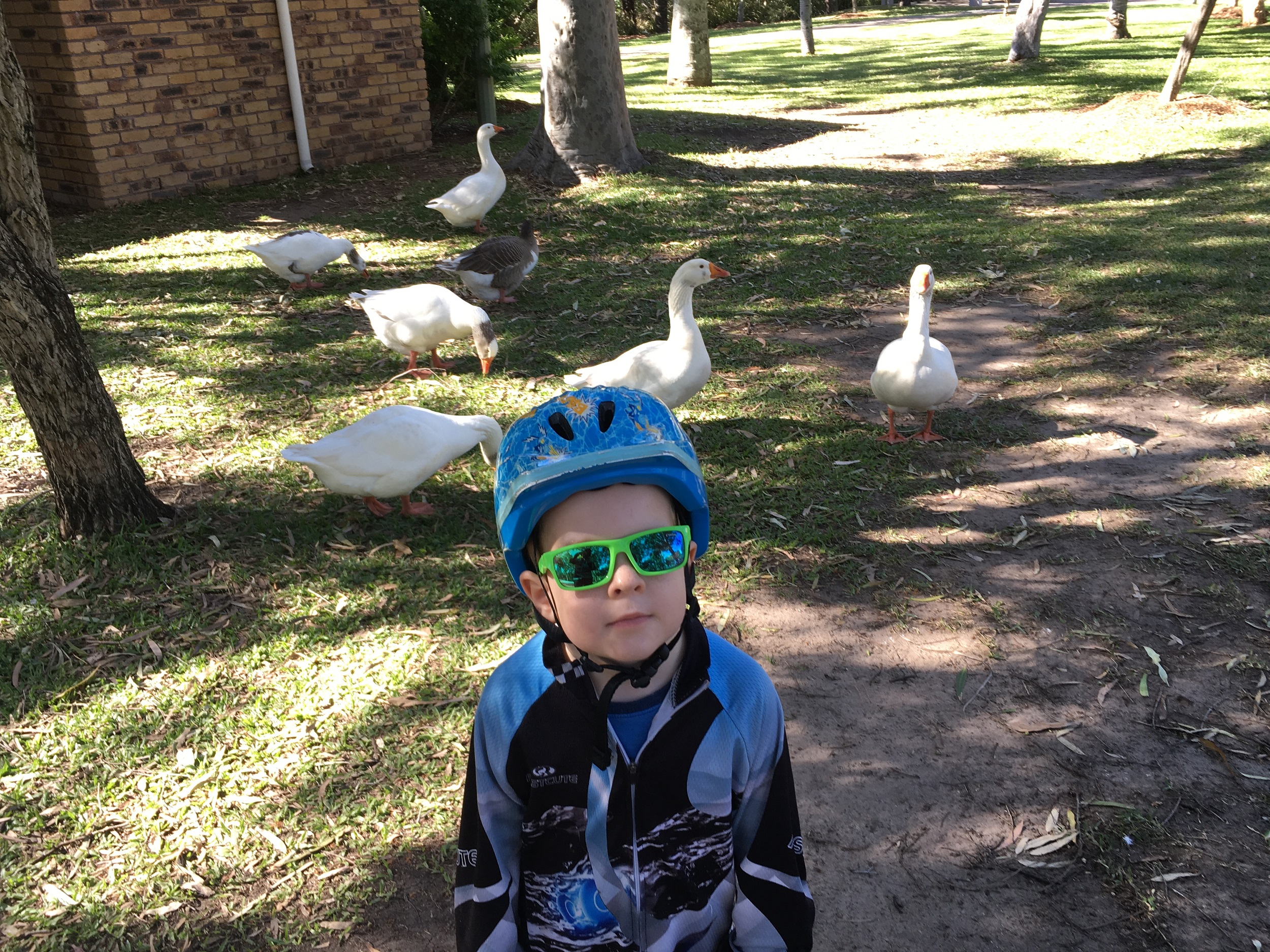 We were booked in to mind Mase today. He wanted to go for a ride to see Goosey Lucy and Peter Peacock etc, so we did. We left home at 9:08am. I connected his bike to the Tagalong so we can cross Marine Parade without any dramas. Once on the shared path I disconnected the Tagalong hitch and he rode by himself. Usually at 'blazing speed' so he tells me.