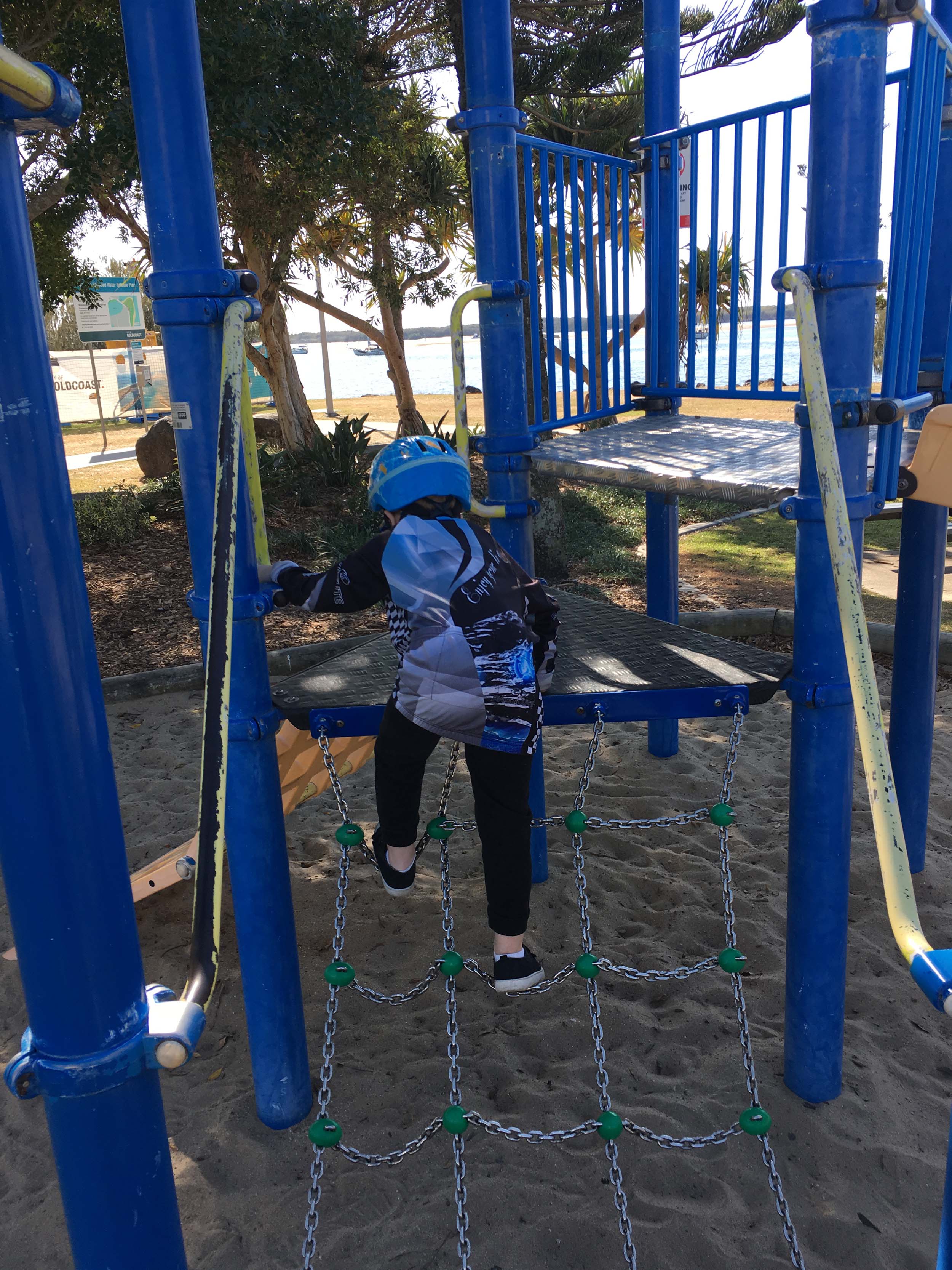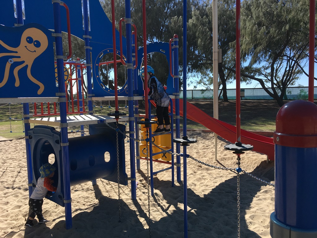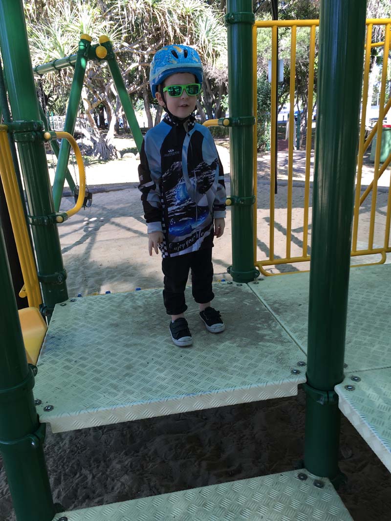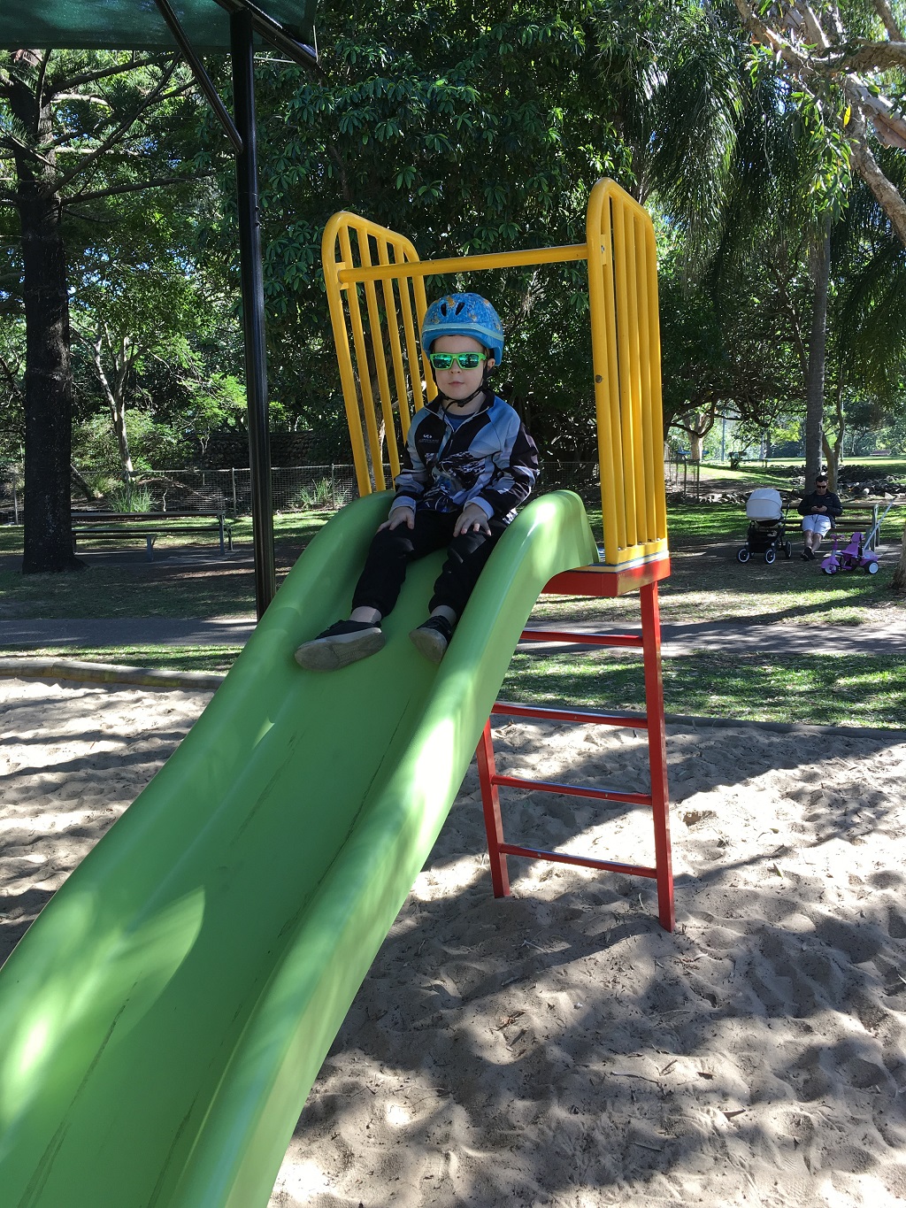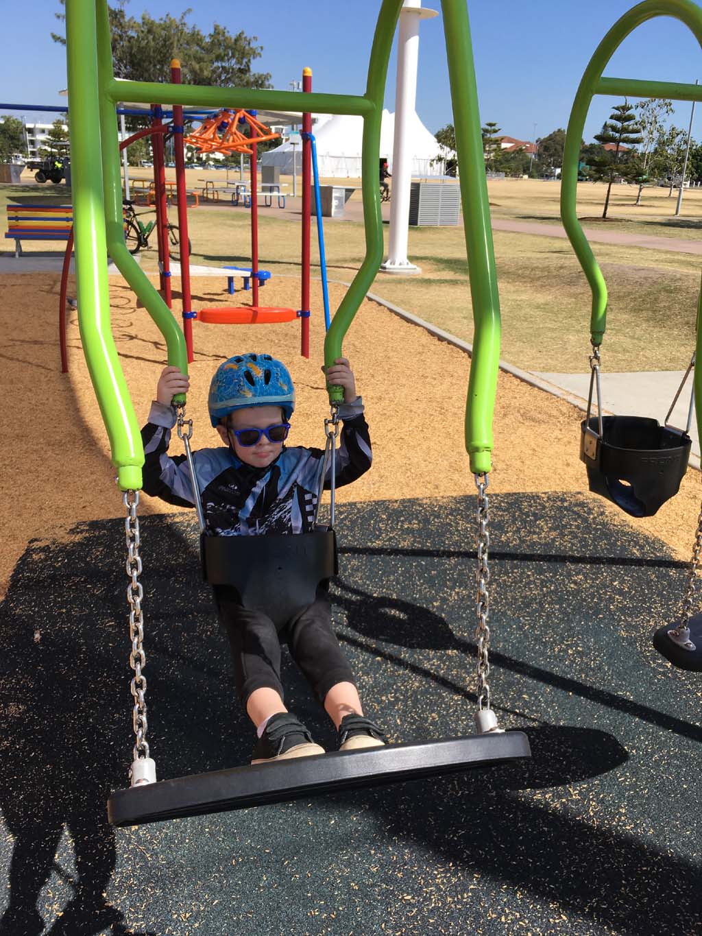 We rode along the shared path from our place, upto the northern turnaround point at Lands End. Checked out the cranes but nothing was moving while we were there. Tested out the 2 playgrounds that were within 100 meters of the cranes. Continued southward and stopped at the playground opposite our apartment, waved to mama who was on our balcony, she waved back. Continued on past Susie Lou, the pride of our fleet. As we approached the Caravan Park, Mase told me that he was buggered and wanted me to connect the tagalong. I coerced him into riding, we stopped at the next playground (the red,yellow and blue topped playground, naturally, he tested out the equipment. We got the whole way to the start of the Sundale bridge before I reconnected the Tagalong.