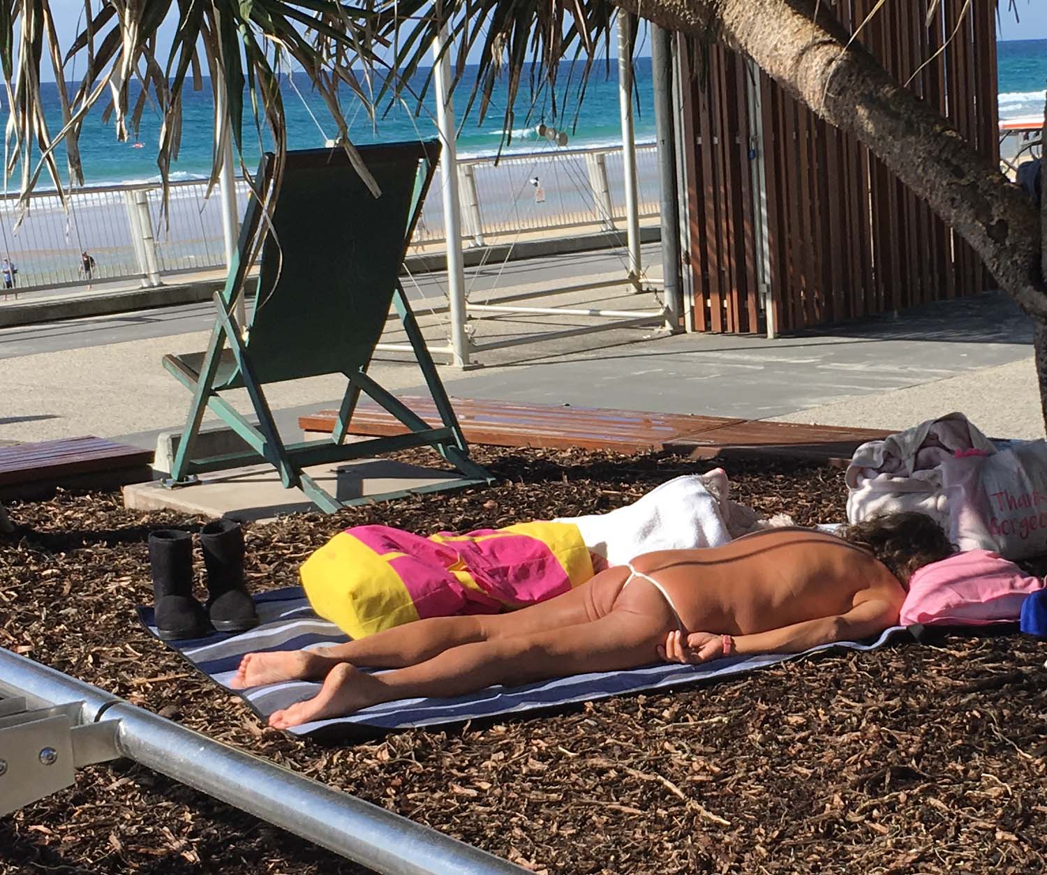 As usual, I rode Northward to my Lands End turnaround point. I continued down to MacIntosh Is. rode 1 lap then over the bridge at Narrowneck. I continued on to Burleigh Heads via Broadbeach. Stopped on the top of Burleigh Heads bluff and took photos then retraced my route back to Surfers. Stopping at Hanlan street 'lookout' and took my daily weather photos. I spotted "Bubbles" this morning, he was wearing his G string and a sleep in the garden bed near the lifesaving tower.
