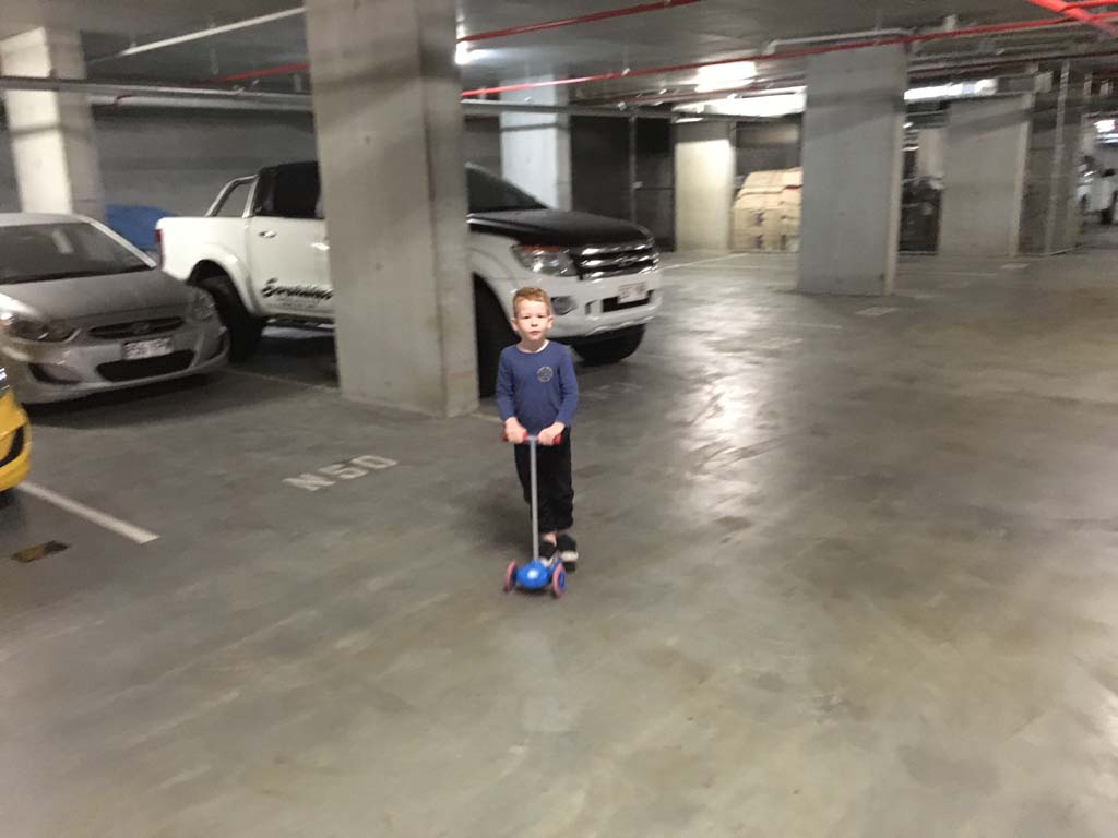 I kept Mase on the Tagalong and we headed back to our apartment. After fixing his training wheel, he 'tested it' by doing many laps of the basement carpark, then tried the same route on his scooter. He loved it.