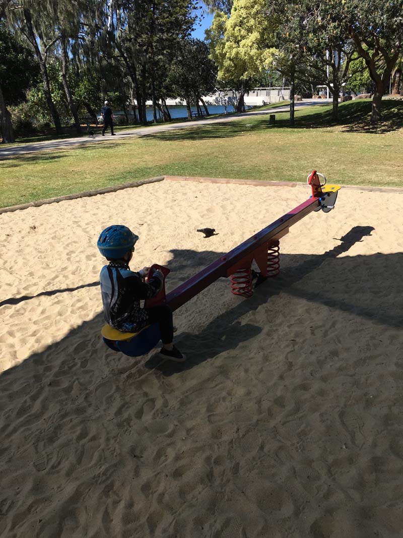 Next stop was the playground on MacIntosh Island about 50meters from where Goosey Lucy and peter Peacock and mates, hung out. After testing yet another playground, we made our way back to Kamals. Kamals at Cafe Rockpool, as Mase wanted banana bread and I had a coffee. Kamal came out and spoke to Mase and me. Mase likes Kamal.