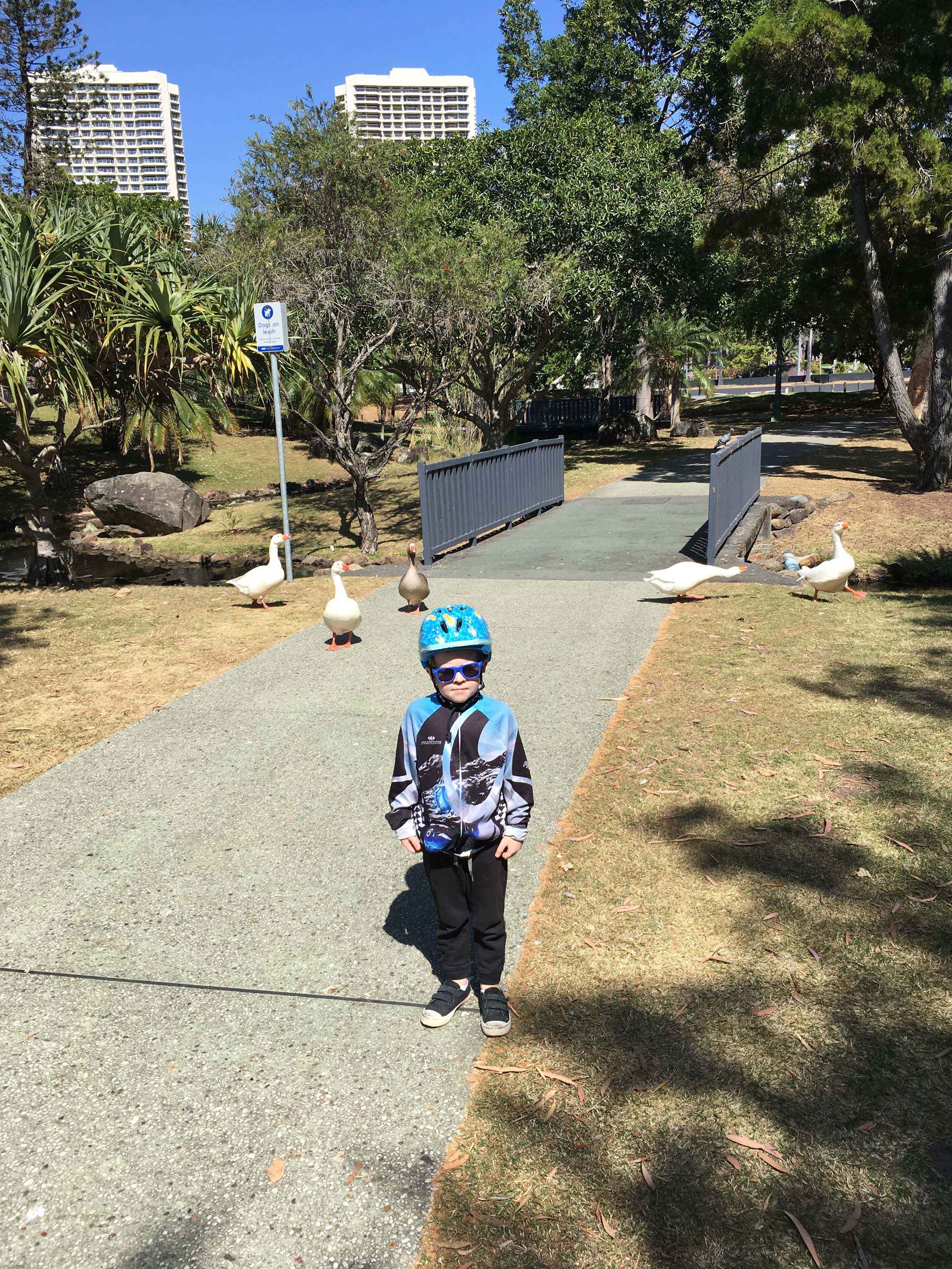 Mase's big sister Mont was dancing at HOTA, so we minded Mase. He wanted to go for a ride to see Goosey Lucy and Peter Peacock etc, so we did. We left home at 9:22am. I connected his bike to the Tagalong so we can cross Marine Parade without any dramas. Once on the shared path I disconnected the Tagalong hitch and he rode by himself. Usually at 'blazing speed' so he tells me.
