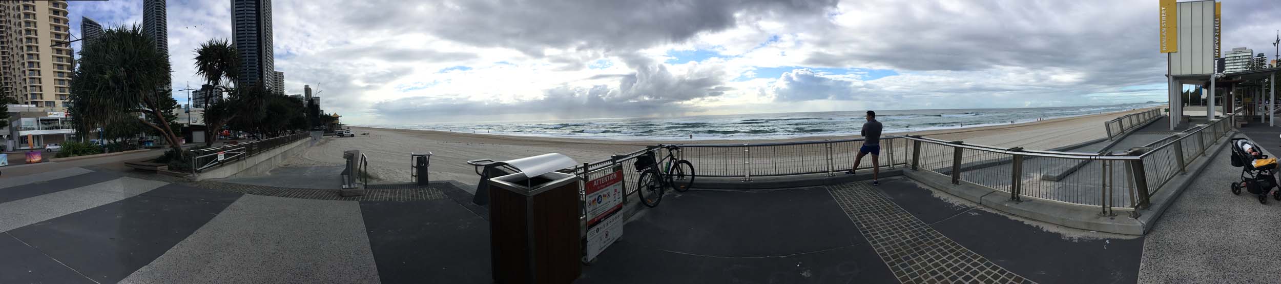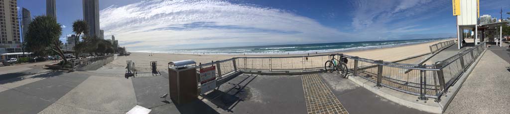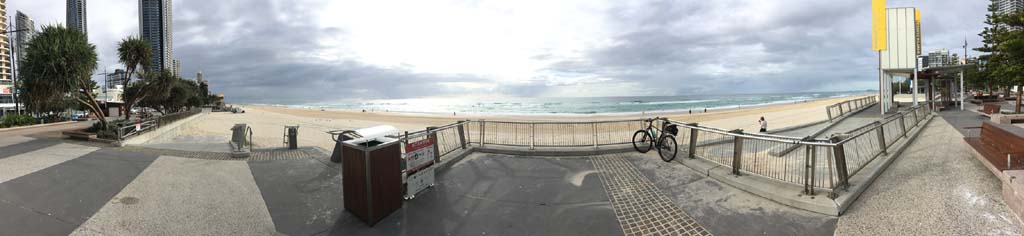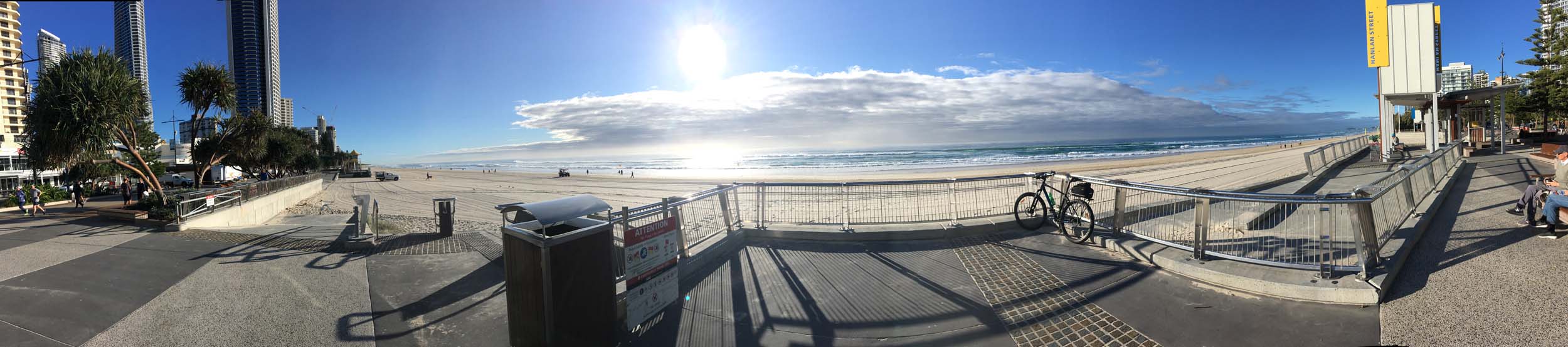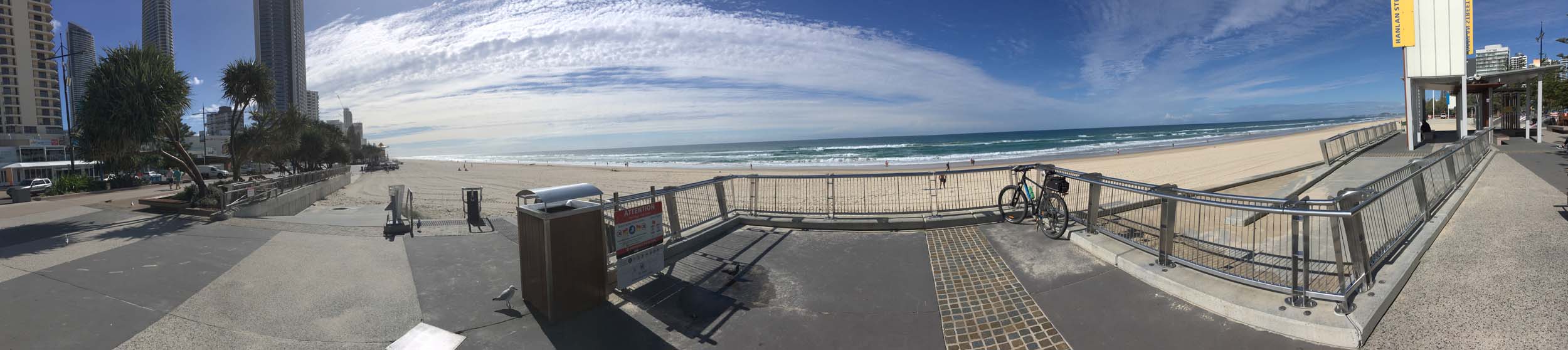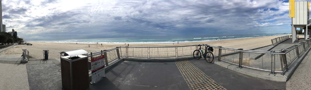 I headed to Surfers along the Esplanade into a light headwind, and continued to Robbie McEwens' Piccolo Espresso cafe. I passed the $1B Jewel 3 towers, it still isn't finished. Rode along the shared path through Broadbeach, bad decision, too many people. Continued down to Robbies, didn't plan to stop anyway. Good idea there was a queue waiting for takeaway coffees etc. Did a U turn and retraced my route back to Surfers, where I stopped at my usual spot near Hanlan St and took my weather photos. I headed off to the Spit along the Esplanade, with a light tailwind.