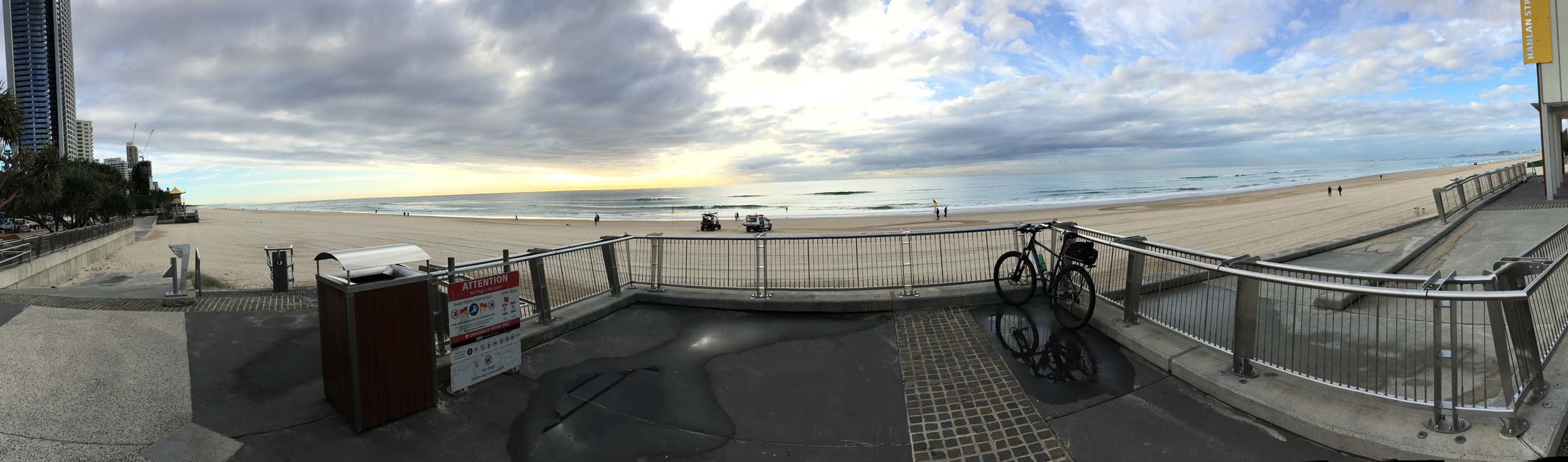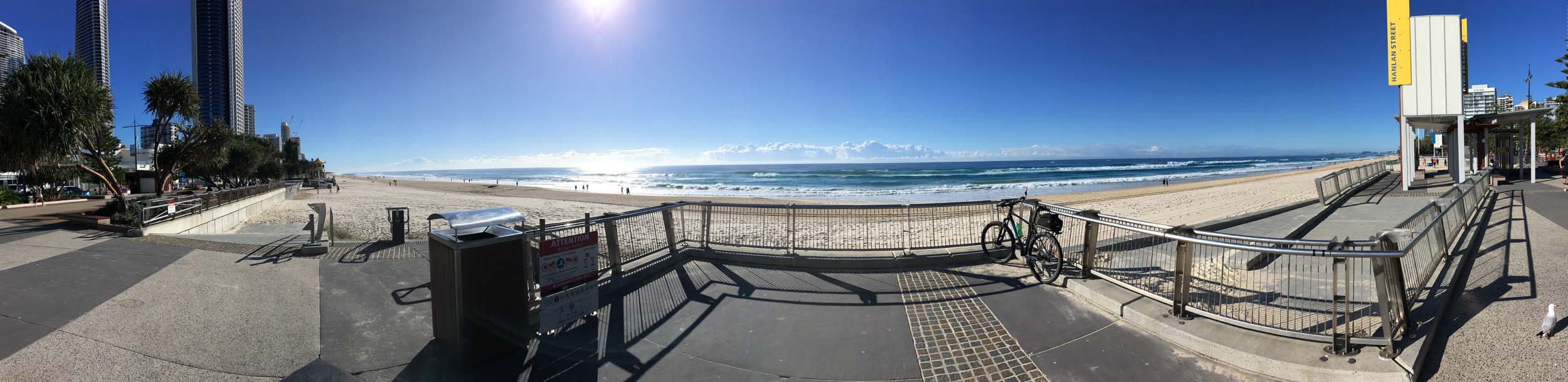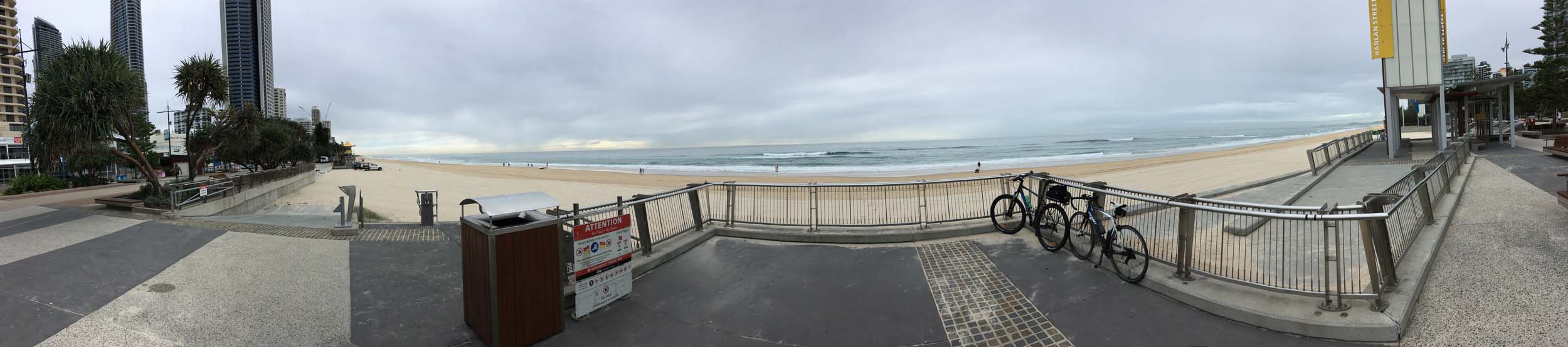I headed to Surfers along the Esplanade into a light headwind, and continued to Robbie McEwens' Piccolo Espresso cafe. I passed the $1B Jewel 3 towers, it still isn't finished. Rode along the shared path through Broadbeach, bad decision, too many people. Continued down to Robbies, didn't plan to stop anyway. Good idea there was a queue waiting for takeaway coffees etc. Did a U turn and retraced my route back to Surfers, where I stopped at my usual spot near Hanlan St and took my weather photos. I headed off to the Spit along the Esplanade, with a light tailwind.