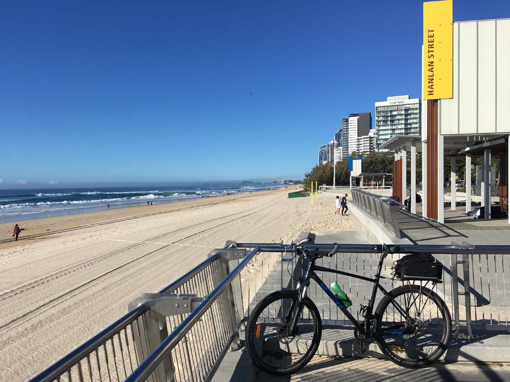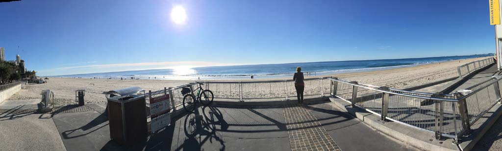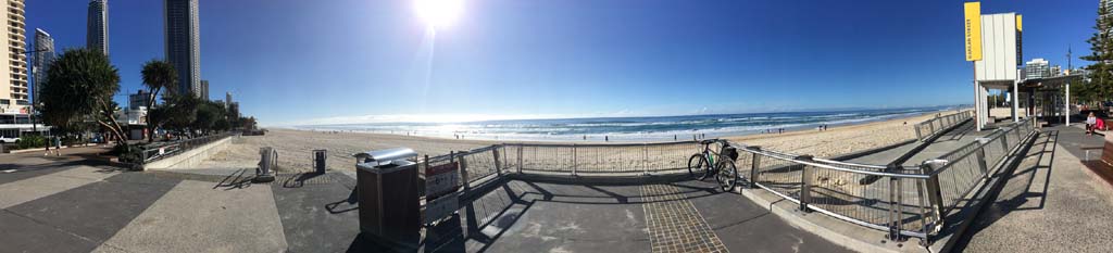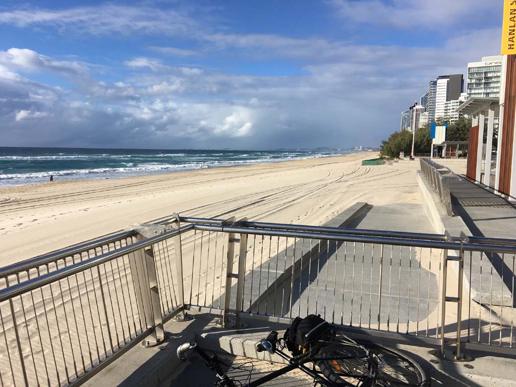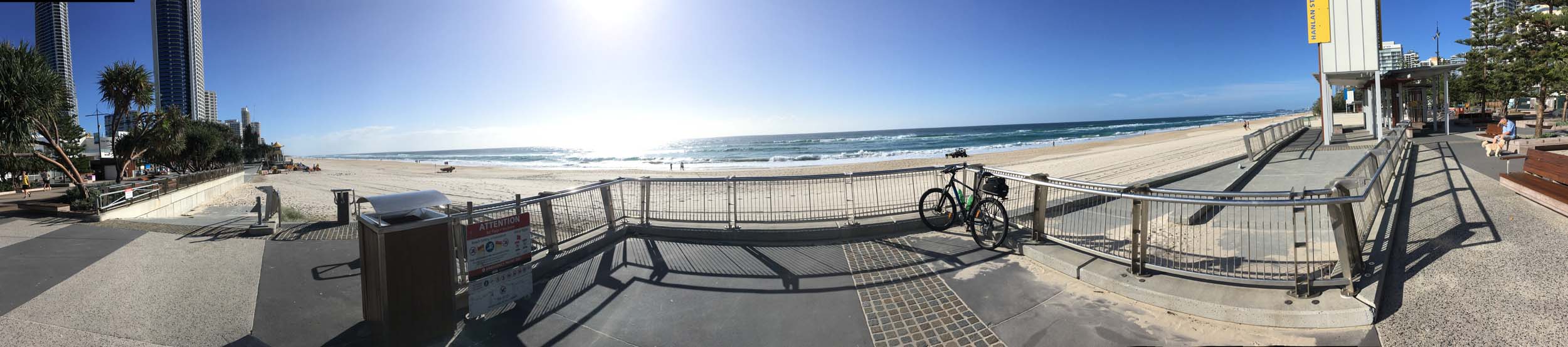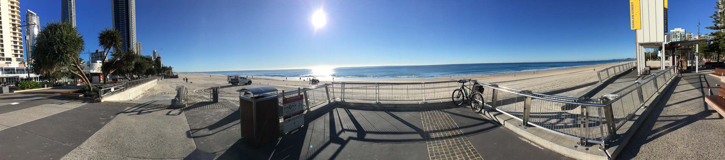 I headed to Surfers along the Esplanade into a light headwind, and continued to Robbie McEwens' Piccolo Espresso cafe. I passed the $1B Jewel 3 towers, it still isn't finished. Rode along the shared path through Broadbeach, bad decision, too many people. Continued down to Robbies, didn't plan to stop anyway. Good idea there was a queue waiting for takeaway coffees etc. Did a U turn and retraced my route back to Surfers, where I stopped at my usual spot near Hanlan St and took my weather photos. I headed off to the Spit along the Esplanade, with a light tailwind.