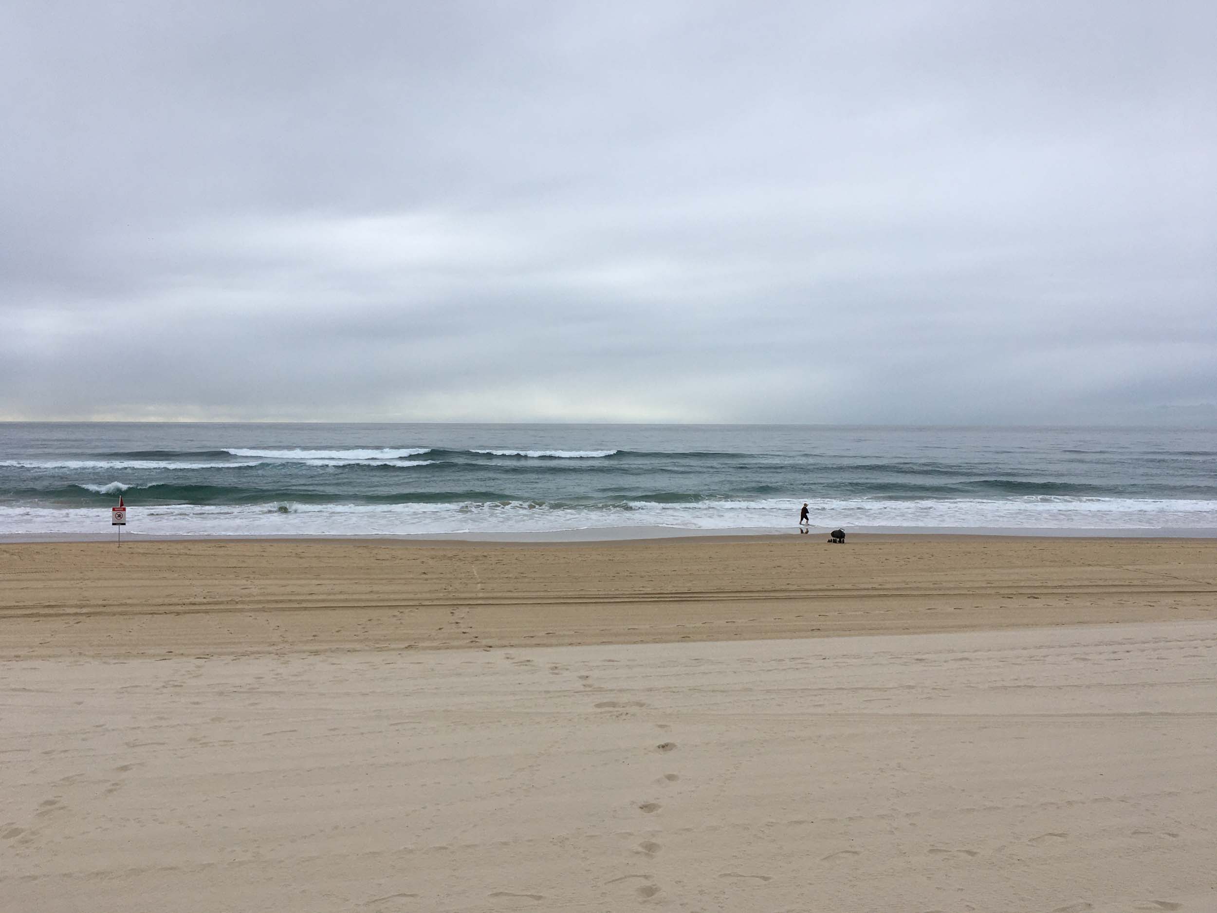 As the wind was blowing, the surf was very choppy and consequently, no surfers to be seen but a few fishermen.