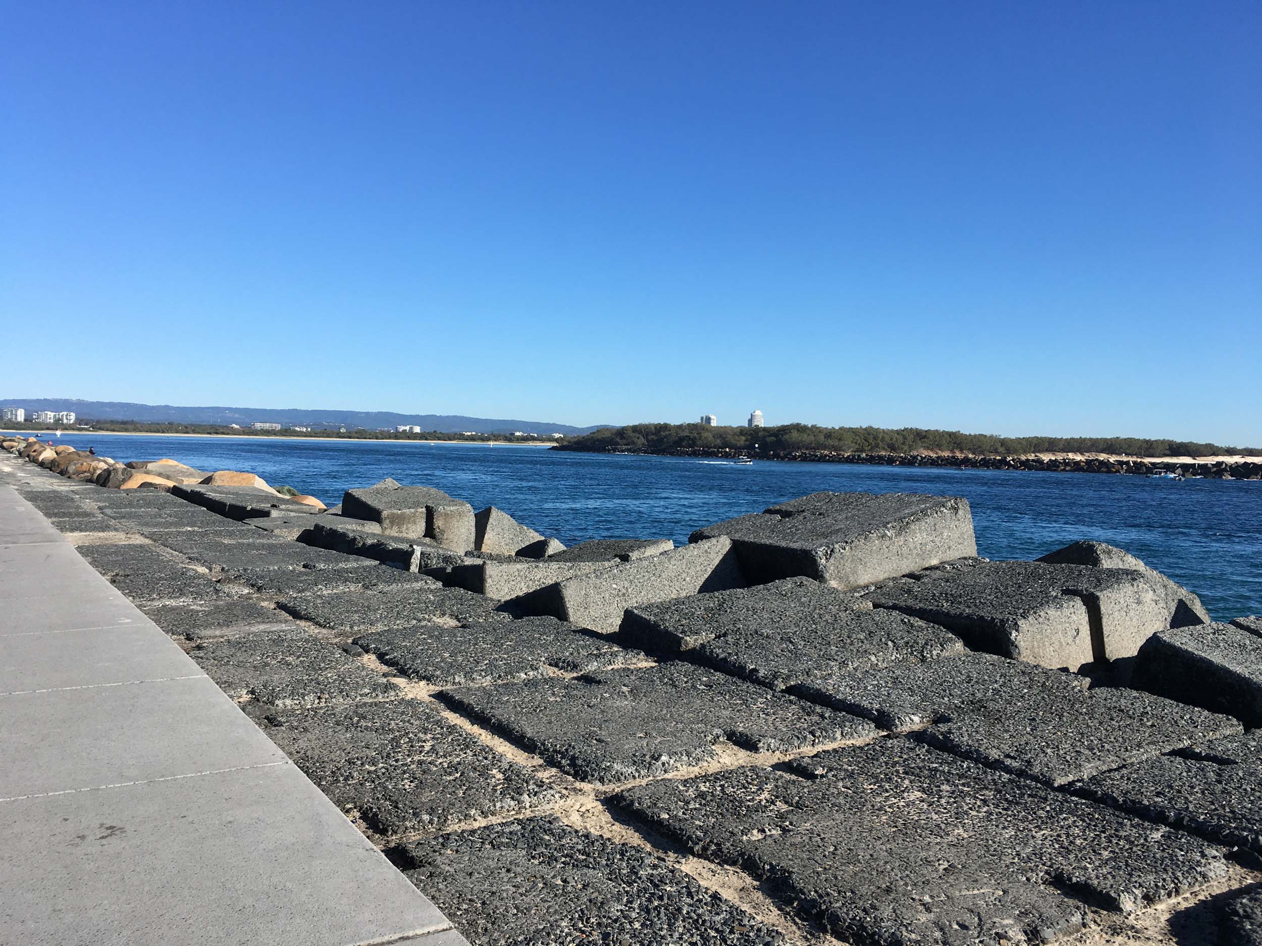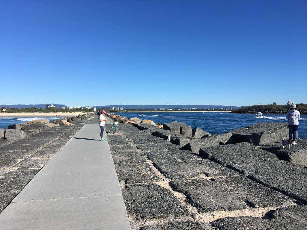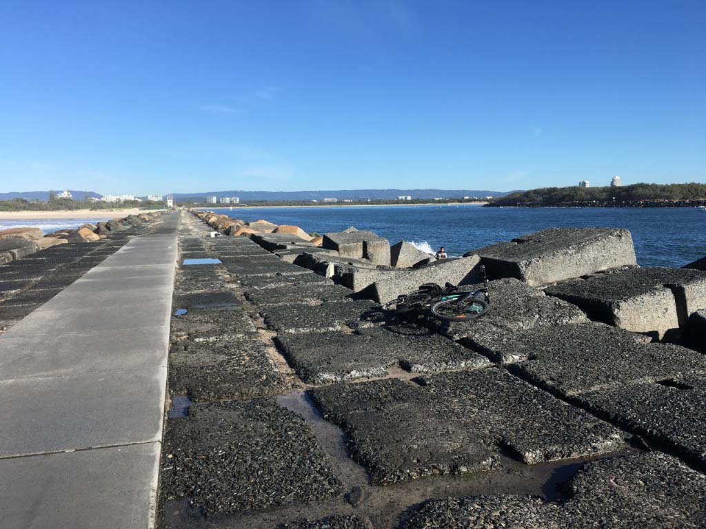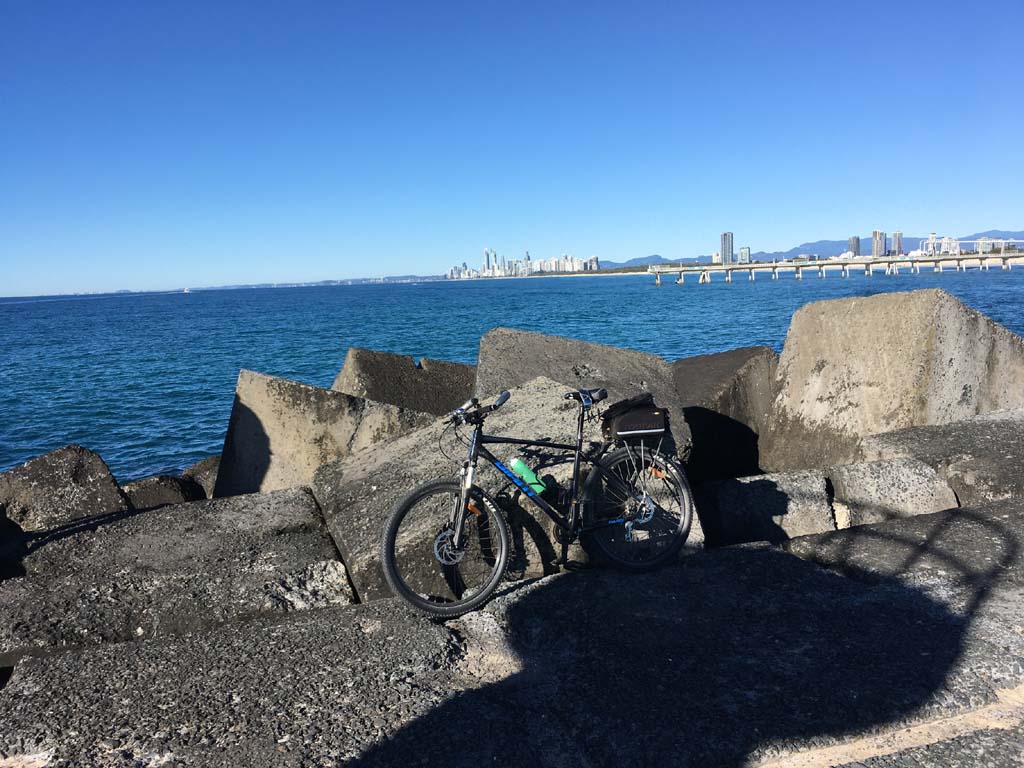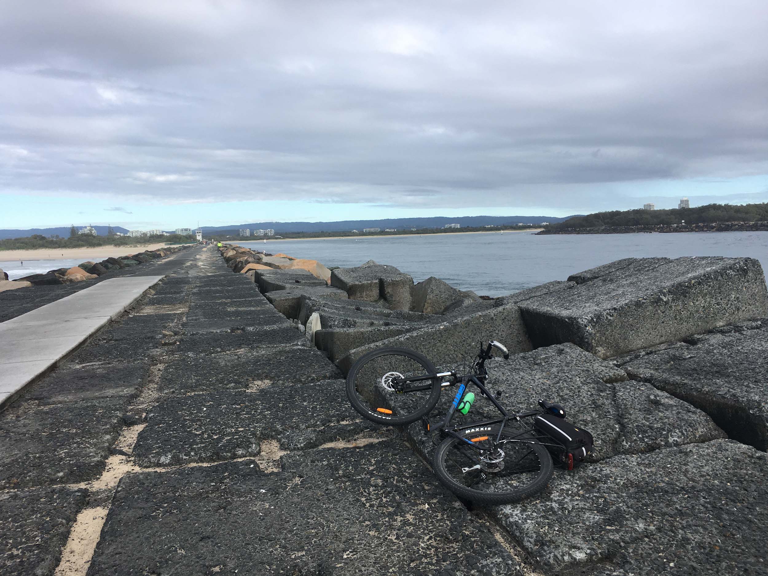 I rode along Federation Walk to the Seaway then rode a lap of Doug Jennings Park (1.5km), then another lap extending to the end of Moondarewa Spit (inland spit) (3.5km). Then another lap of the Doug Jennings Park, then out to the end of The Spit (seaward spit). Sat on my rock, and ate my banana. Then repeated my ride back to Moondarewa Spit and another lap of the shared path of the Doug Jennings Park. Then rode back along the gravel path again. Past the Southport SLSC. Arriving back at MacIntosh island, rode 1 lap, stopped for some water and took off my tights before heading homeward.