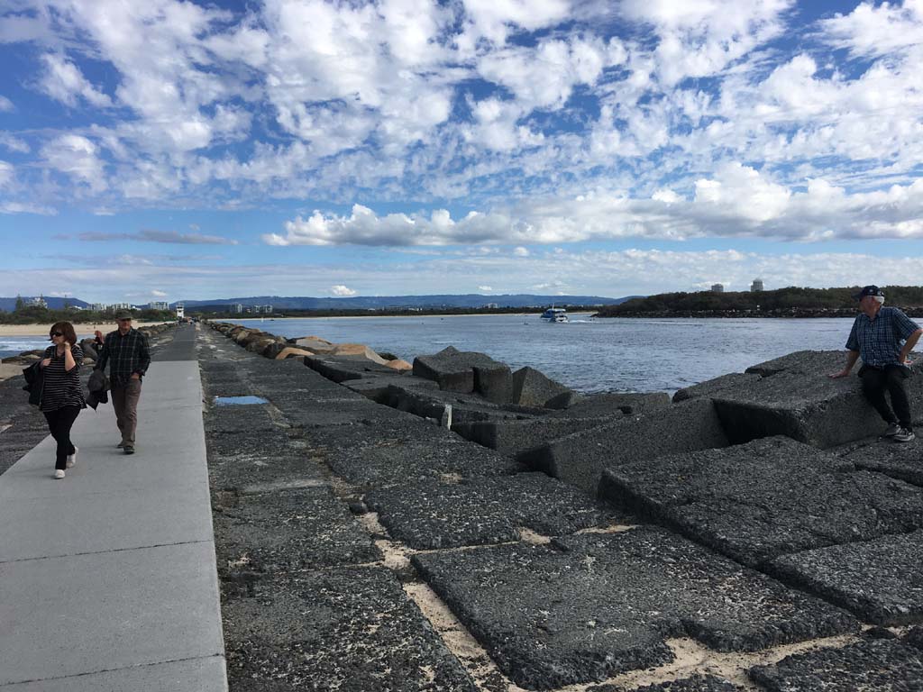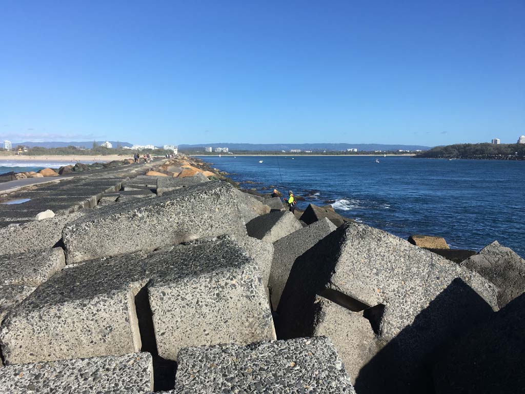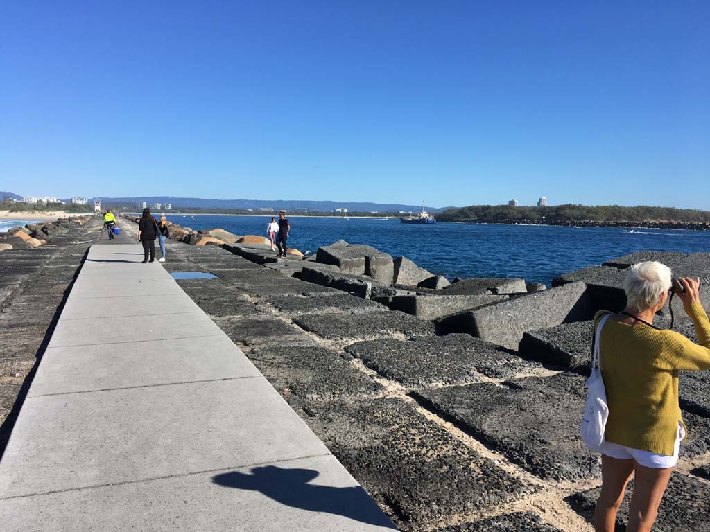 I rode along Federation Walk (the gravel track) The surf was coming in, in beautiful large sets, so there were heaps of surfers to be seen. Rode to the end of the Spit and got damp from the spray caused by the waves crashing against the Seawall. I could still sit on my rock and ate my banana.