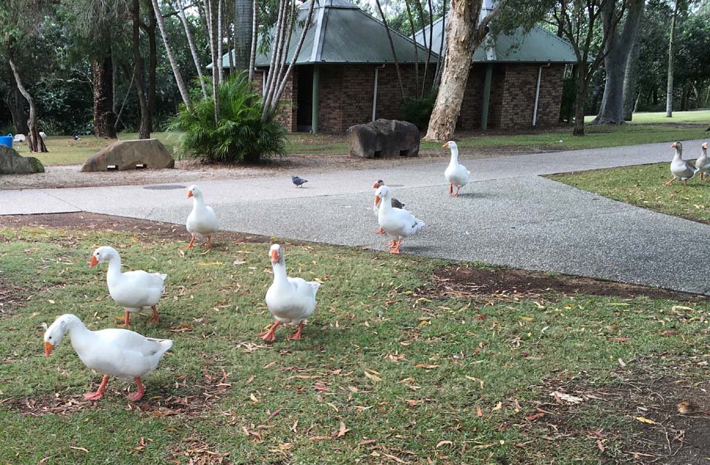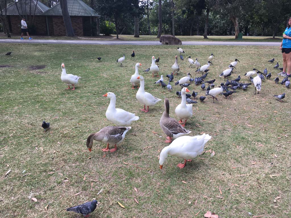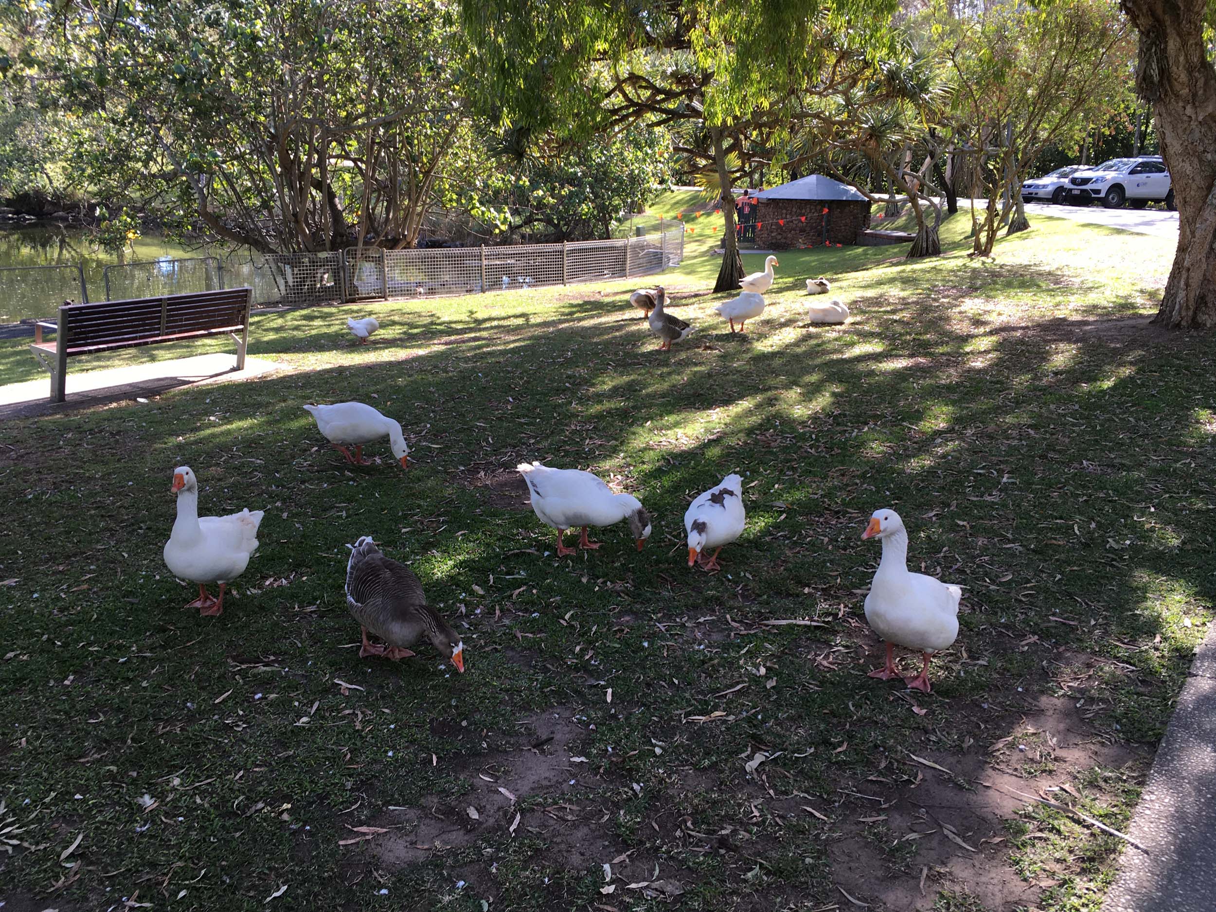 I rode back along Federation Walk to the Southport SLSC and then along the road to MacIntosh island. Stopped for some water and watched Goosey Lucy and 11 mates enjoying their weekday freedom.