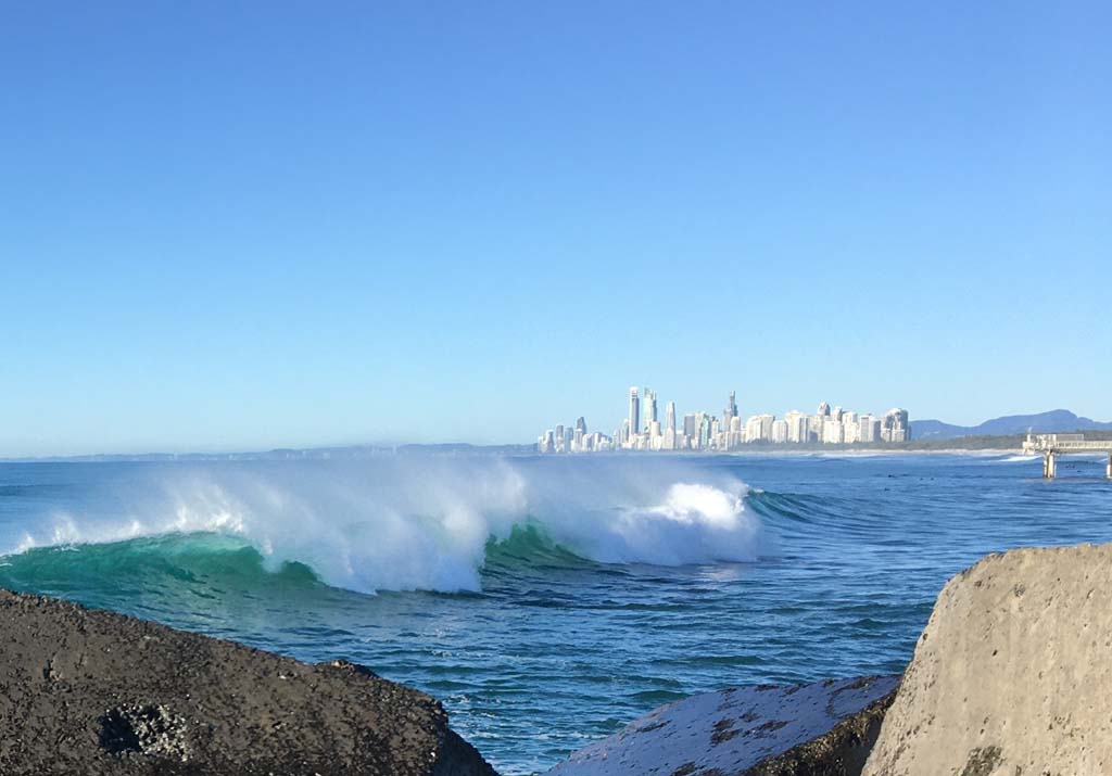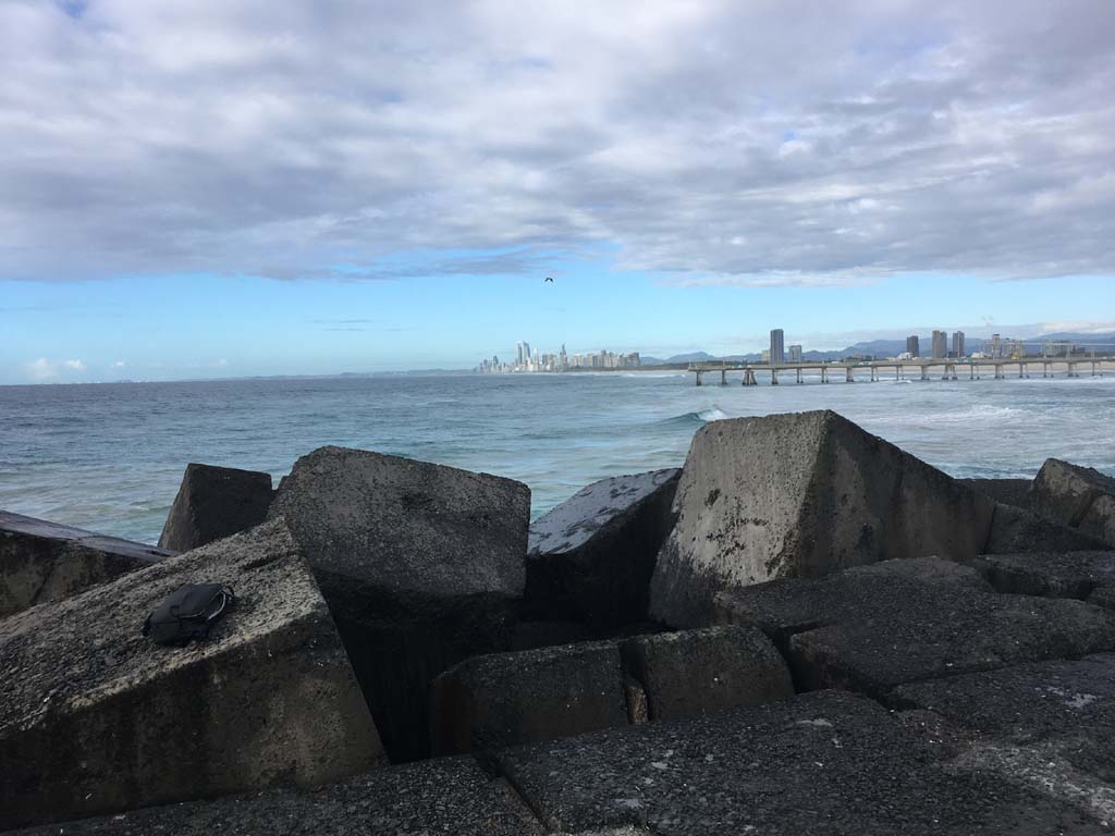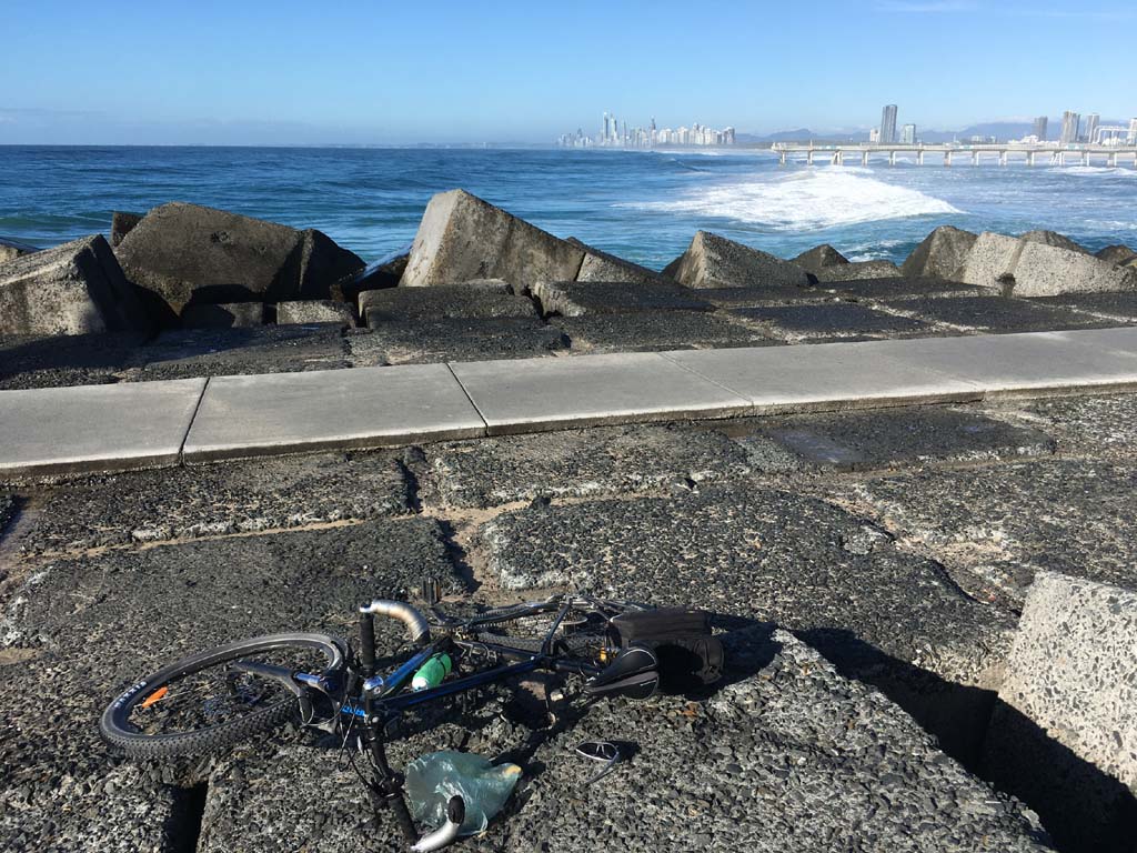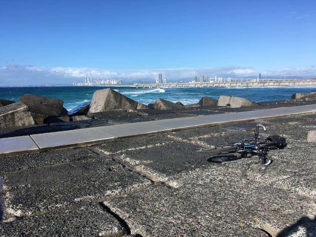I rode along Seaworld Drive with a nice tailwind, as it was blowing like buggery, the surf was very choppy, consequently, no surfers to be seen. Rode to the end of the Spit and dodged the spray from the waves crashing against the Seawall. I stood and drank some water. No bananas today, I forgot to buy some.
