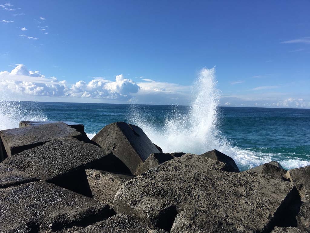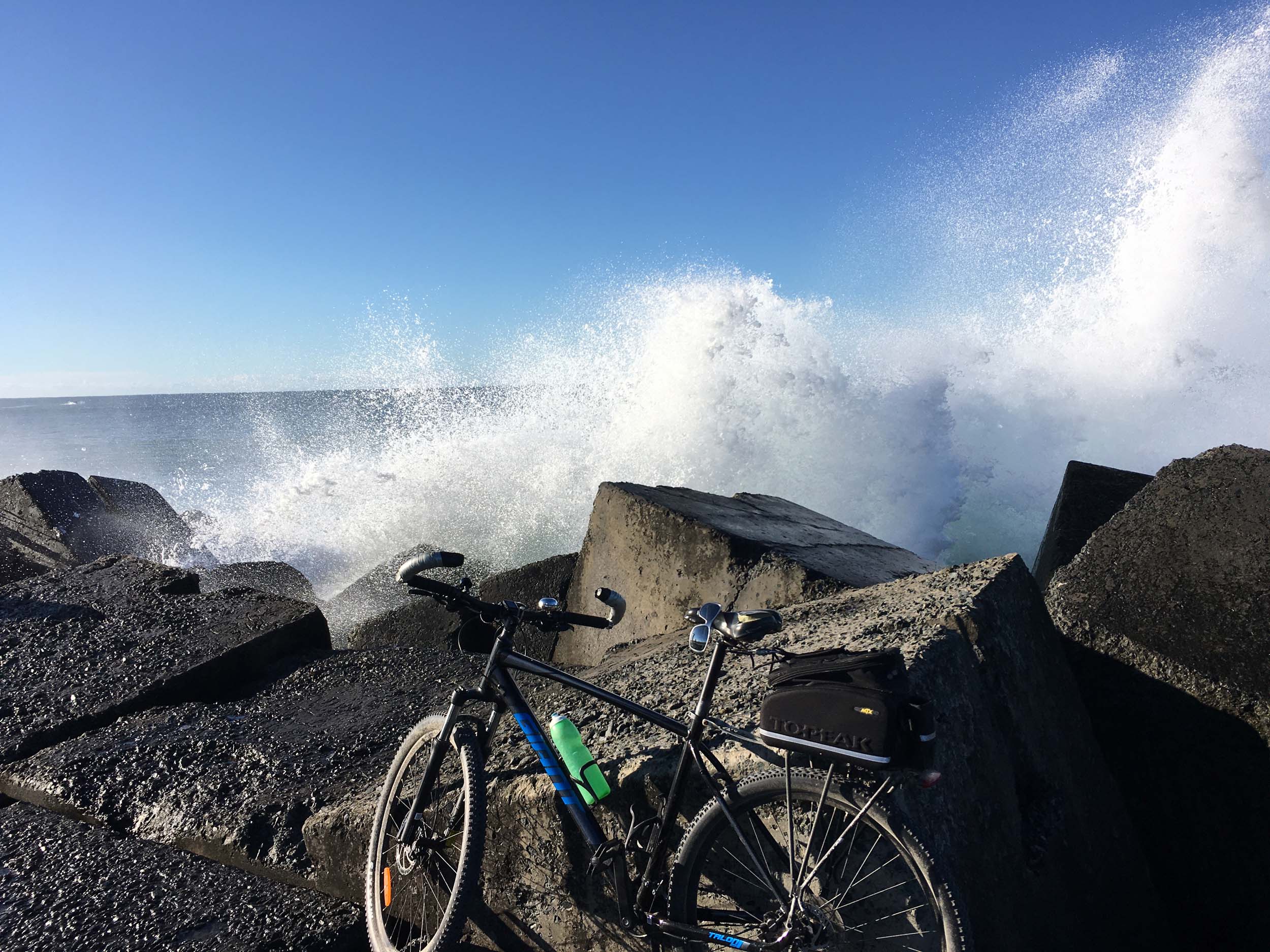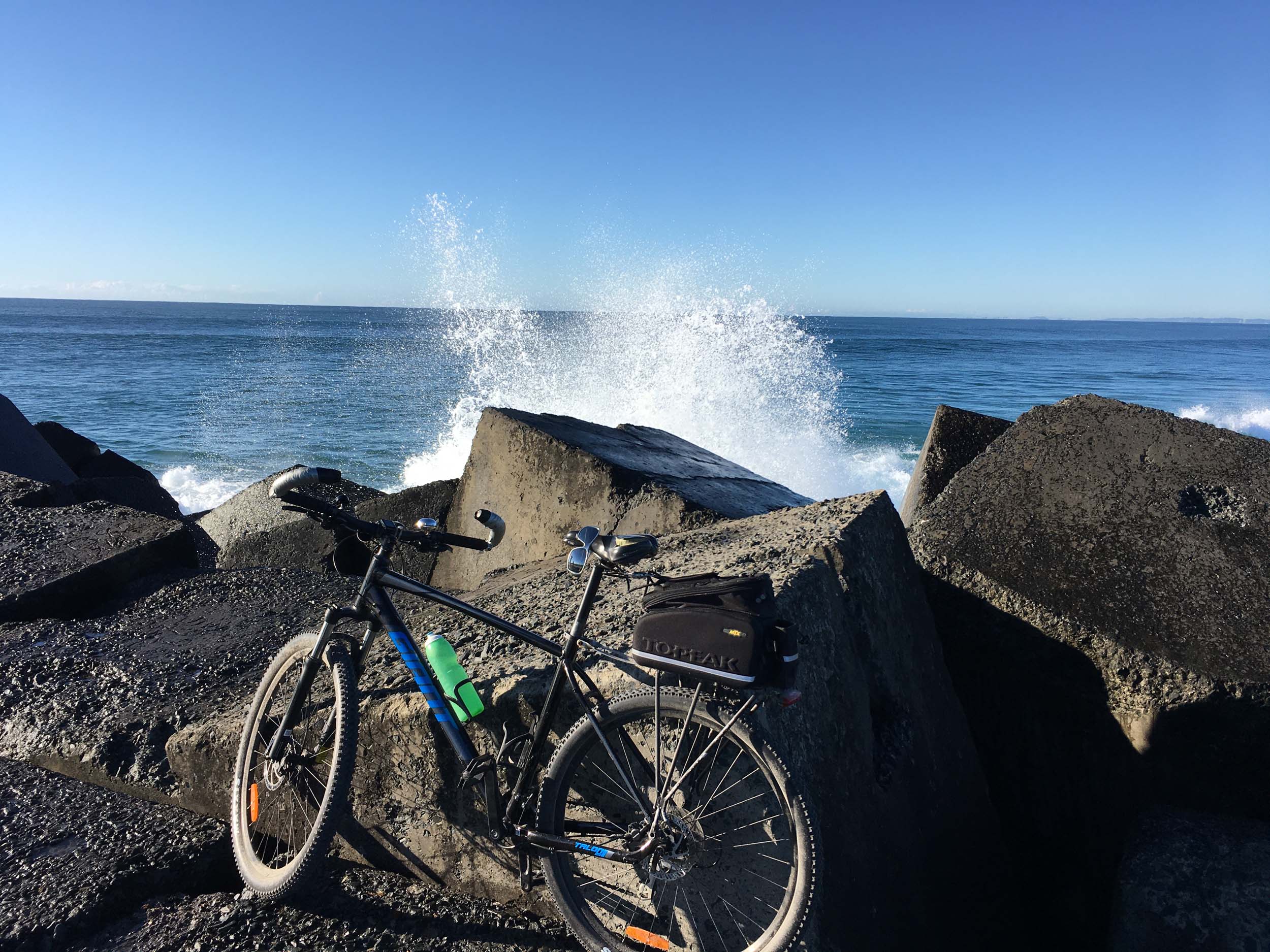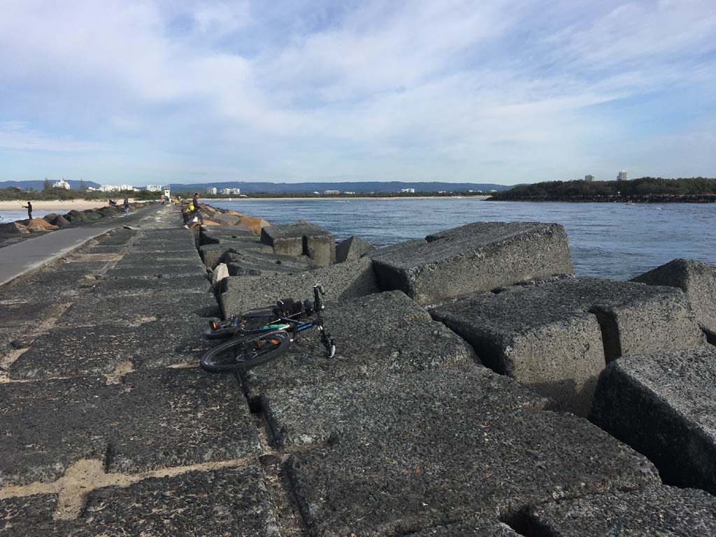 I rode along Federation Walk (the gravel track) The surf was large, so there were heaps of surfers to be seen. Rode to the end of the Spit and got damp from the spray caused by the waves crashing against the Seawall. I could still sit on my rock and ate my banana.