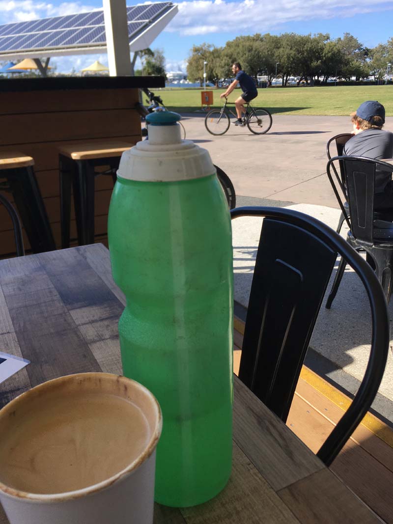 Arrived back at MacIntosh island, rode 3 laps, Goosey Lucy and mates were laying on the grass, quite relaxed. Stopped for some water before heading homeward. As I approached cafe Rockpool, there were 3 tables and chairs out the front with nobody there, SO I stopped for a coffee. It was great.