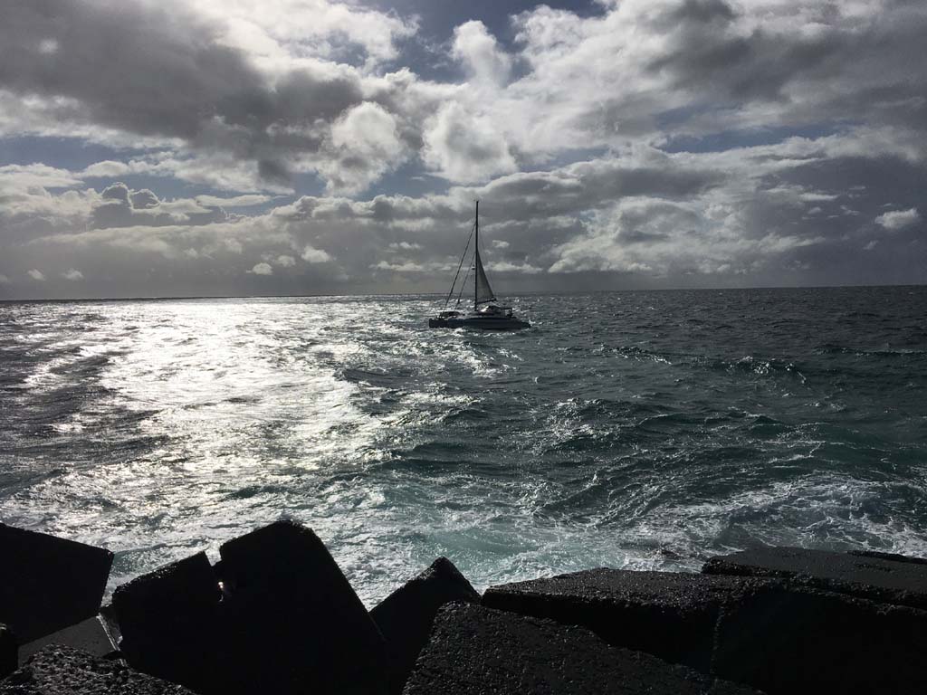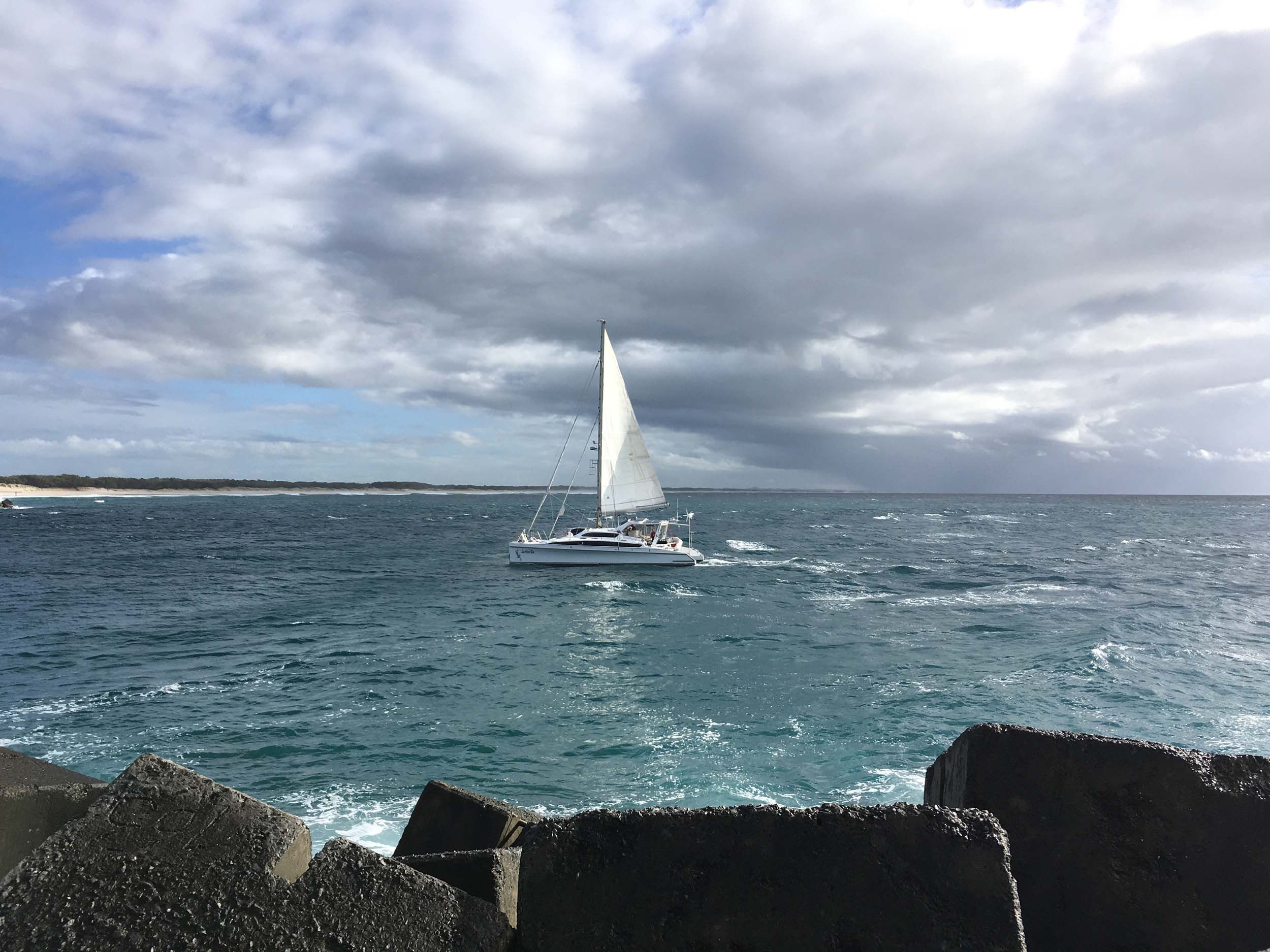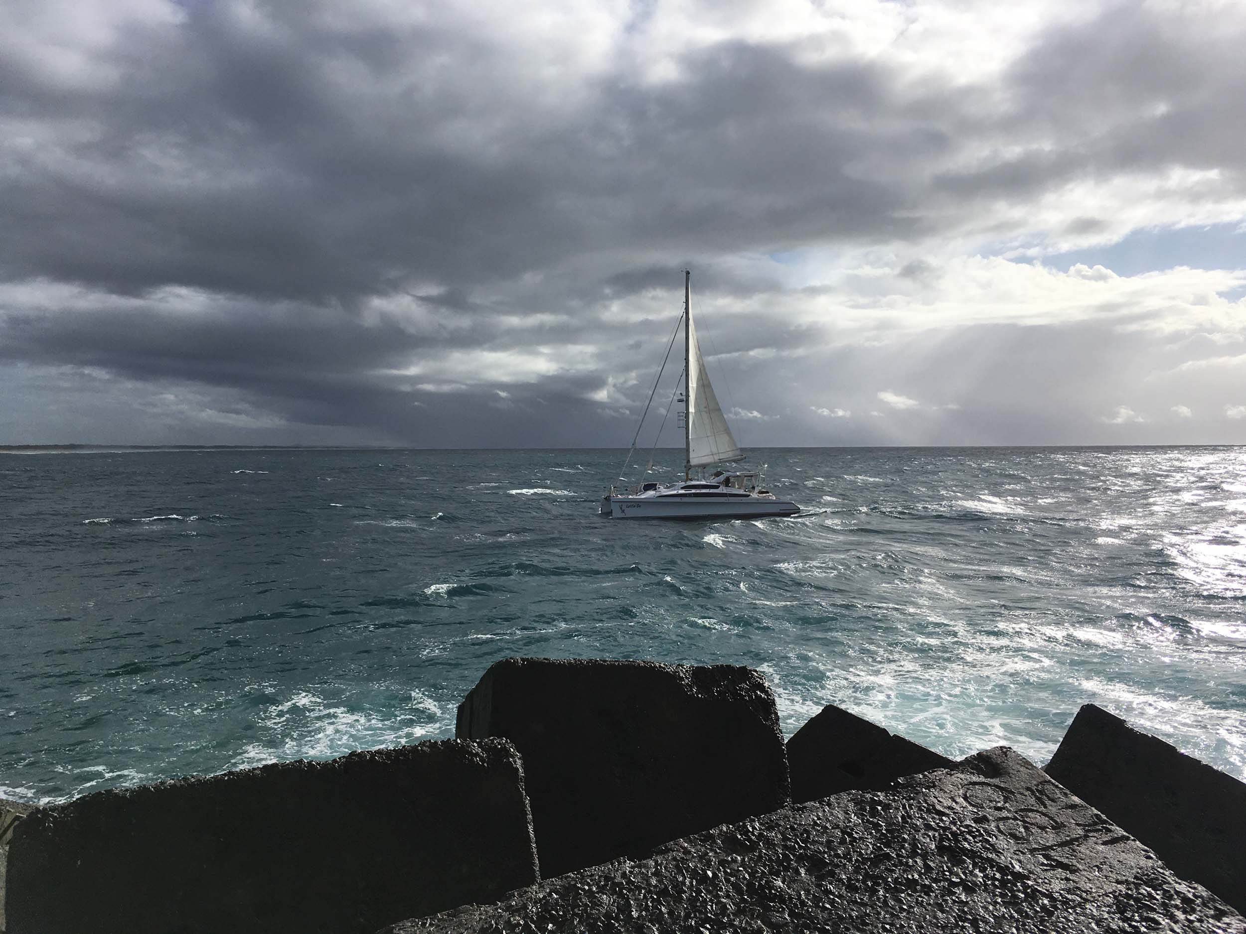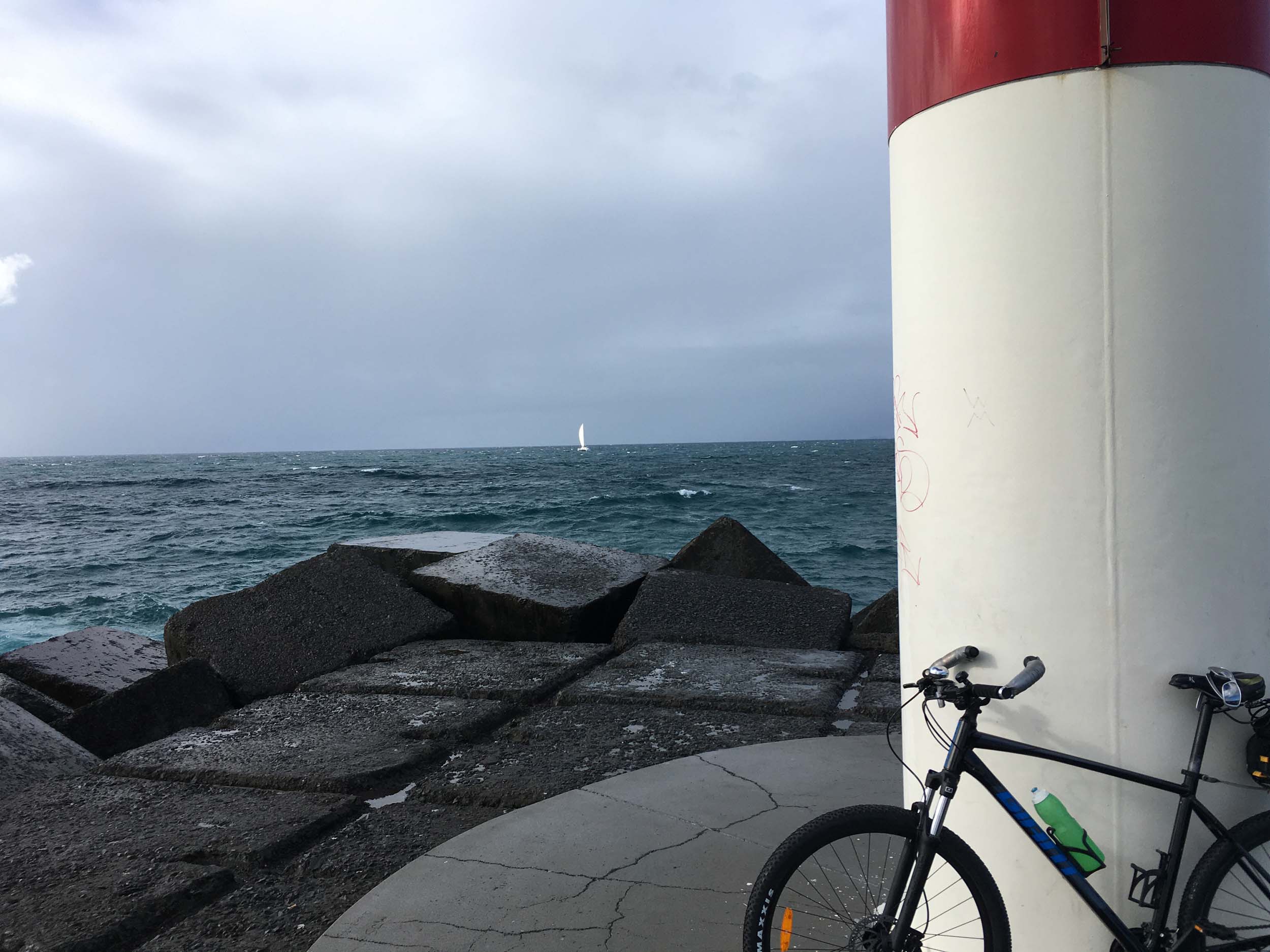 I rode along Federation Walk (the gravel track) As it was blowing like buggery, the surf was very choppy, consequently, no surfers to be seen. Rode to the end of the Spit and got wet from the waves crashing against the Seawall. I didn't sit on my rock as the spray was covering the seawall. I stand in the lee of the beacon and ate one banana and that was an effort with the wind blowing like buggery. It was 8:30am when I was at the end of the Spit, the BOM at The Spit showed gusts of 41kph. I believe it. While at The end of the Spit, I watched a catamaran sail under mainsail only from down South and turn into the seaway.