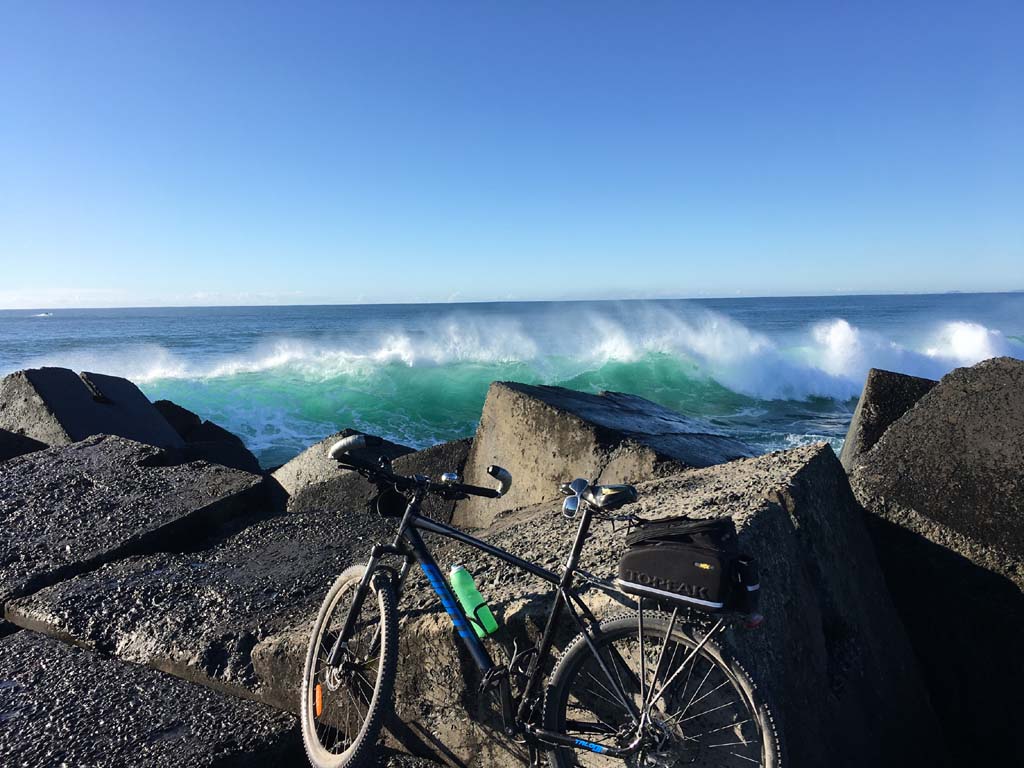 I rode along Federation Walk (the gravel track) As the wind was light, the swell was great for surfing and all the beaches were packed with surfers. Rode to the end of the Spit and sat on my rock and ate my 2 bananas, I rode to the end of the other Spit (Moondarewa), back around the shared path that surround the Doug Jennings park.
