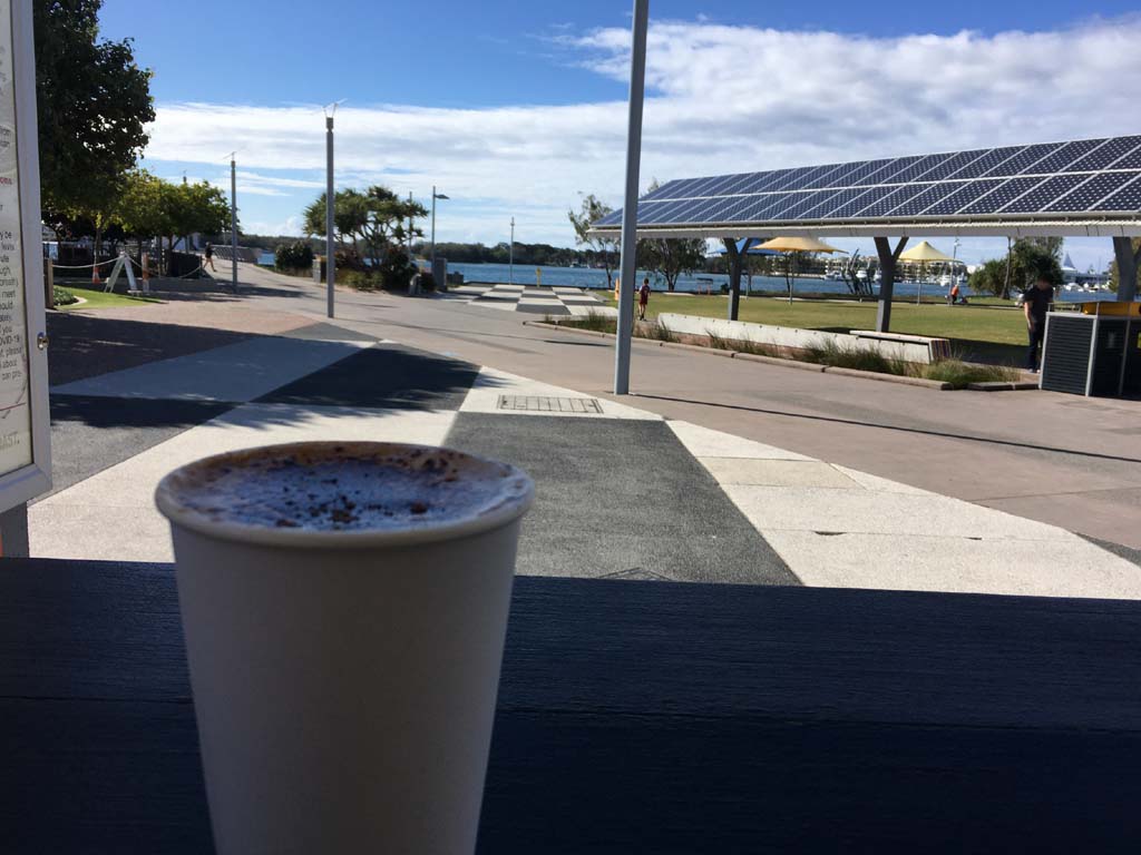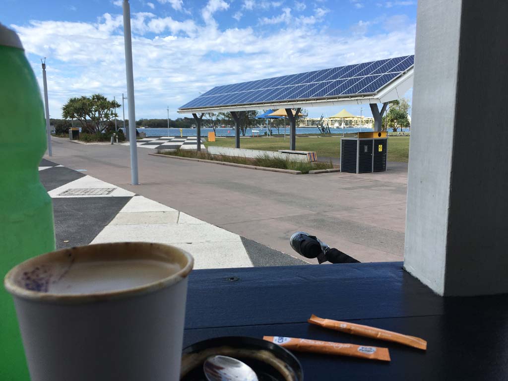 I rode along Federation Walk (the gravel track), the whole way back to Southport SLSC. Arrived back at MacIntosh island, rode 2 laps, Goosey Lucy and mates were locked on their island, and evrything was quiet. Stopped for some water before heading homeward. As I approached cafe Rockpool, there were 3 tables and chairs out the front with nobody there, SO I stopped for a coffee. It was great. Within 2 minutes of me ordering the joint was jumping at least 15 parents and kids arrived. SO my thought of a 'quiet' coffee evaporated.