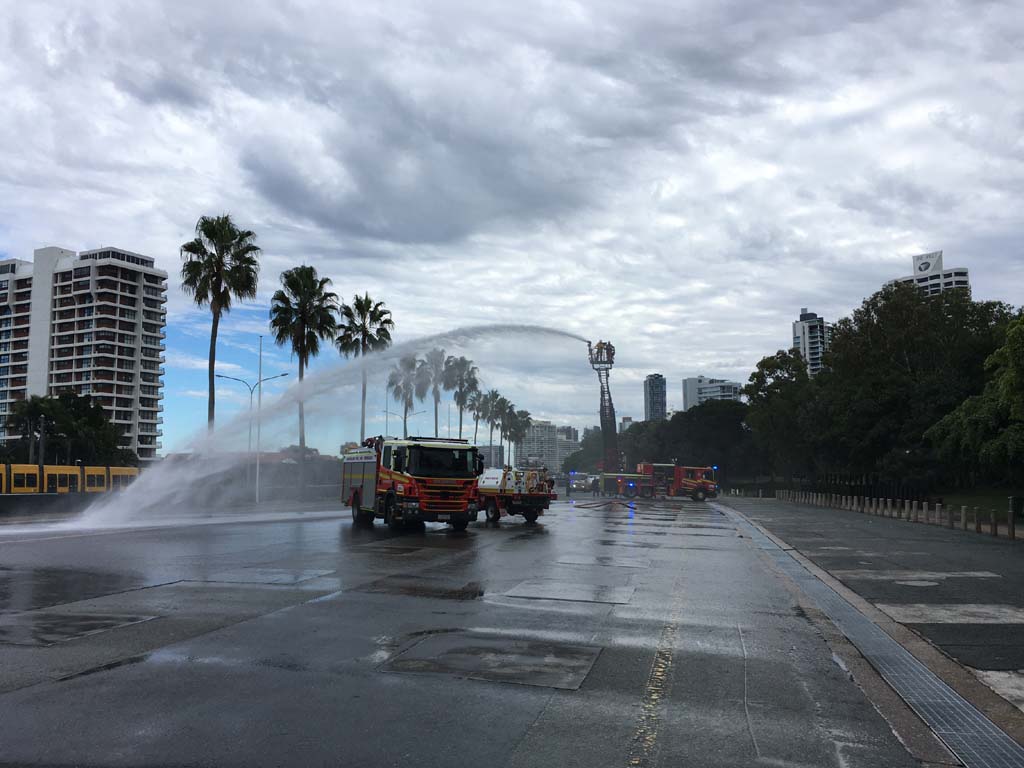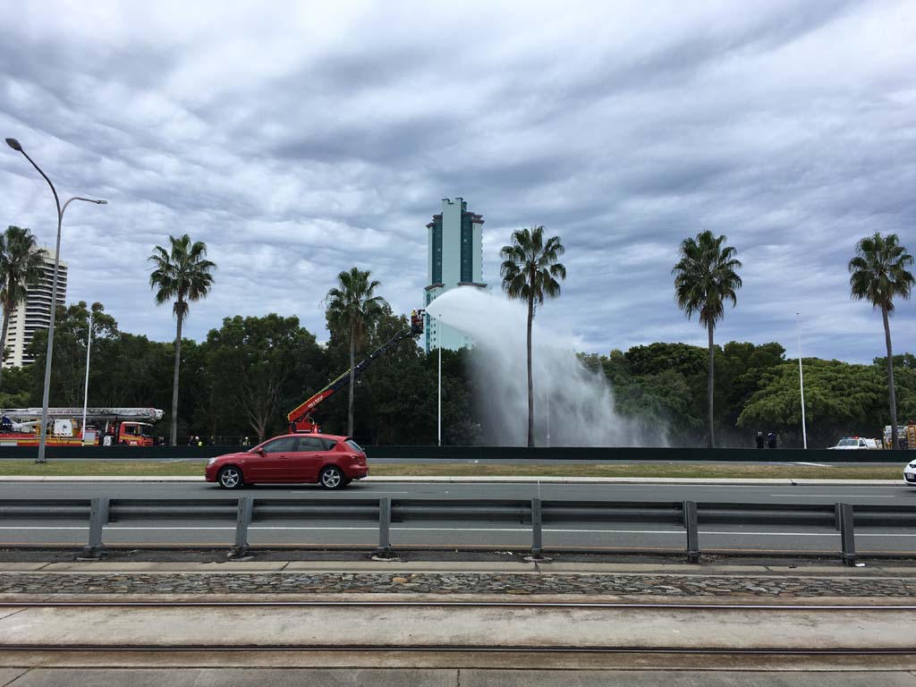 Then rode back along the gravel path again. Past the Southport SLSC. Arriving back at MacIntosh island, I noticed the Firemen and their big truck. I stopped and chatted to them, then rode 1 lap, stopped for some water before heading homeward. As I passed the firetruck, I stopped and took photos. As I was doing this the head guy walked over and started telling me about their $1.8m brand new firetruck with an extendable ladder upto 33m, today was at 22m. He also said they were training the new firemen to climb the ladder. Nice guy.