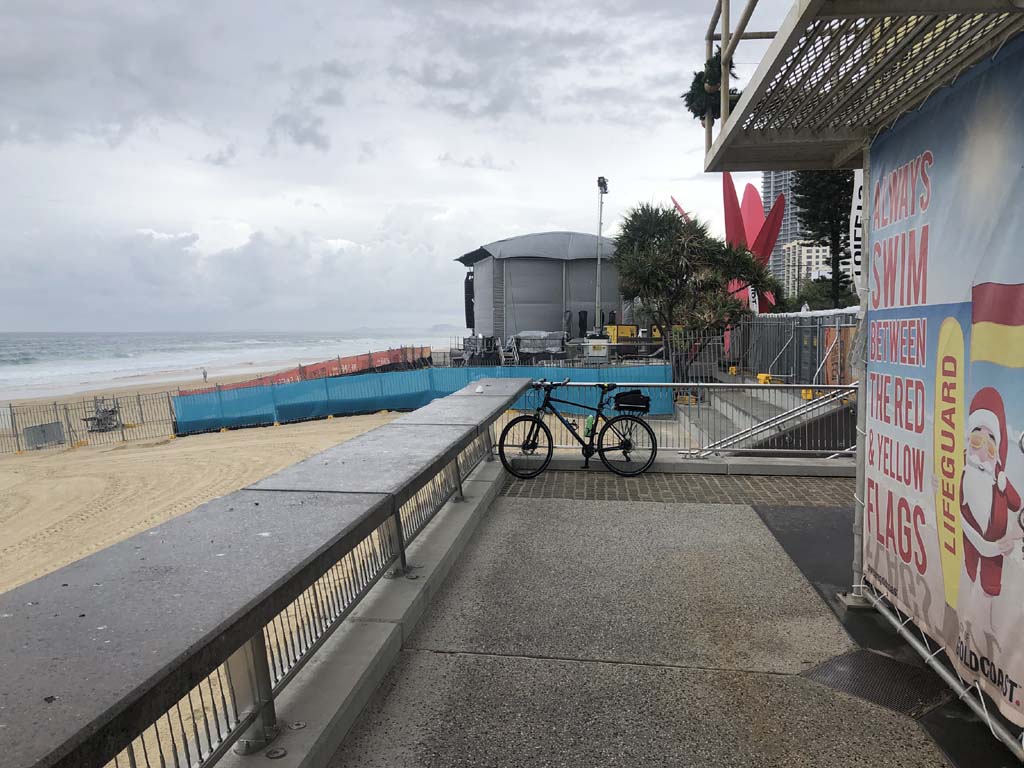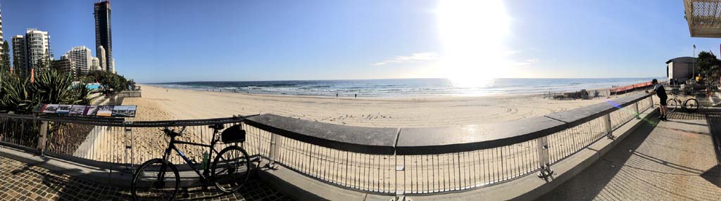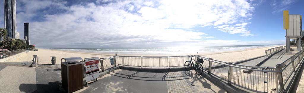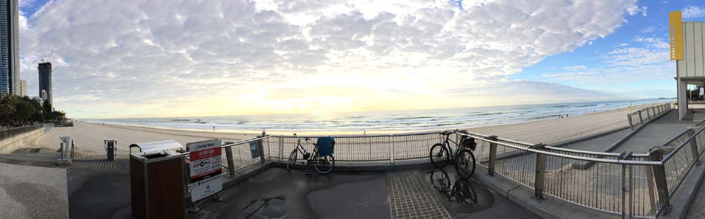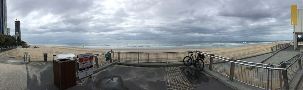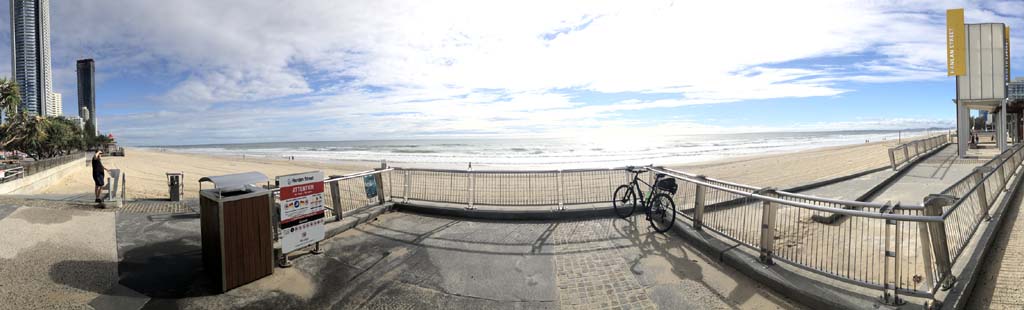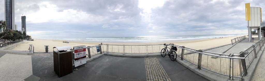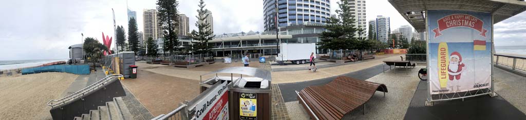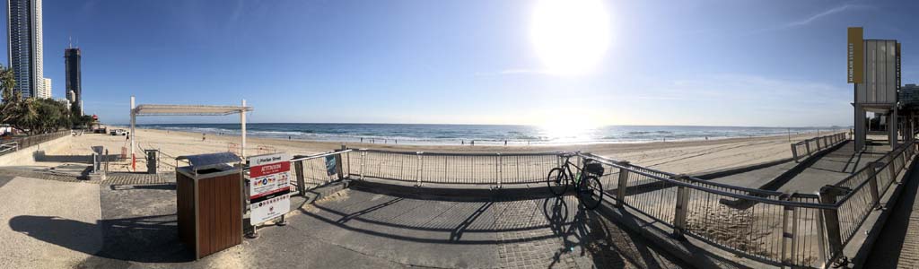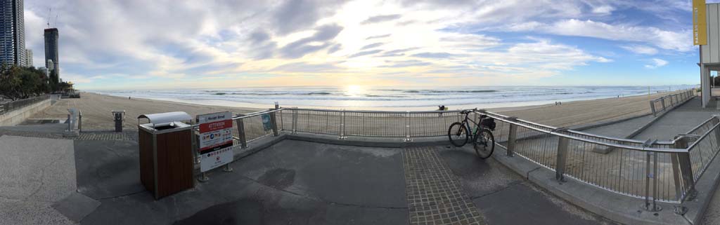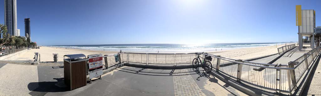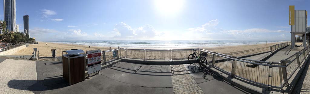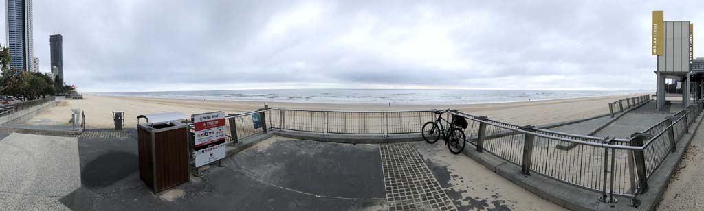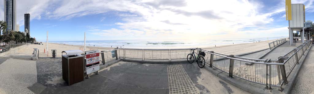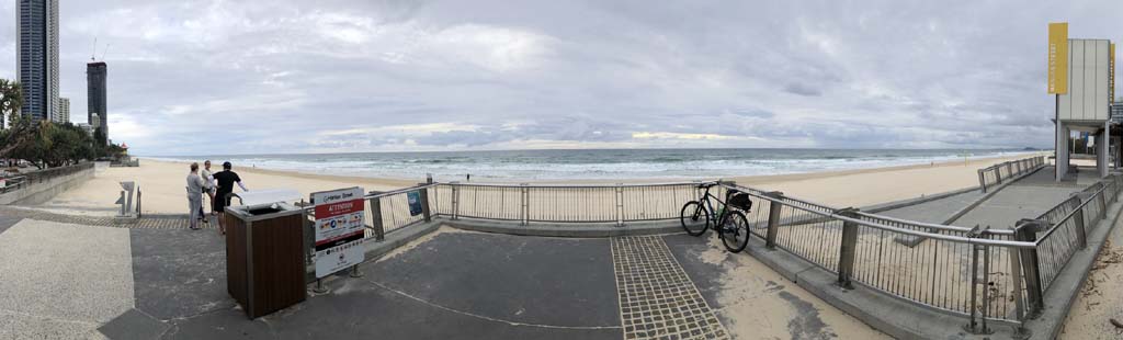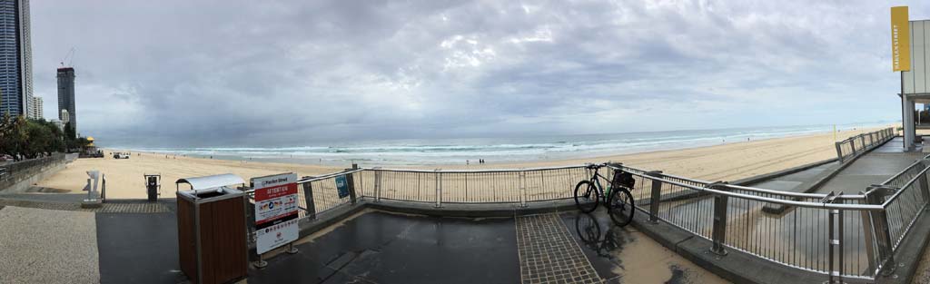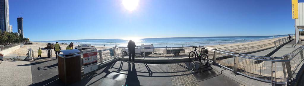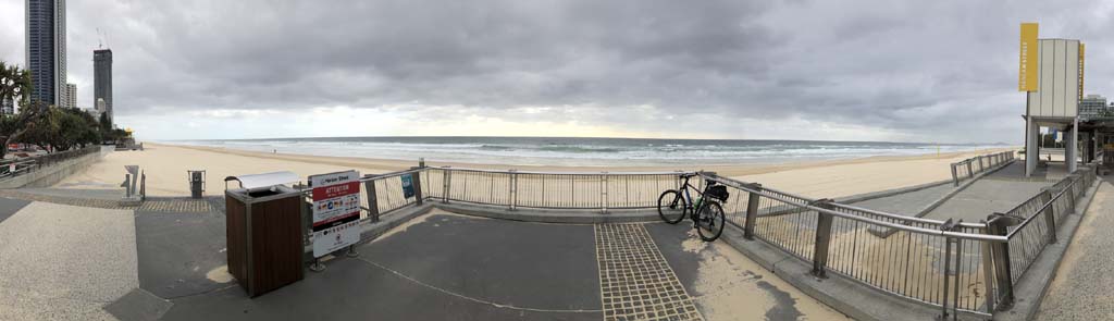 As usual, I rode Northward, to my Lands End turnaround point. Continuing through the Broadwater Parklands. I continued down to MacIntosh Is, did a lap. Over the Bridge at Narrowneck then along the Shared Path, to my normal spot at Surfers, to take my weather photos. Except all the shared path at Surfers is fenced off while they setup for Schoollies week. I headed off to the Spit along the various shared paths. Being early, the shared paths were nearly empty and the Schoollies must have still been in bed.