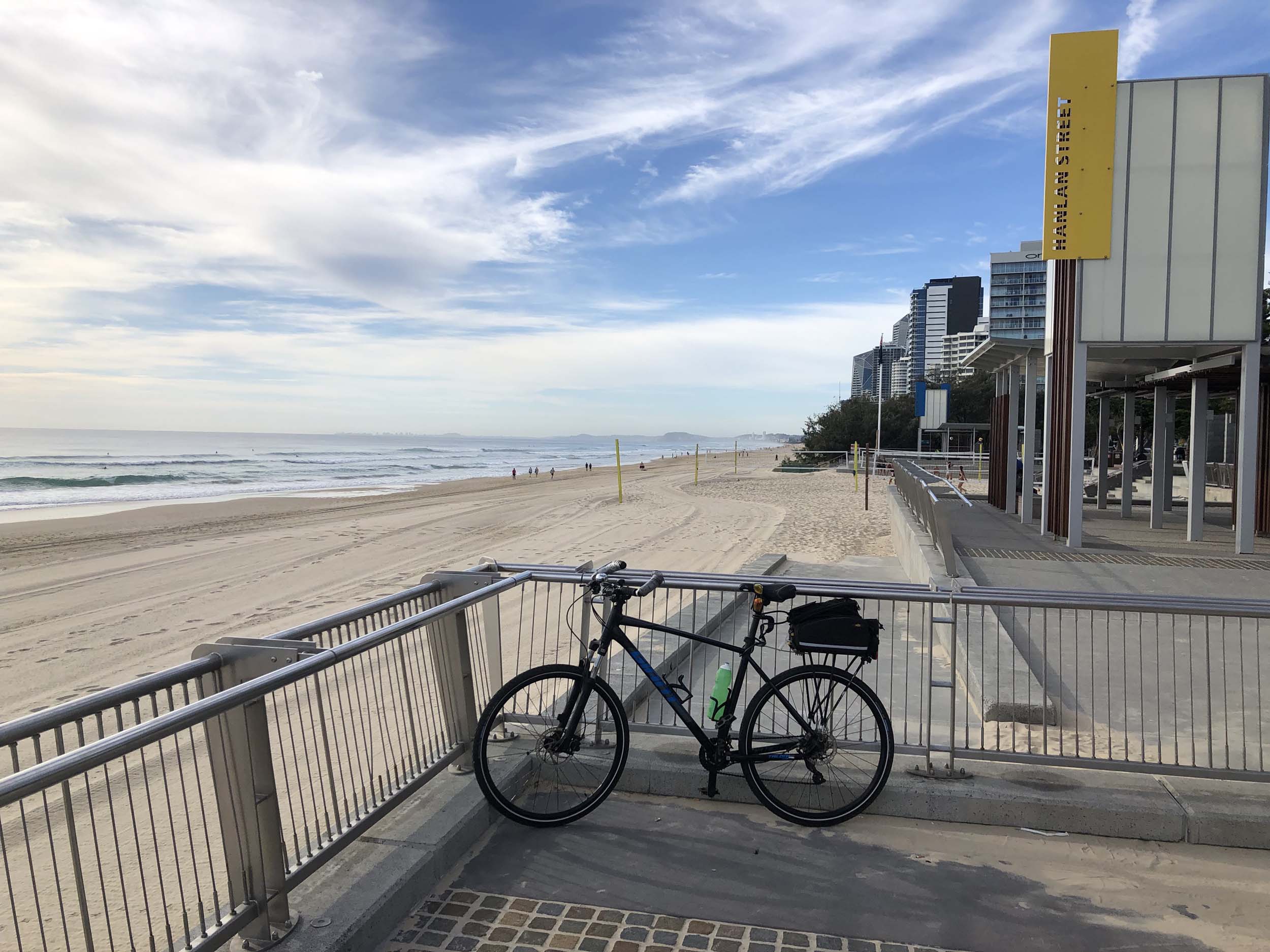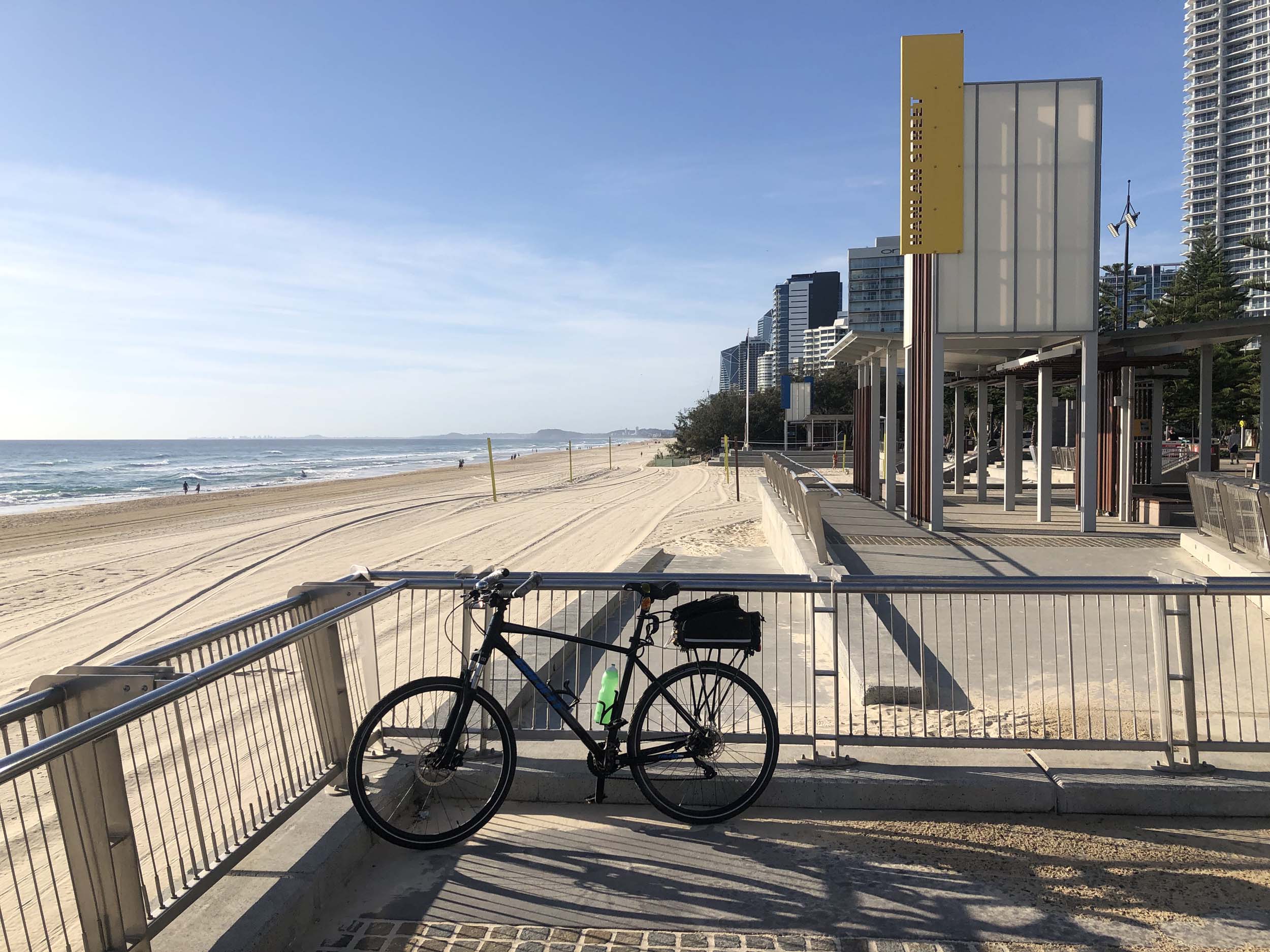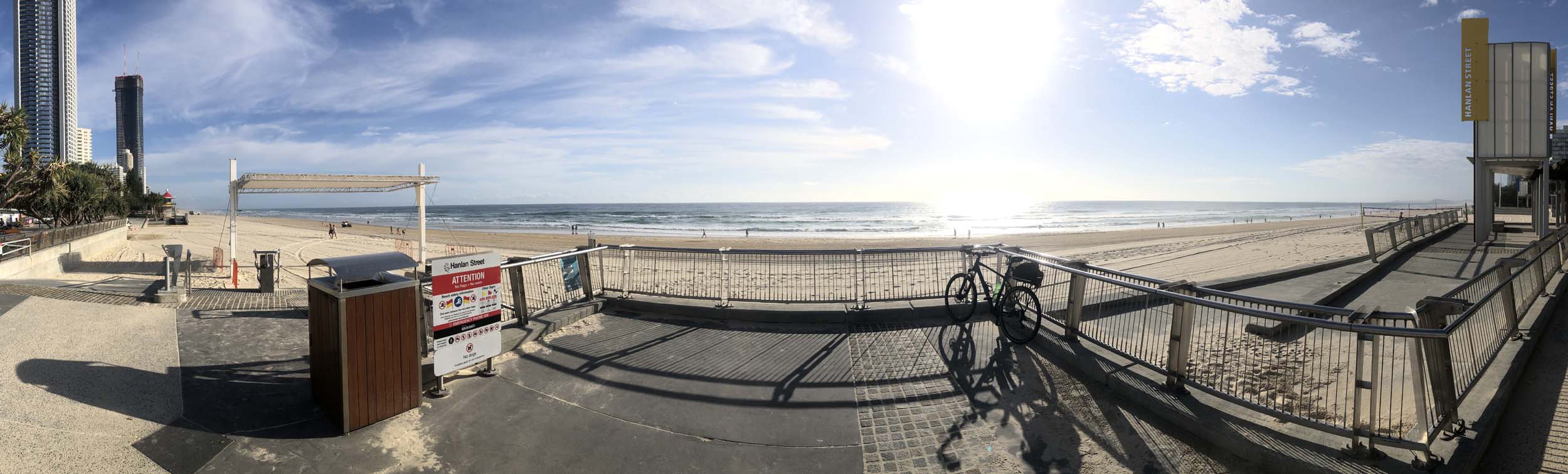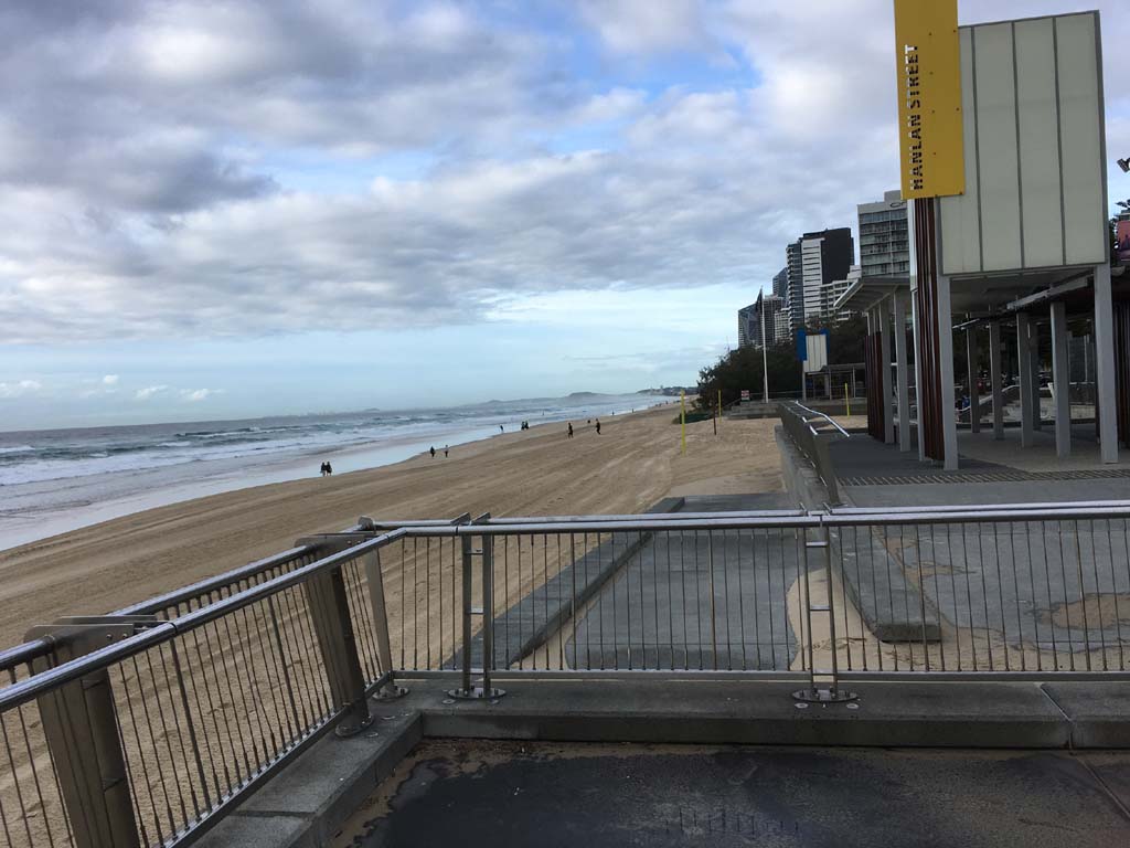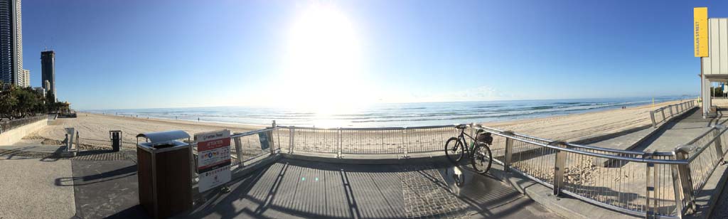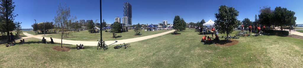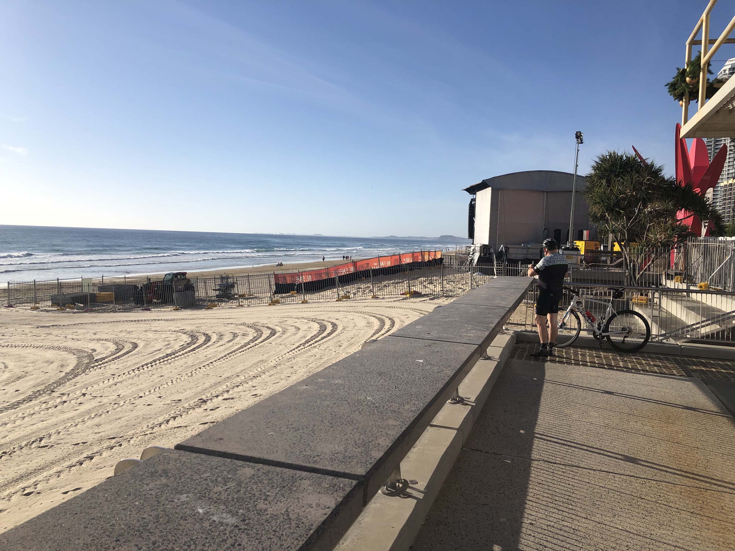 As usual, I rode Northward, to my Lands End turnaround point. Continuing through the Broadwater Parklands. I continued down to MacIntosh Is, did a lap. Over the Bridge at Narrowneck then along the Shared Path, to my normal spot at Surfers, to take my weather photos. Except all the shared path at Surfers is fenced off while they setup for Schoollies week. I headed off to the Spit along the various shared paths. Being early, the shared paths were nearly empty and the Schoollies must have still been in bed.
