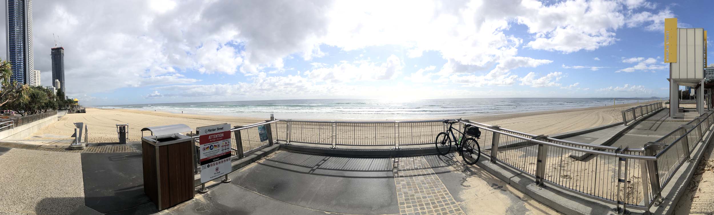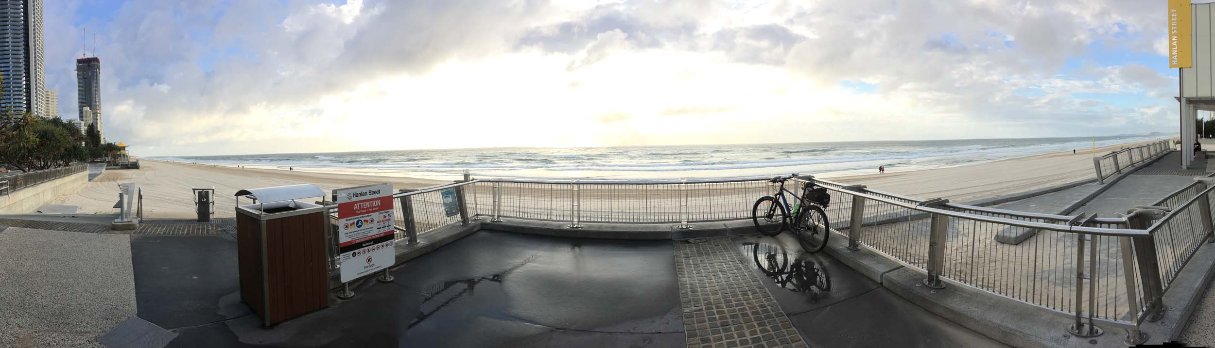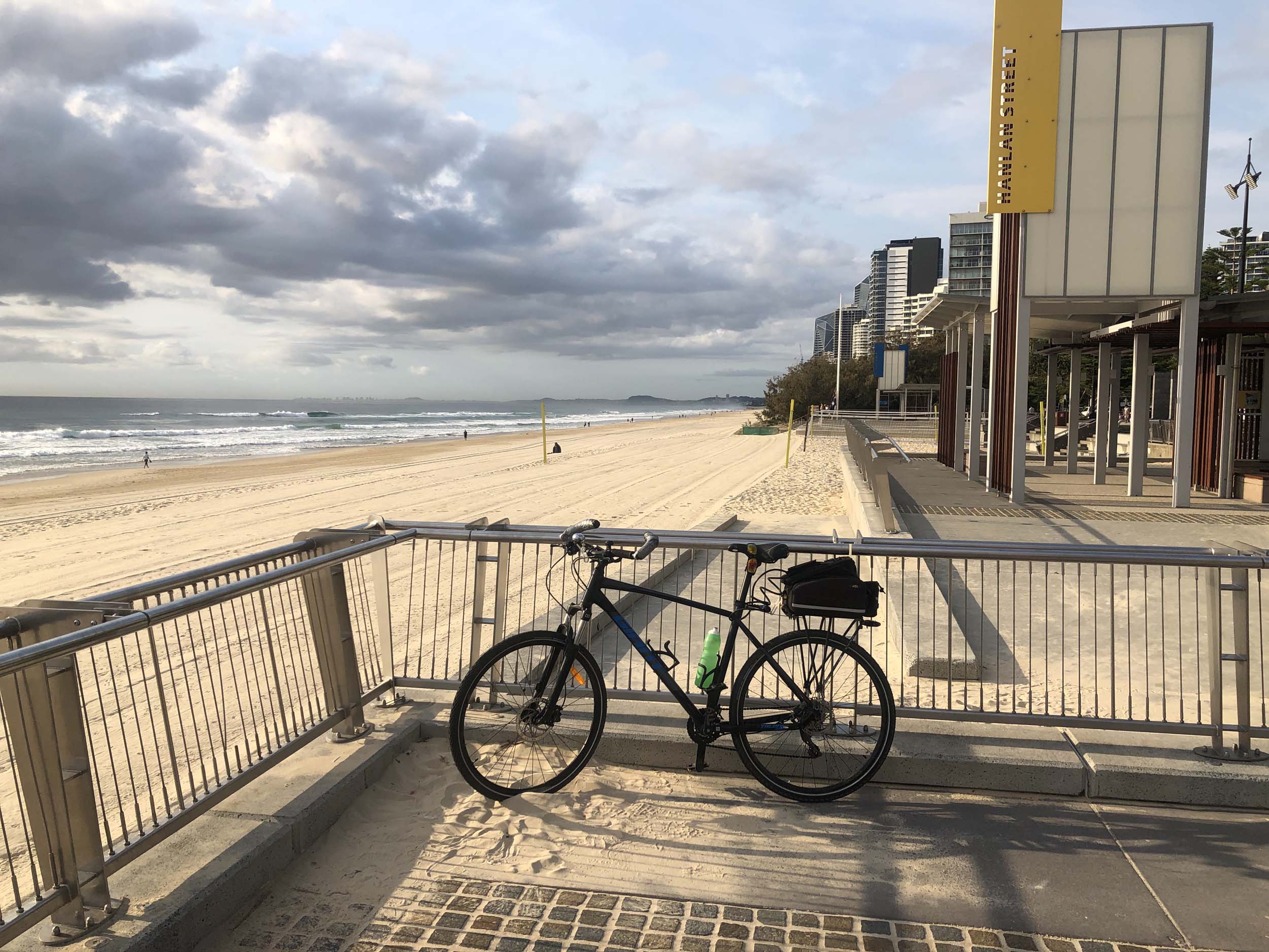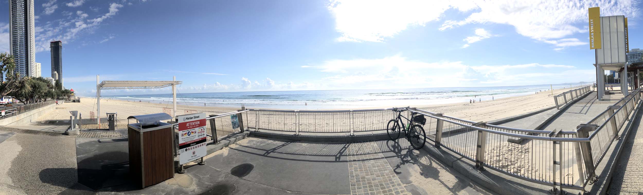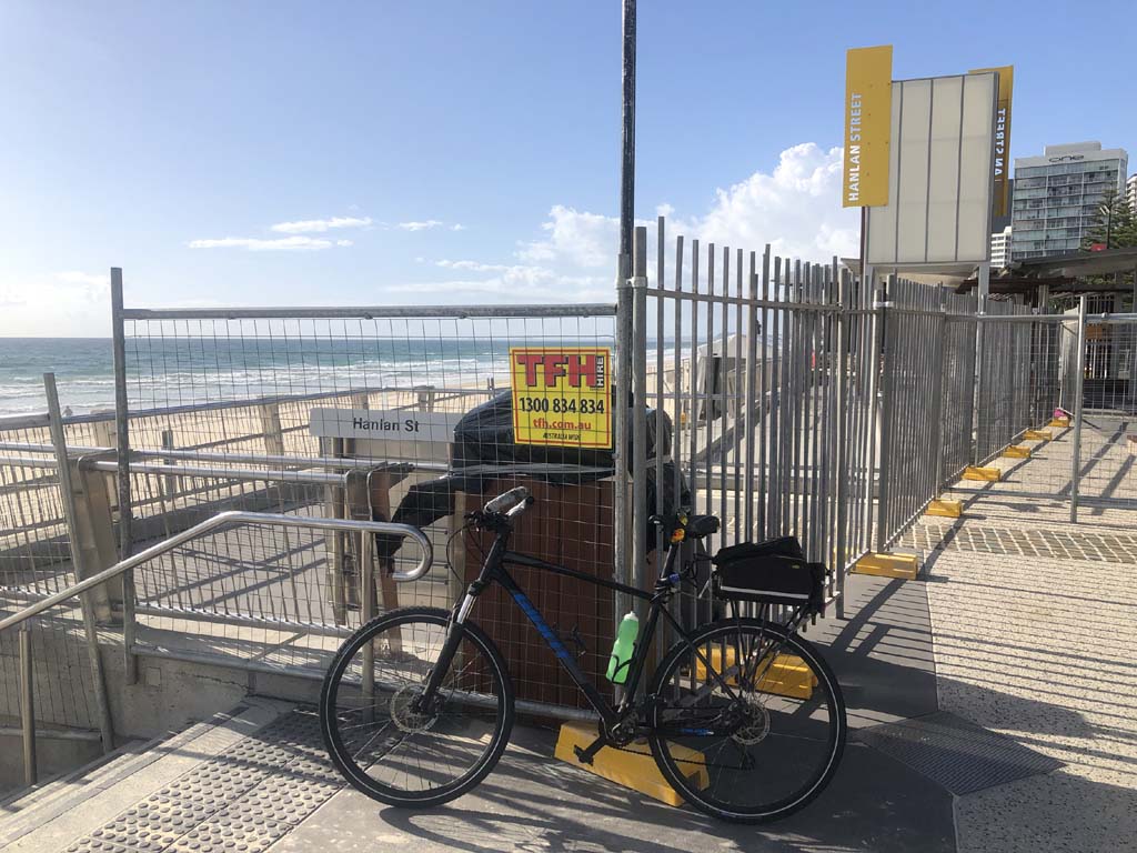 As usual, I rode Northward, to my Lands End turnaround point. Continuing through the Broadwater Parklands. I continued down to MacIntosh Is, did a lap. Over the Bridge at Narrowneck then along the Shared Path, to my normal spot at Surfers, to take my weather photos. Except all the shared path at Surfers is fenced off while they setup for Schoollies week. I headed off to the Spit along the various shared paths. Being early, the shared paths were nearly empty and the Schoollies must have still been in bed.