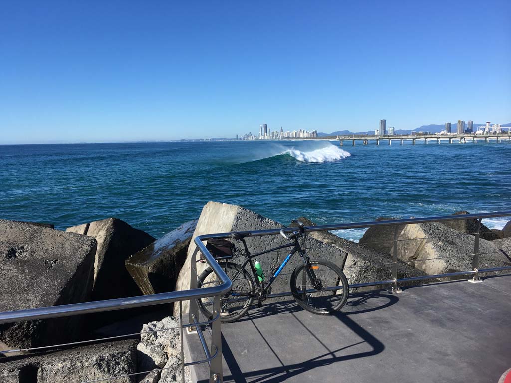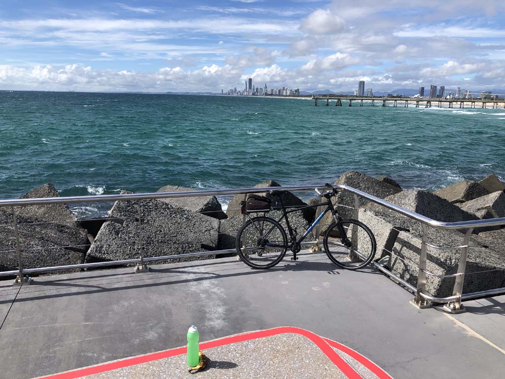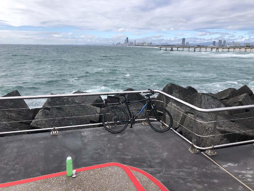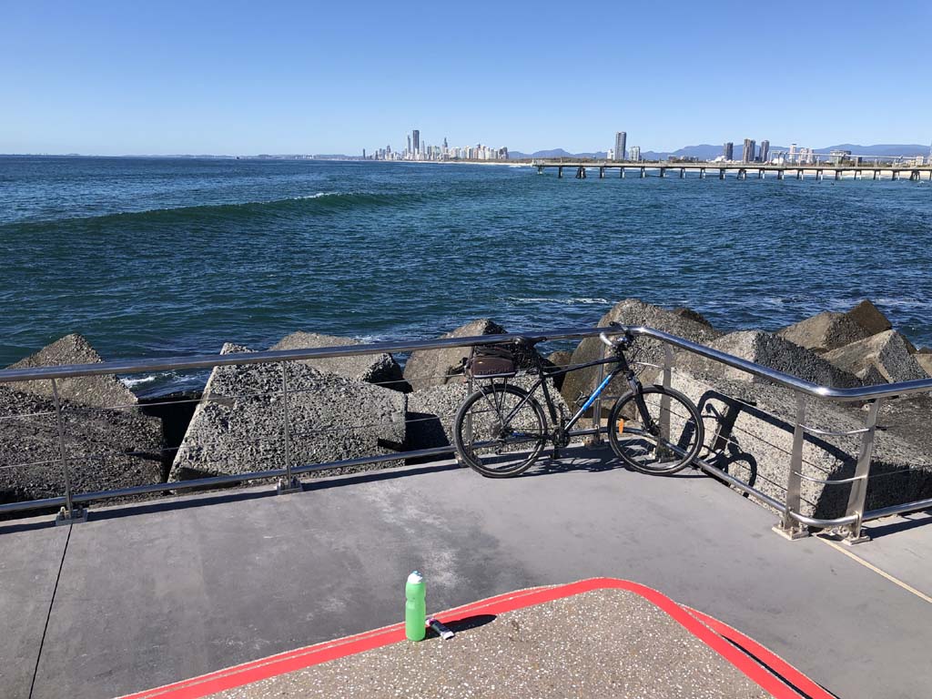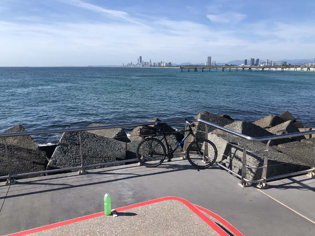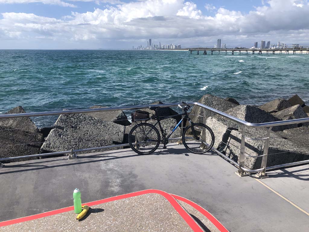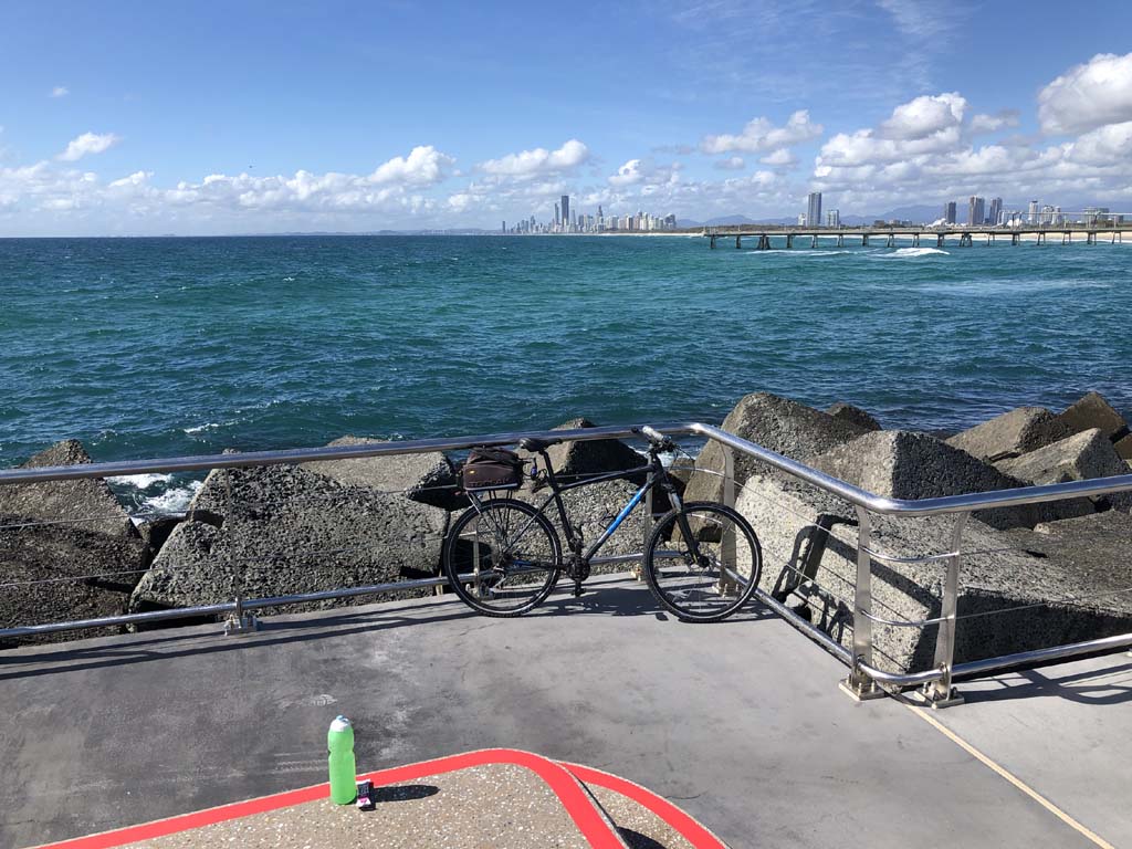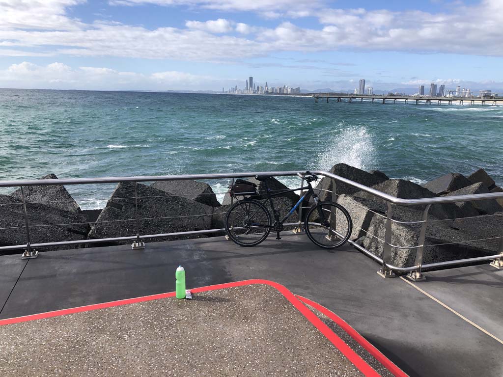 Home to Turnaround Pt down to Surfers via GC600 Park to Surfers to The Spit (both ends - twice) then back through GC600 Park back to Cafe Rockpool and finally back Home about 50+kms.