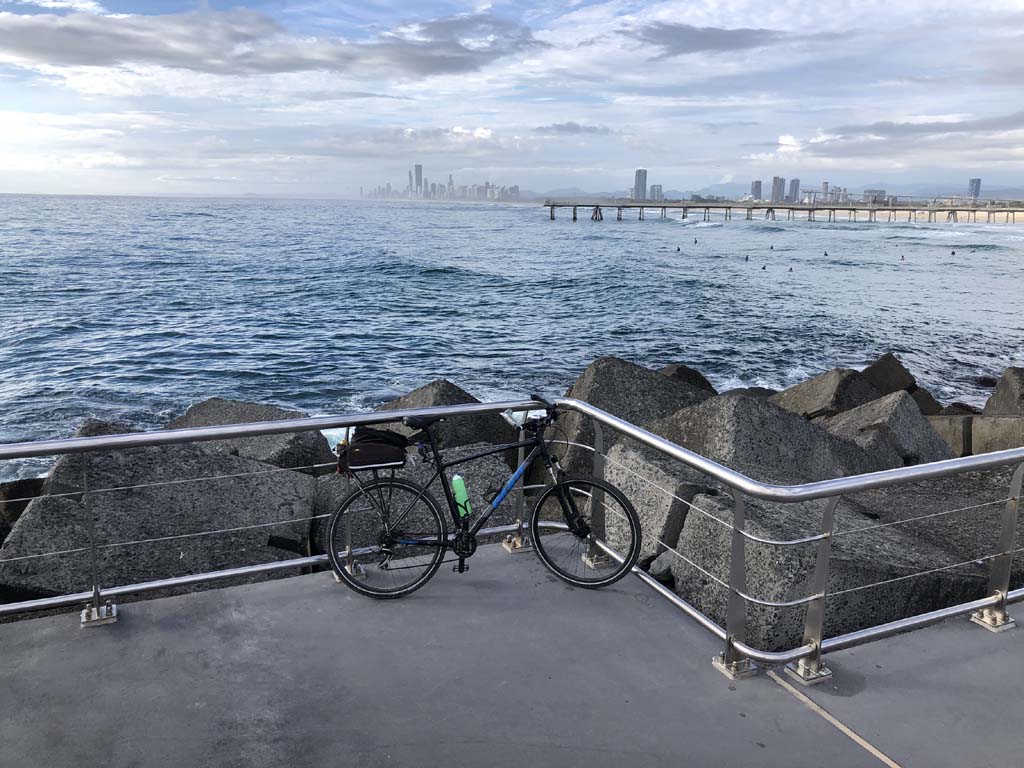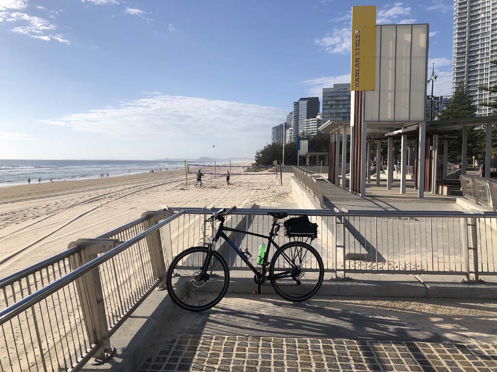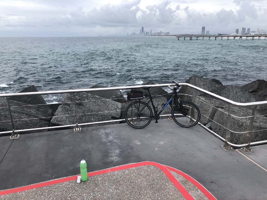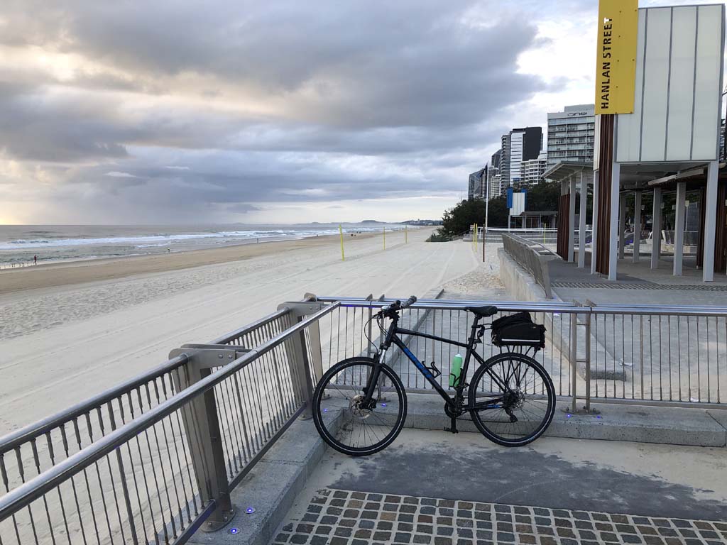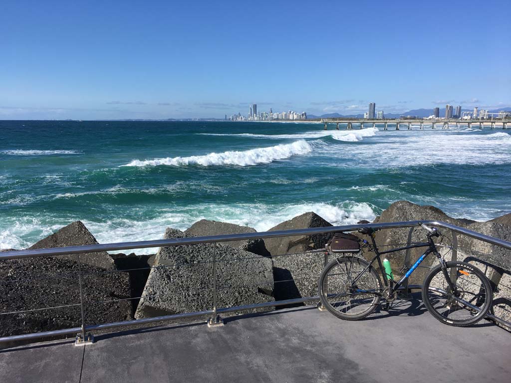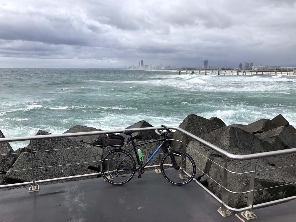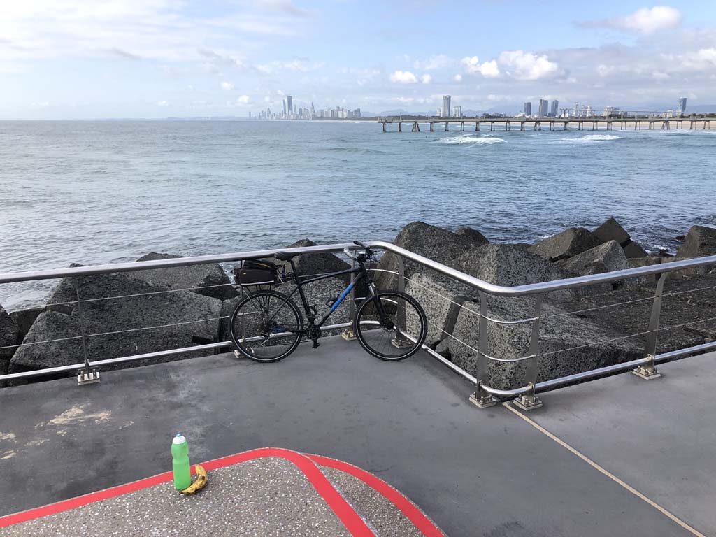 Home to Turnaround Pt down to Surfers via GC600 Park to Surfers to The Spit (both ends - twice) then back through GC600 Park back to Cafe Rockpool and finally back Home about 50+kms.