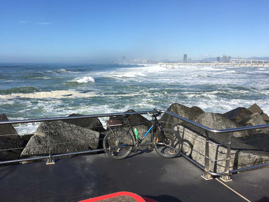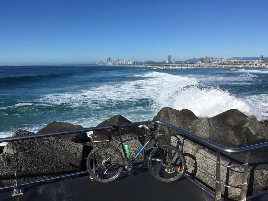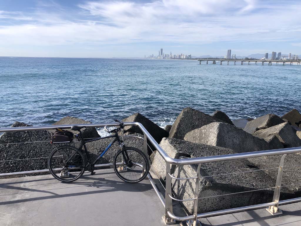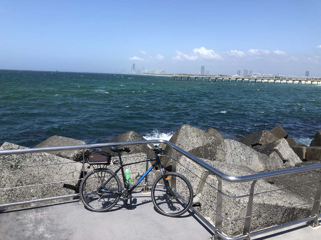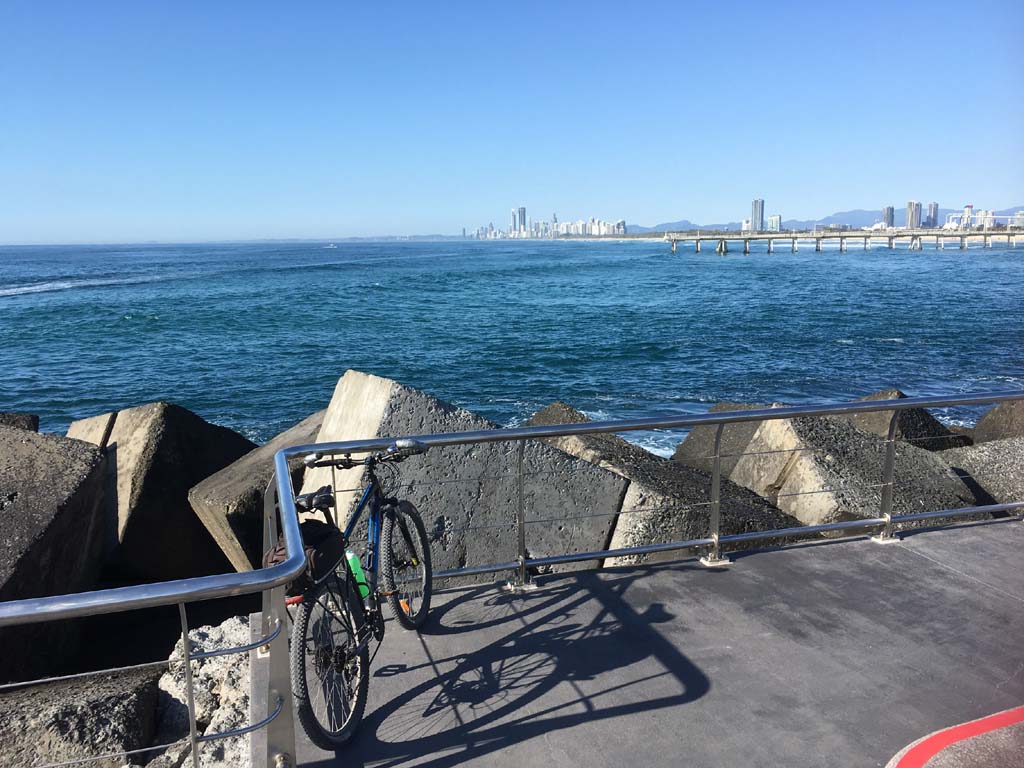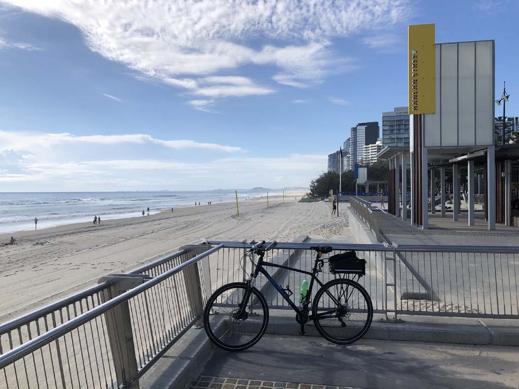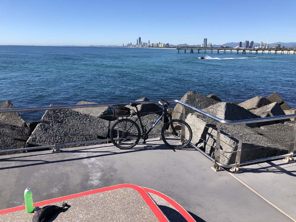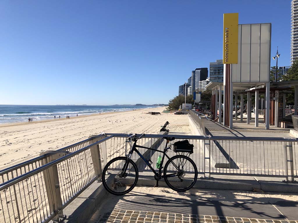Home to Turnaround Pt down to Surfers via GC600 Park to Surfers to The Spit (both ends - twice) then back through GC600 Park back to Cafe Rockpool and finally back Home about 50+kms.