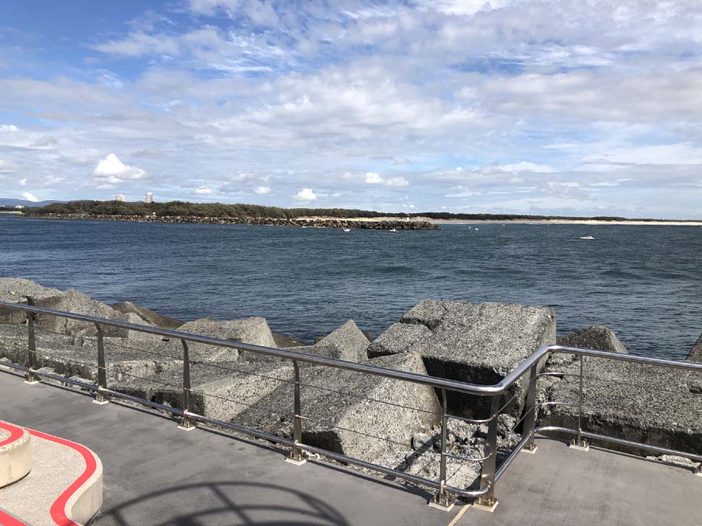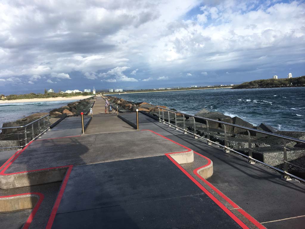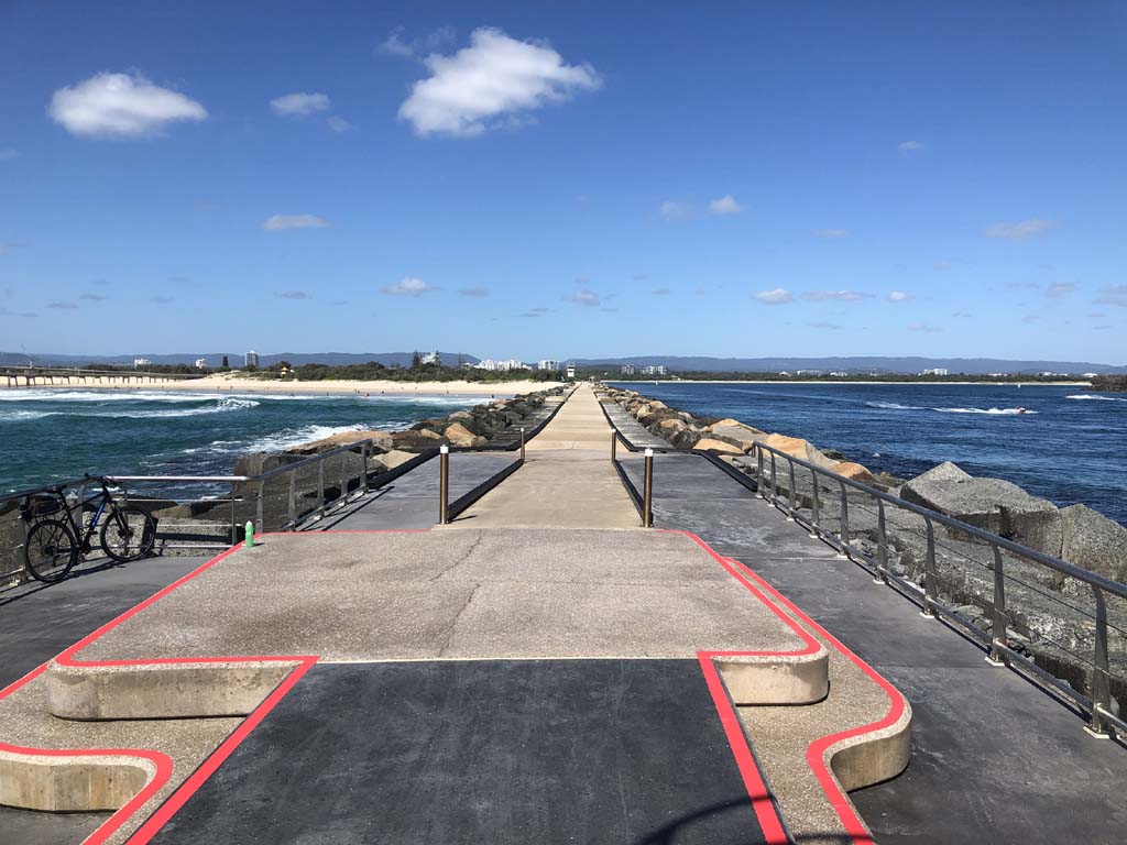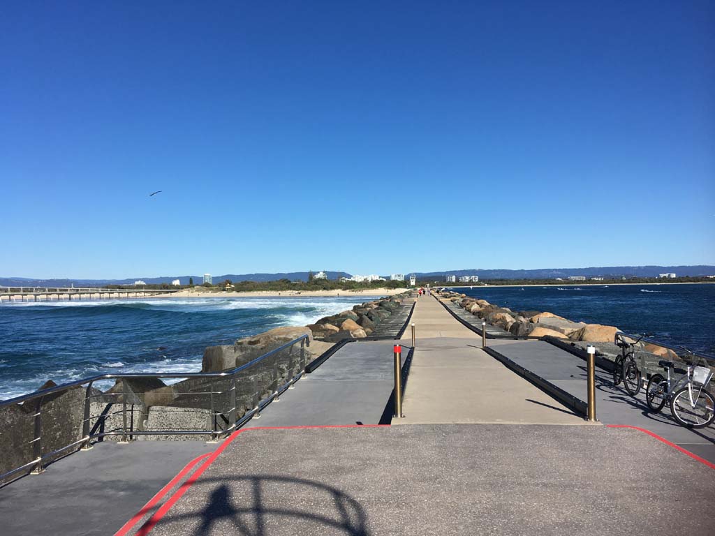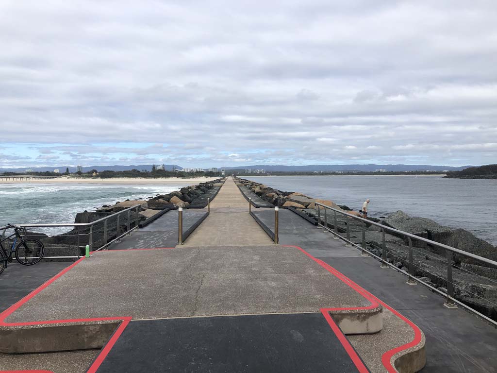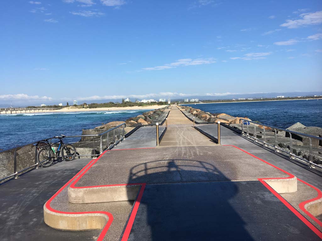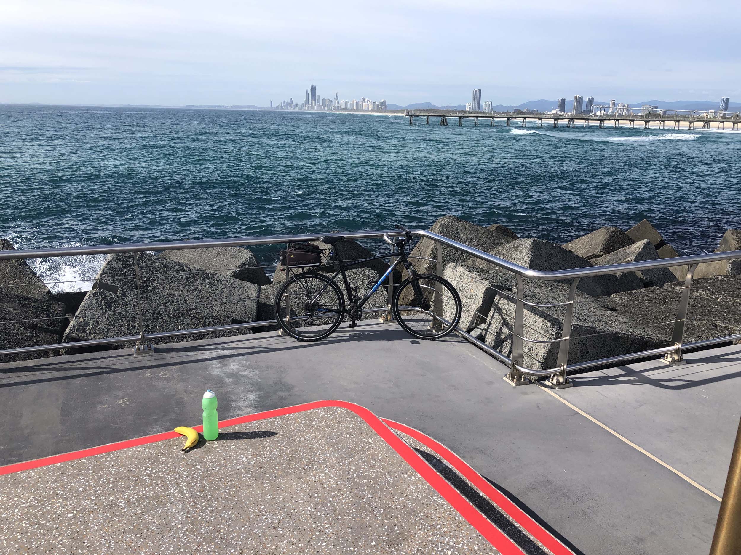 I continued to the Seaway via the Federation Walk. Rode to the tip of the Moondarewa Spit, then out to the tip of the Seawall/Spit. I noticed the Seaworld Resue boat motoring in the mouth of the Seaway but didn't appear to be doing anything. Noone was in the water etc. Then rode back to the tip of the Moondarewa Spit then back to the tip of the Seawall/Spit. Took a few photos at the end of both Spits, sat and ate my banana.