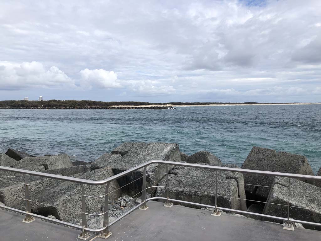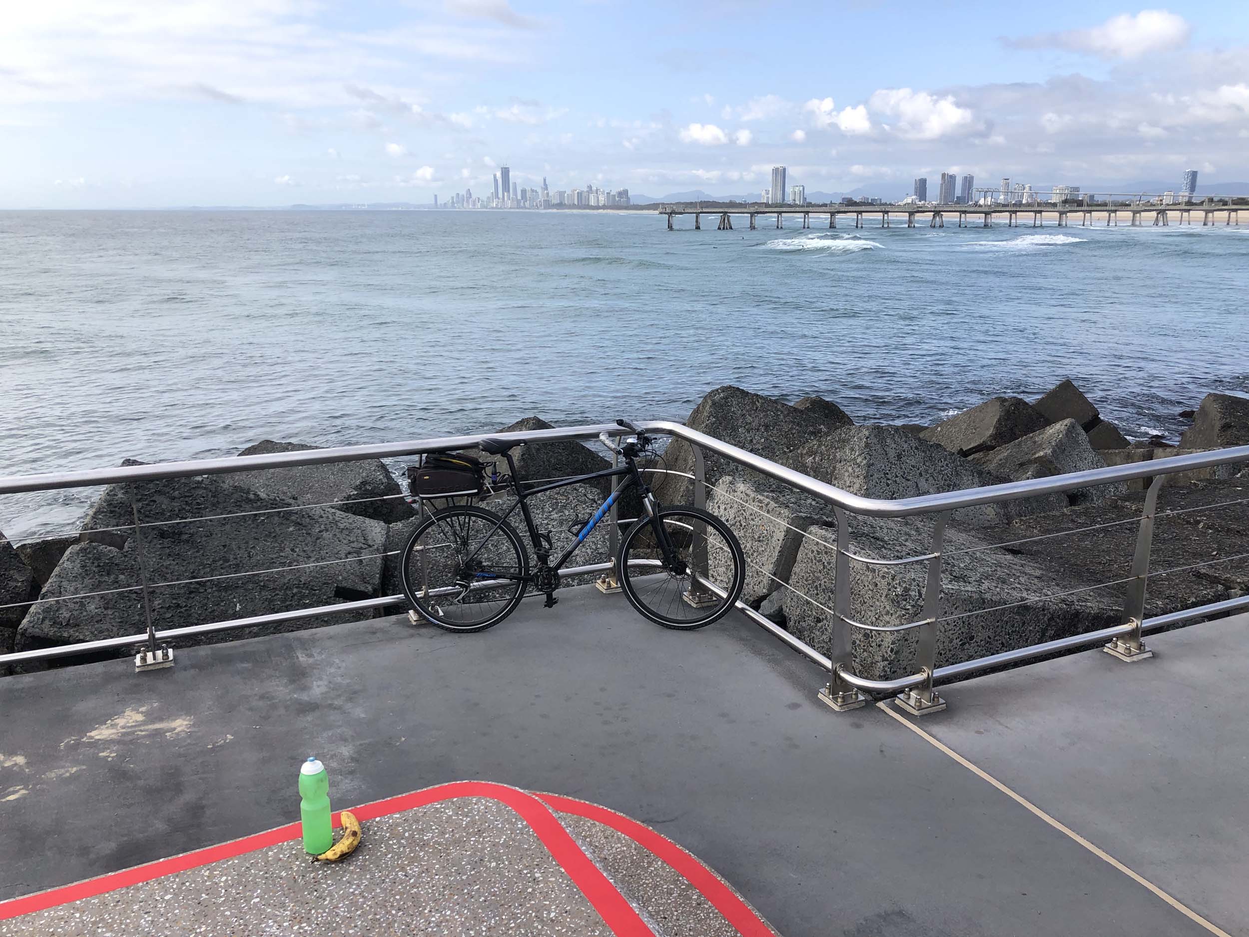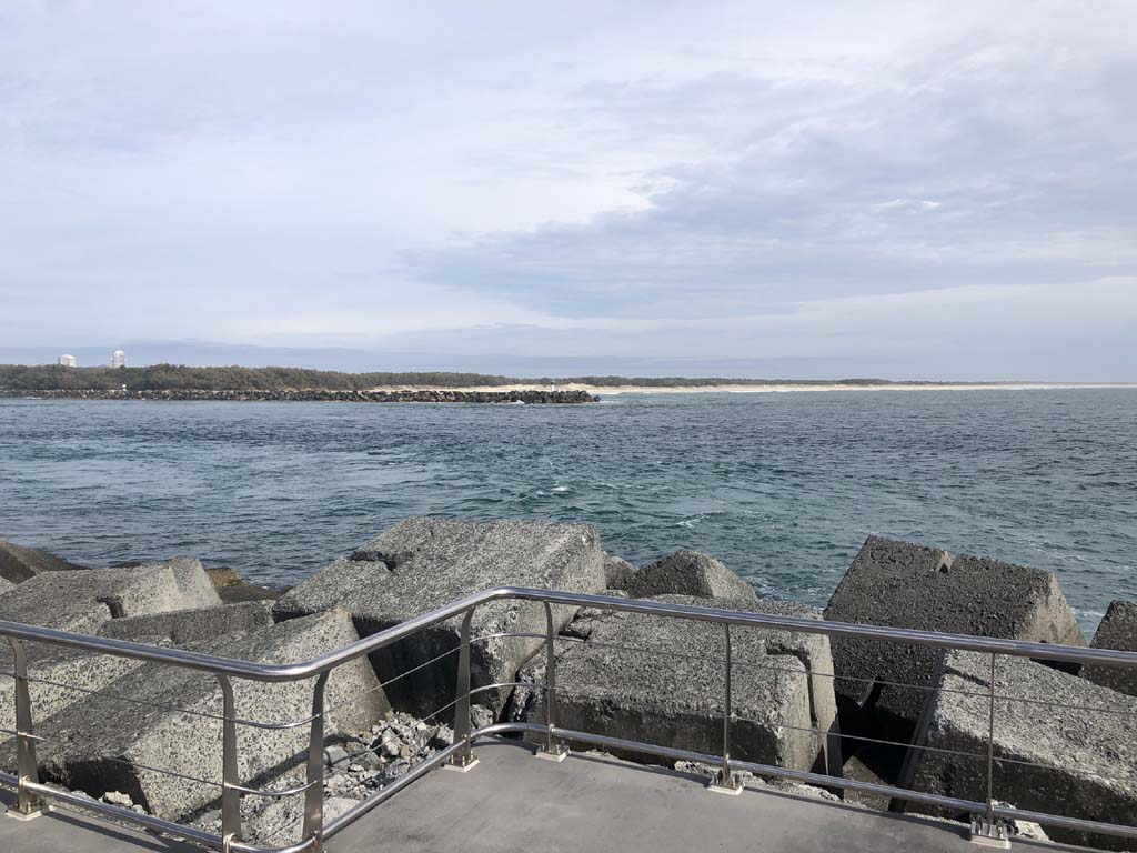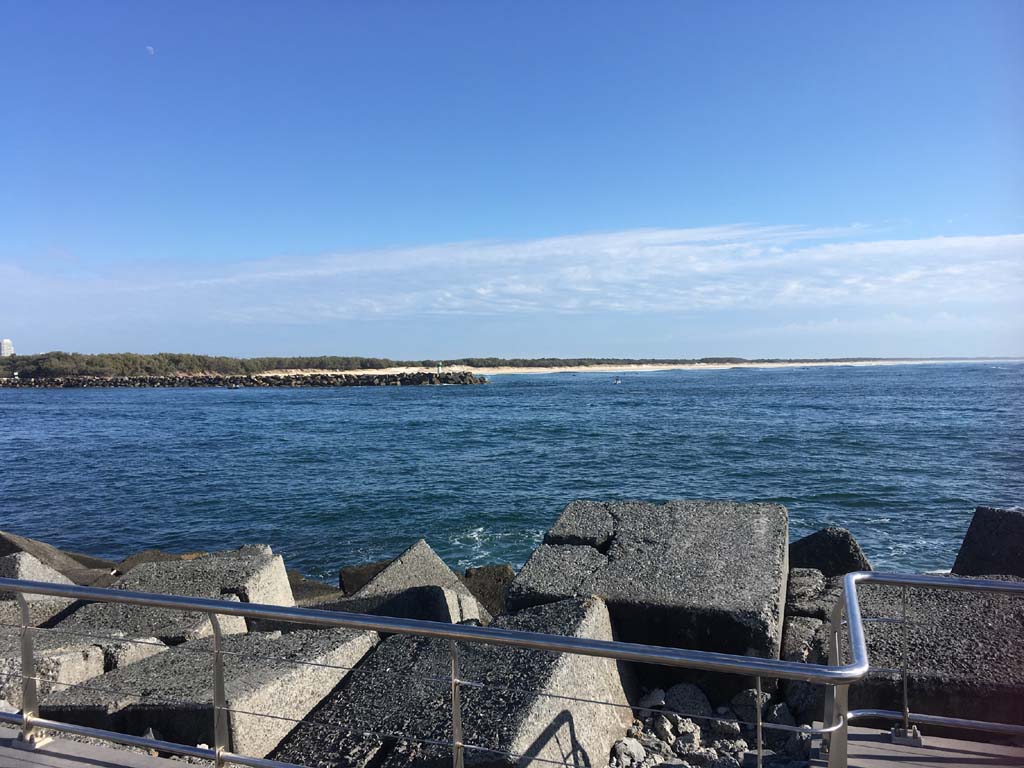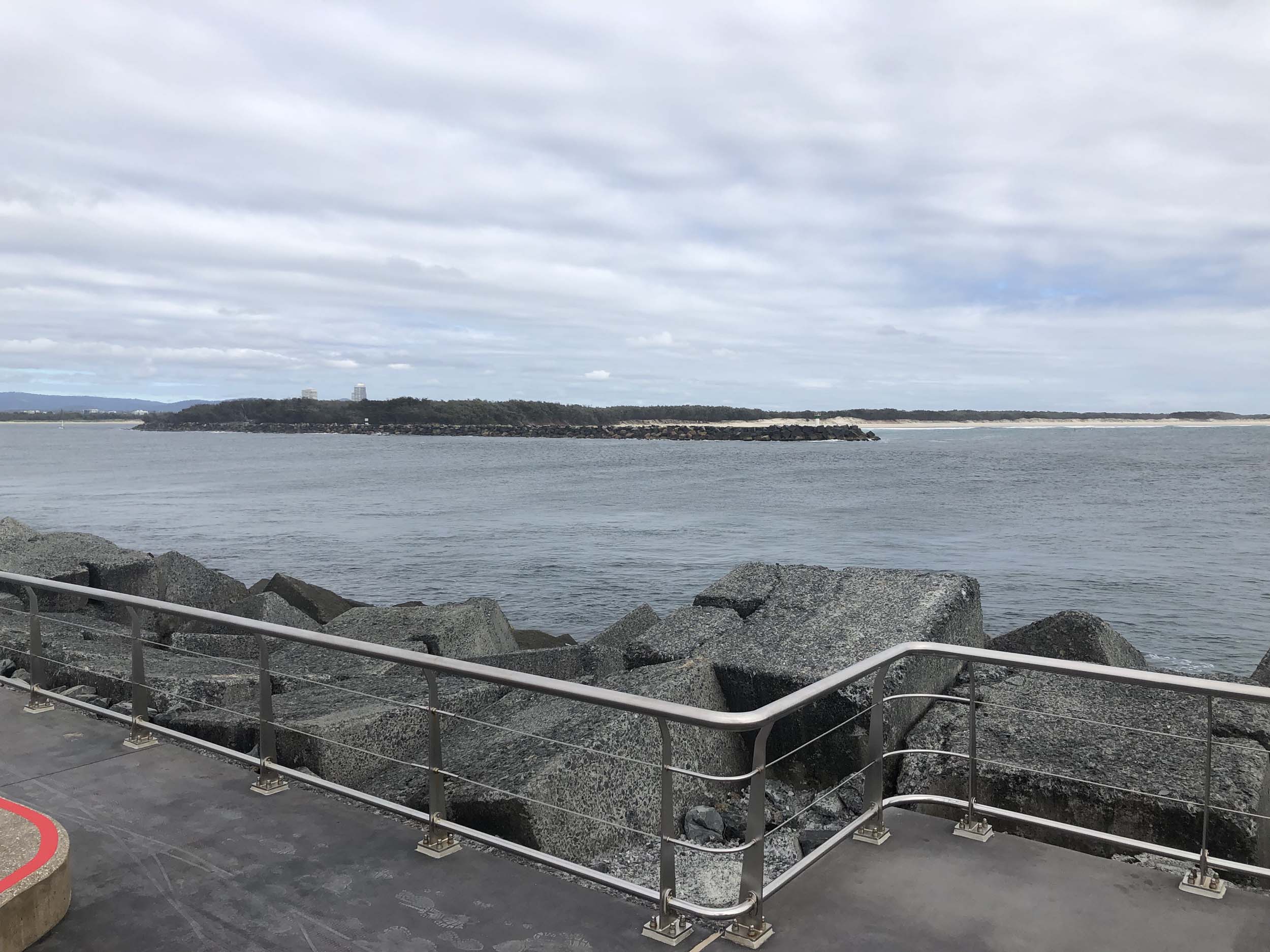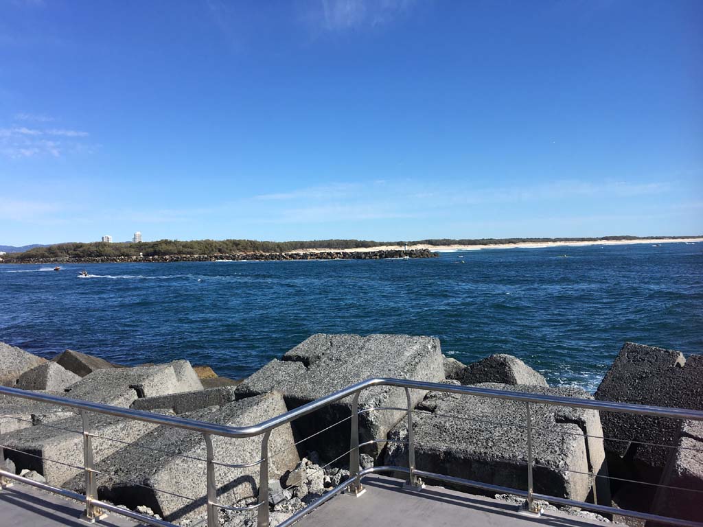 I continued to the Seaway via the Federation Walk. Rode to the tip of the Moondarewa Spit, then out to the tip of the Seawall/Spit. I noticed the Seaworld Resue boat motoring in the mouth of the Seaway but didn't appear to be doing anything. Noone was in the water etc. Then rode back to the tip of the Moondarewa Spit then back to the tip of the Seawall/Spit. Took a few photos at the end of both Spits, sat and ate my banana.